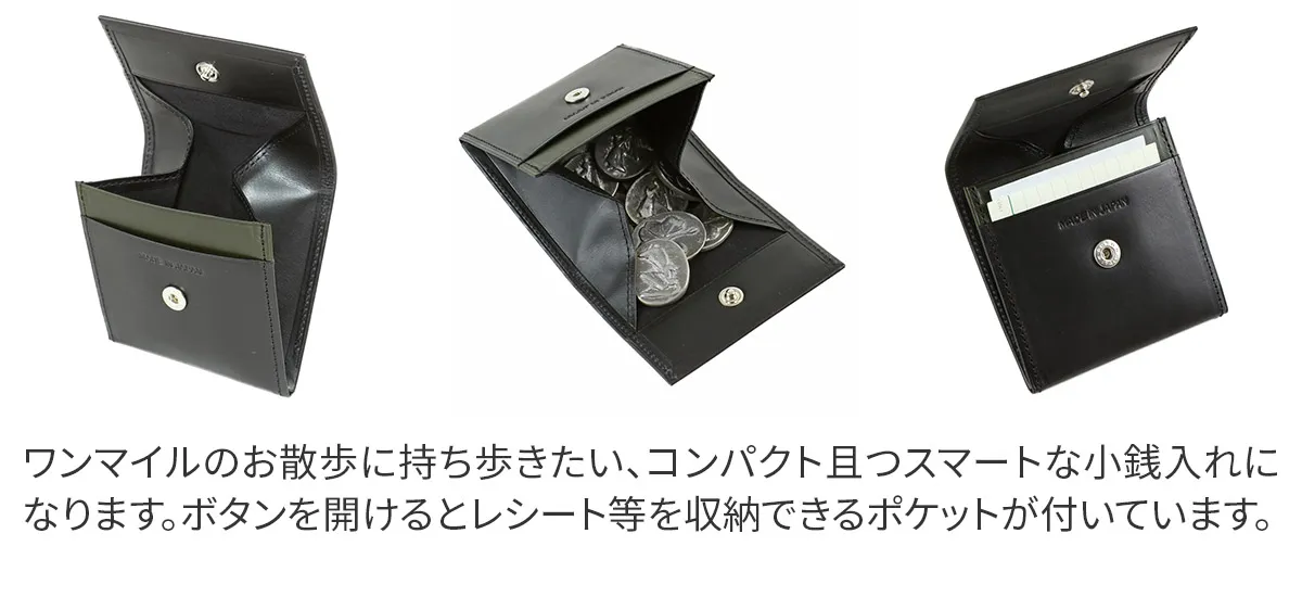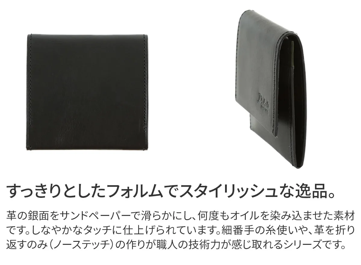 革の銀面をサンドペーパーで滑らかにし、何度もオイルを染み込ませることでしなやかなタッチに仕上げられています。 細番手の糸使いや、革を折り返すのみ(ノーステッチ)のつくりが職人さんの丁寧さと技術力が感じ取れるシリーズです。 手のひらサイズなのでポケットに入れても邪魔にならず、ワンマイルのお出かけに持ち歩きたい小銭入れです。 洗練されたシンプルなデザインで、贈り物にもお勧めのアイテムとなっております。