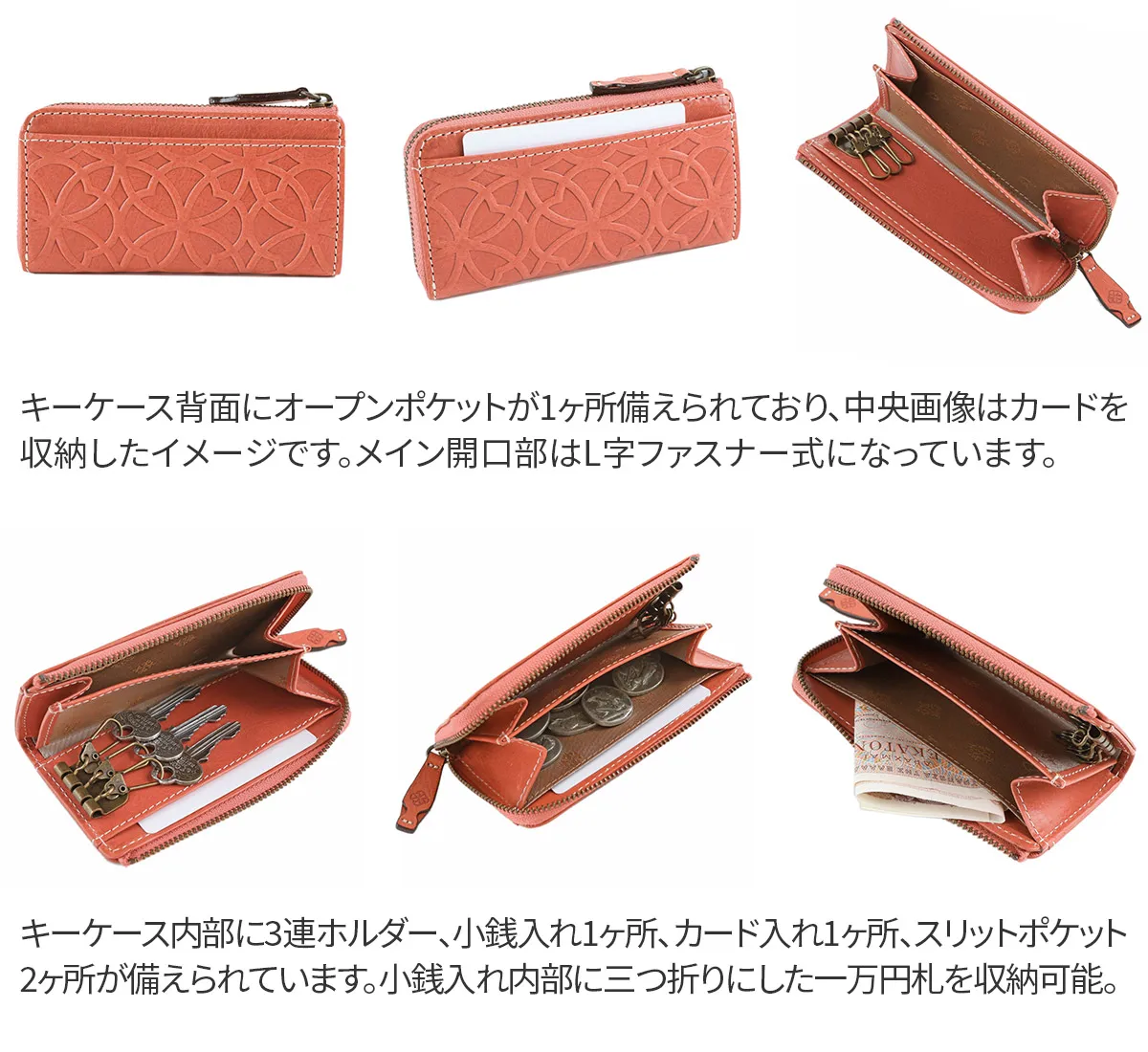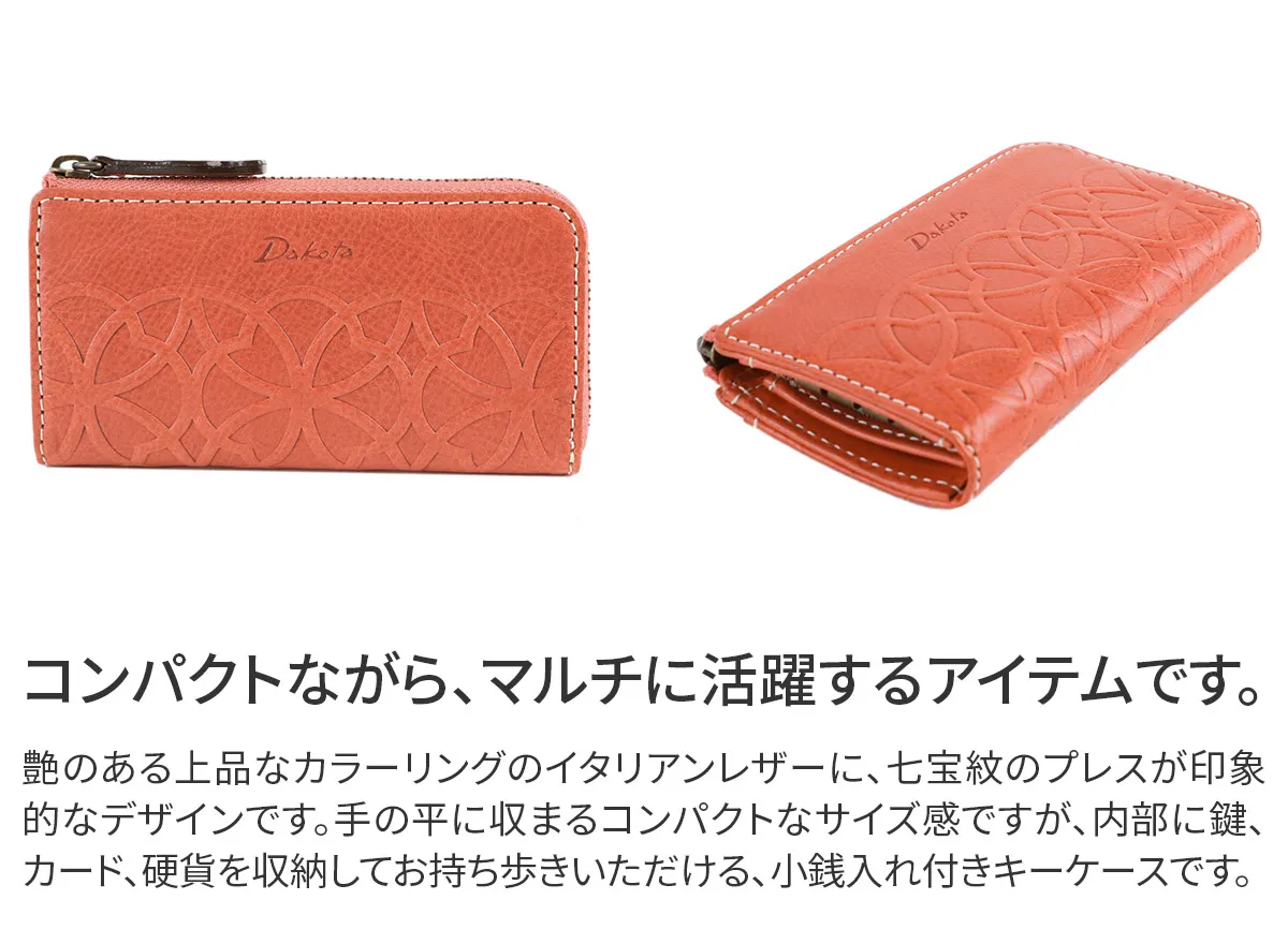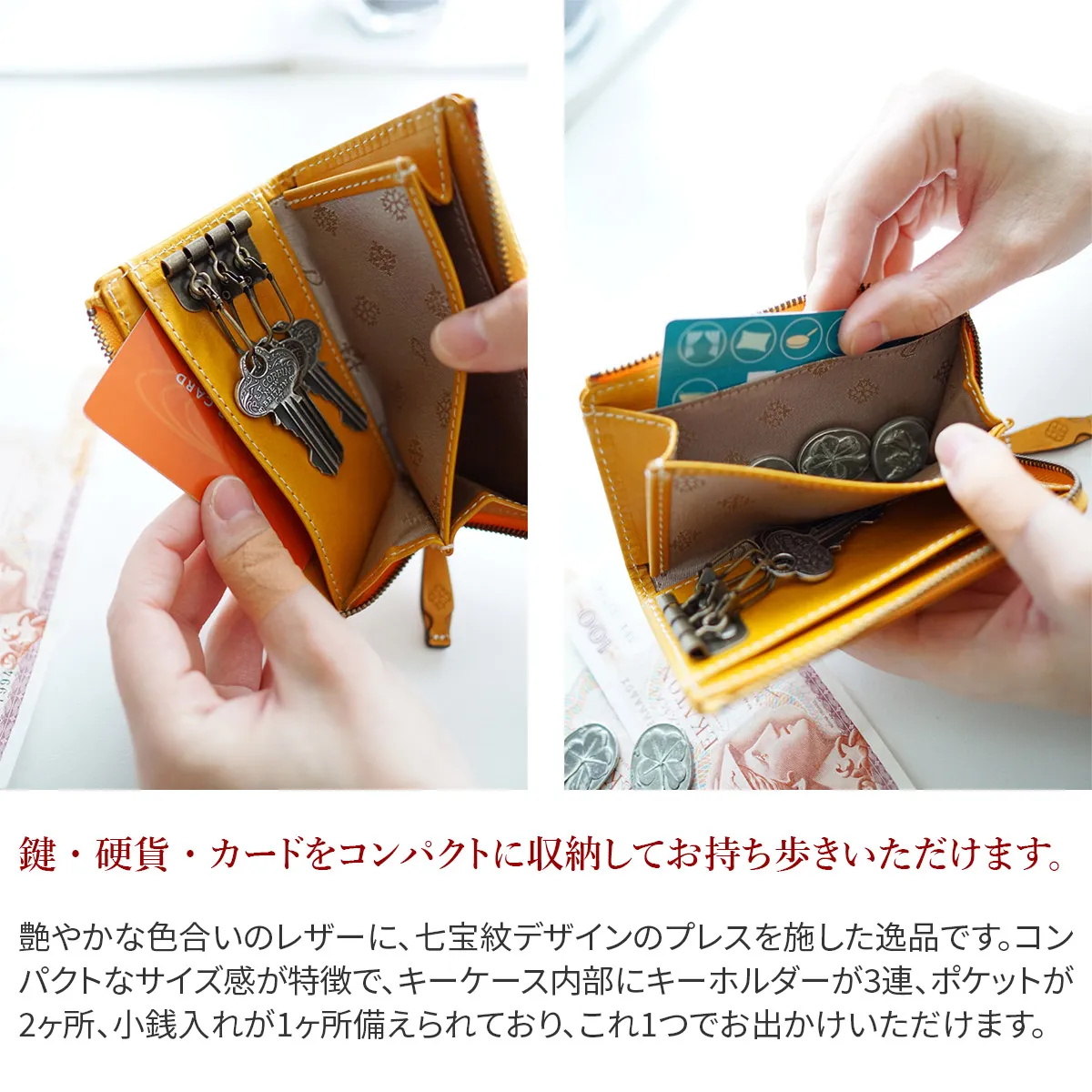 七宝紋と呼ばれる丸柄に花柄を組み合わせた優しい柄ゆきのお財布です。 イタリアンレザーを使用しているのでプレスの焼けが味となり、雰囲気のある仕上がりになっています。七宝紋は円満や調和への願いが込められた縁起の良い柄です。 艶やかな色合いのレザーに、七宝紋デザインのプレスを施した逸品です。コンパクトなサイズ感が特徴で、キーケース内部にキーホルダーが3連、ポケットが2ヶ所、小銭入れが1ヶ所備えられており、これ1つでお出かけいただけます。