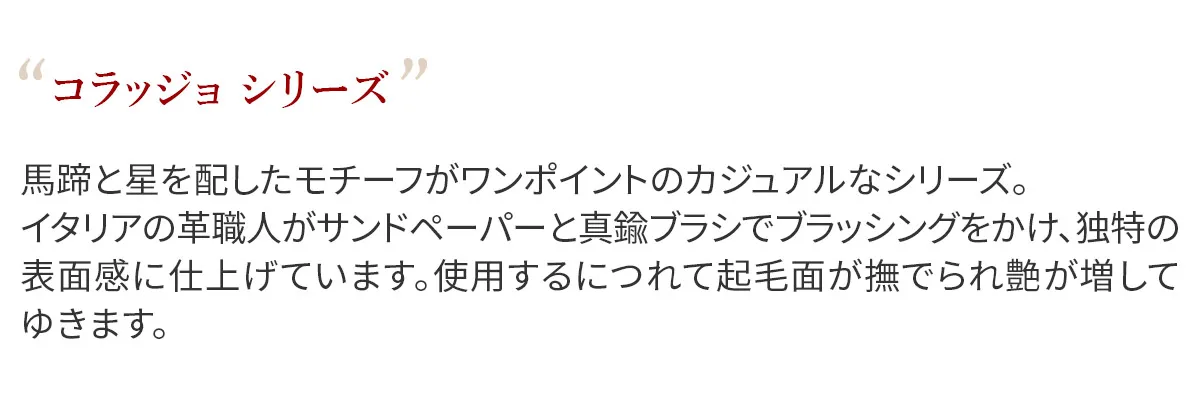 馬蹄と星を配したモチーフがワンポイントのカジュアルなシリーズ。イタリアの革職人がサンドペーパーと真鍮ブラシでブラッシングをかけ、独特の表面感に仕上げています。使用するにつれて起毛面が撫でられ艶が増してゆきます。 オープンポケットにより、カードキーなども収納可能。スナップボタンを開くと、ホルダーが4つ備わっています。L字ファスナーポケットにはスマートキーが入ります。また、小銭入れとしてなど様々な用途でお使いいただけます。深みのあるカラーリングで男女問わずお使いいただけるデザインです。