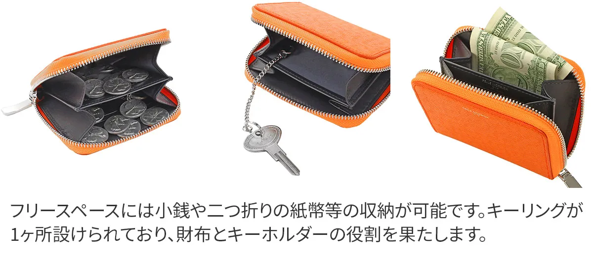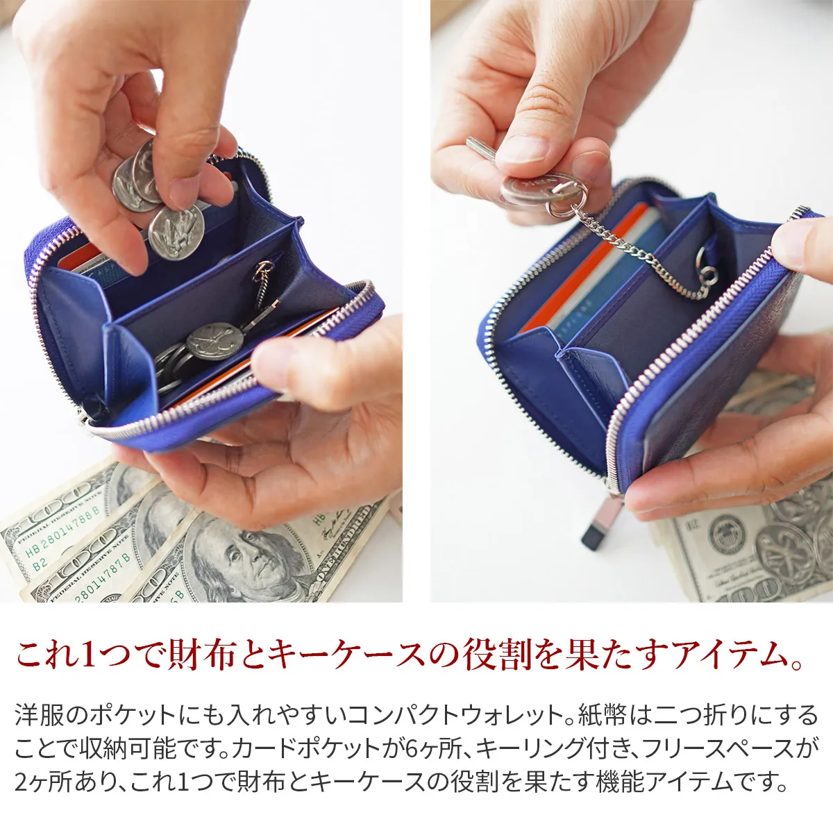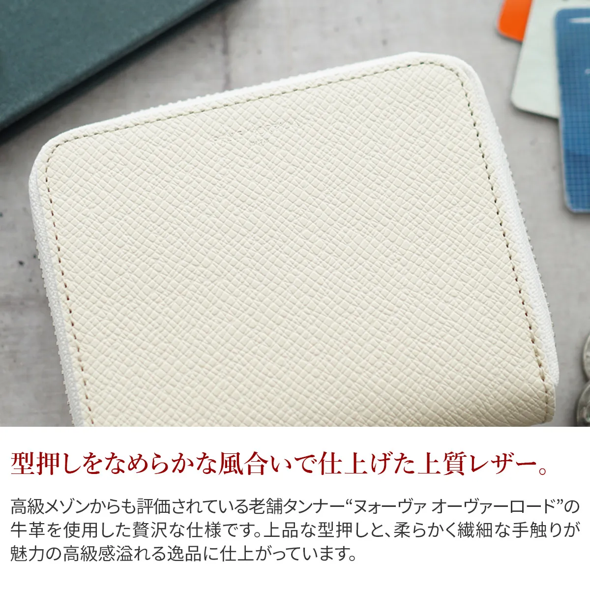洋服のポケットにも入れやすいコンパクトウォレット。紙幣は二つ折りにすることで収納可能です。カードポケットが6ヶ所、キーリング付き、フリースペースが 2ヶ所あり、これ1つで財布とキーケースの役割を果たす機能アイテムです。 高級メゾンからも評価されている老舗タンナー“ヌォーヴァ オーヴァーロード”の牛革を使用した贅沢な仕様です。上品な型押しと、柔らかく繊細な手触りが魅力の高級感溢れる逸品に仕上がっています。
