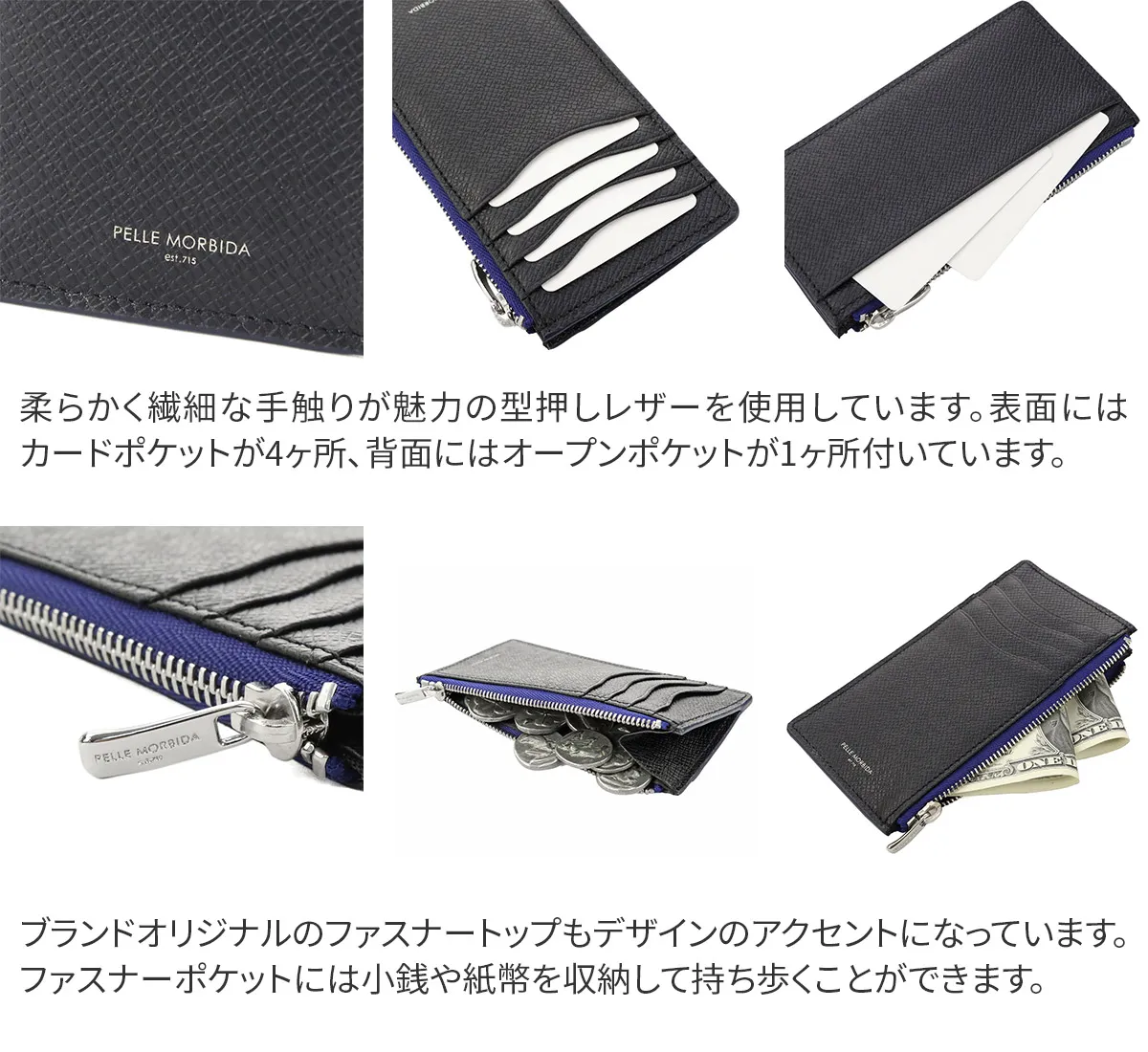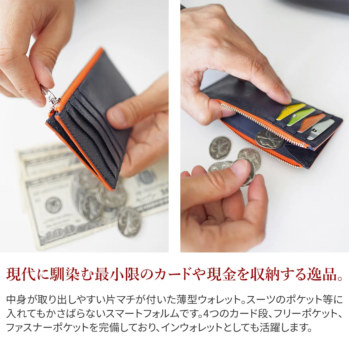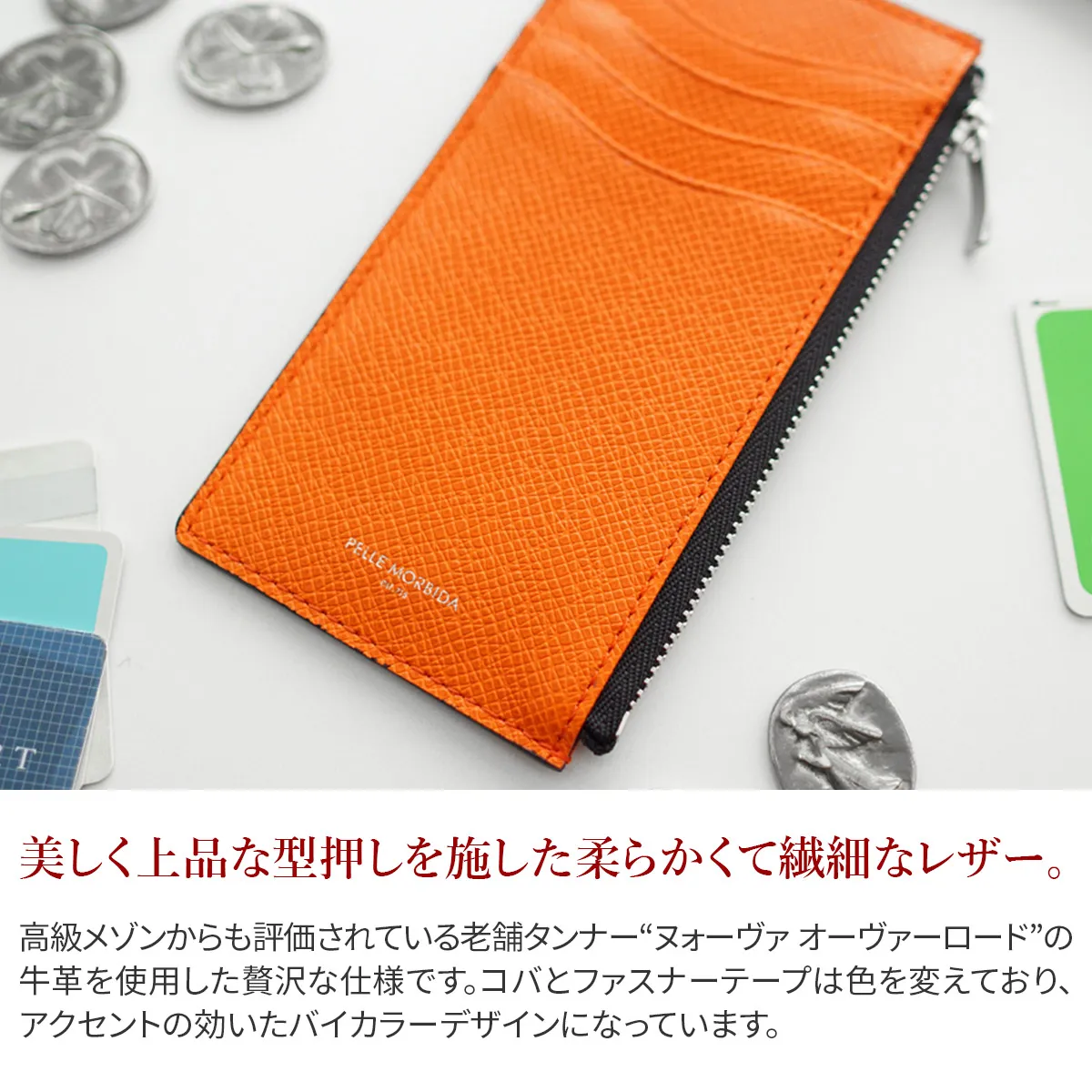 中身が取り出しやすい片マチが付いた薄型ウォレット。スーツのポケット等に入れてもかさばらないスマートフォルムです。4つのカード段、フリーポケット、ファスナーポケットを完備しており、インウォレットとしても活躍します。 高級メゾンからも評価されている老舗タンナー“ヌォーヴァ オーヴァーロード”の牛革を使用した贅沢な仕様です。コバとファスナーテープは色を変えており、アクセントの効いたバイカラーデザインになっています。