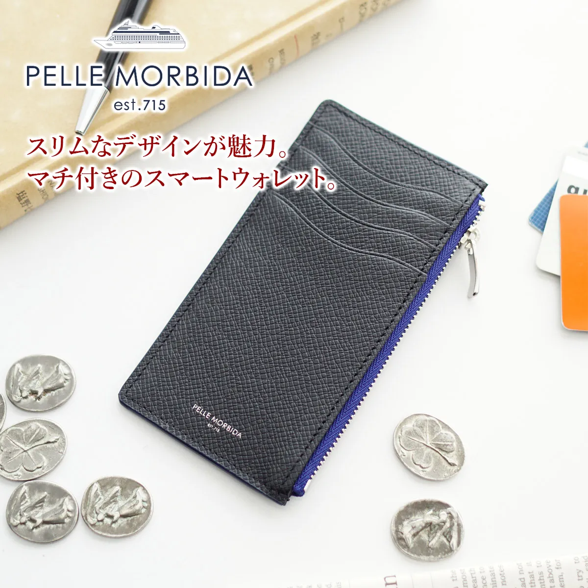 PELLE MORBIDA(ペッレ モルビダ) Barca バルカ エンボスレザー (オーヴァーロード) ミニ財布(インウォレット) PMO-BA324 上質なレザーが際立つ、機能的なミニマルウォレット。
