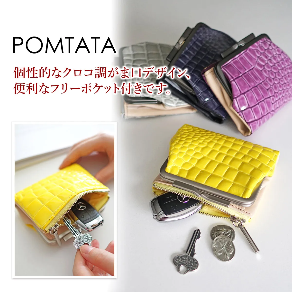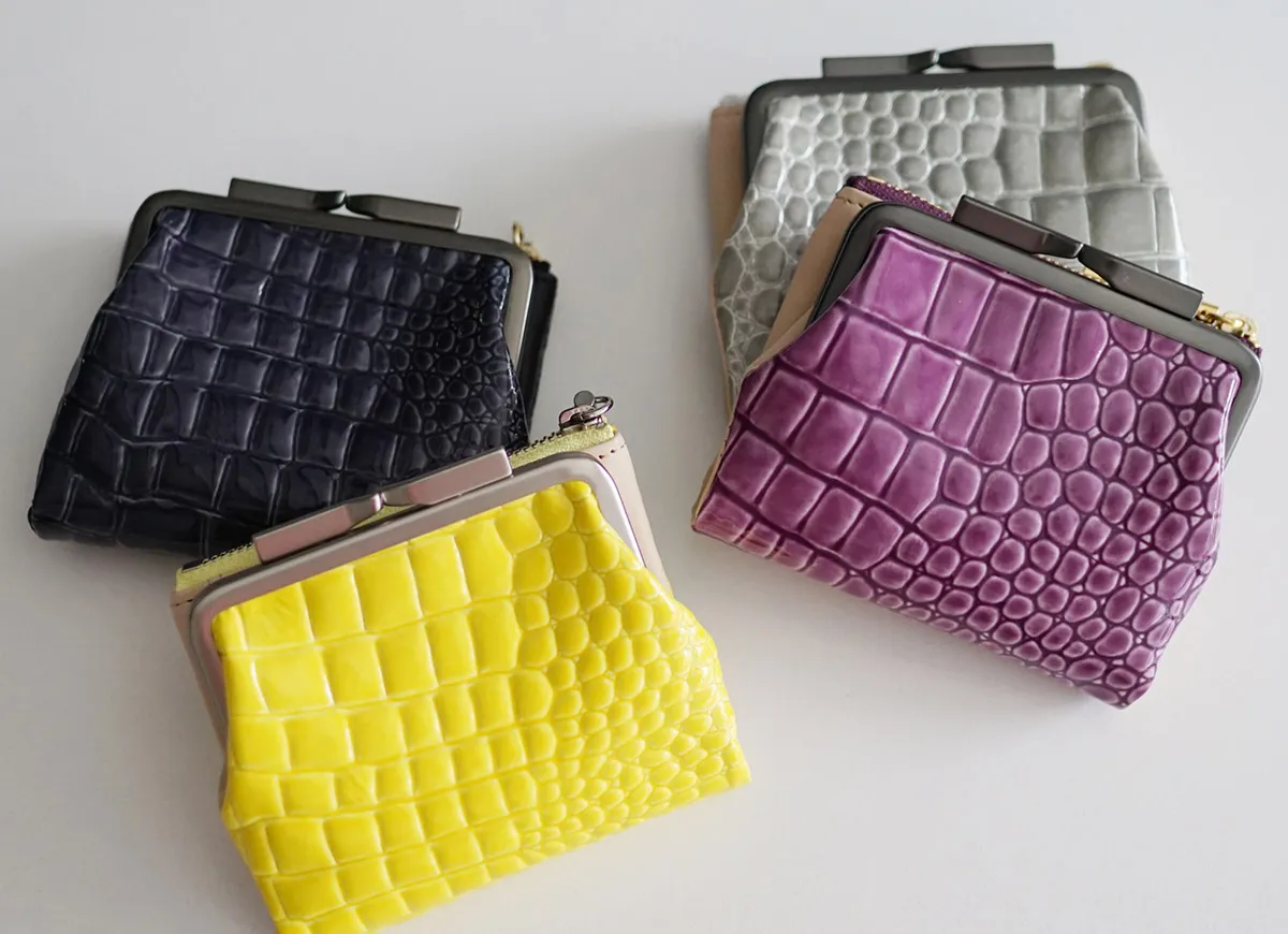 クロコ調型押しにエナメル加工を施した、存在感のあるデザインが魅力です。独立した小銭入れやフリーポケットが付いており、メイン開口部を開くとカードを一目で確認できます。使い勝手が良く持ち運びにも便利なサイズ感の良いアイテムです。