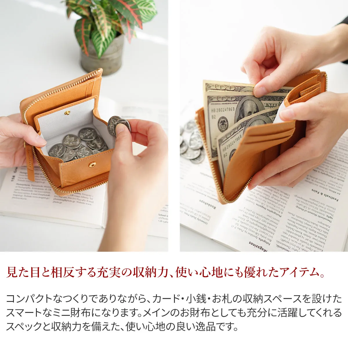 小銭入れ付きのミニ財布です。L字ファスナー開閉で、中身をたくさん収納してもスマートなフォルムを維持します。上質なレザーで、素材の経年変化を存分にお楽しみ頂けます。 素材は、イタリアンレザーを使用しています。経年変化が楽しめるのはもちろん透明感があり、落ち着いた印象に見えます。