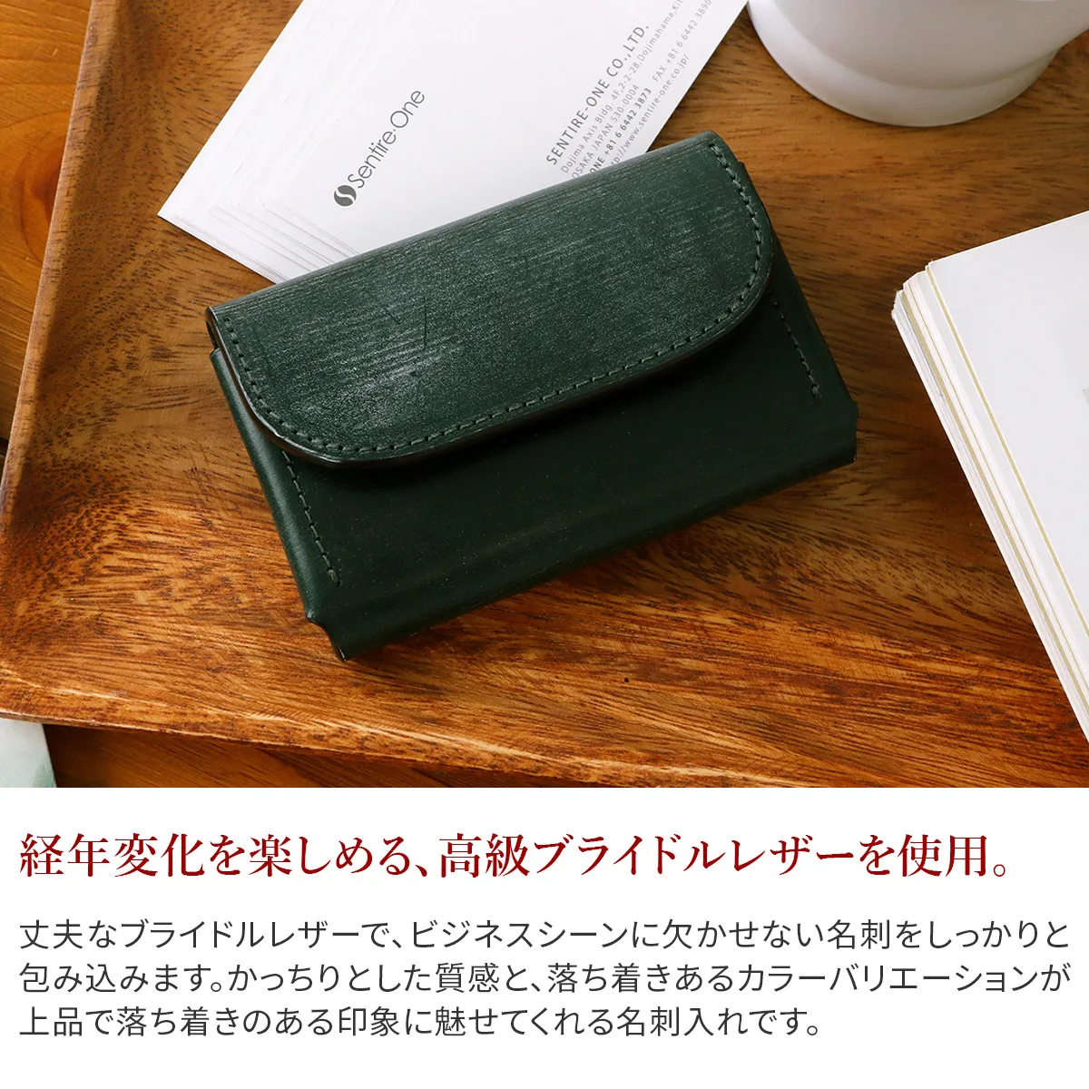素材には、英国の老舗トーマスウェア&サンズ社の高級ブライドルレザーを使用しています。ブライドルは馬具を意味し、そもそもは馬具用のレザーとしてヨーロッパで生まれました。使い込むうちに革の油分と蝋分によって徐々に艶が上がり、色にも深みが増してきます。 重厚感を感じる上質なブライドルレザーの名刺入れです。メイン収納部には、一般的な名刺を約40枚ほど収納可能で頼りがいのあるサイズ感となっています。お使いいただく時間の経過と共に革に艶が増し、経年変化をお楽しみいただけます。上質な革小物なので、ギフトにもお勧めです。