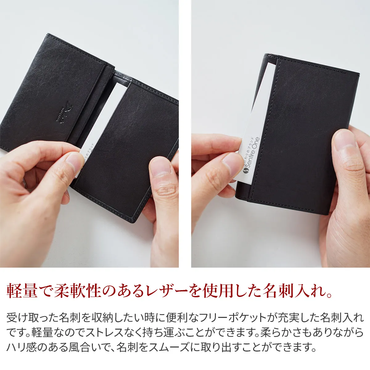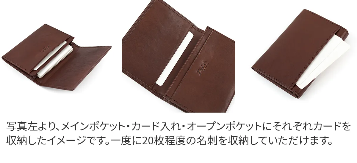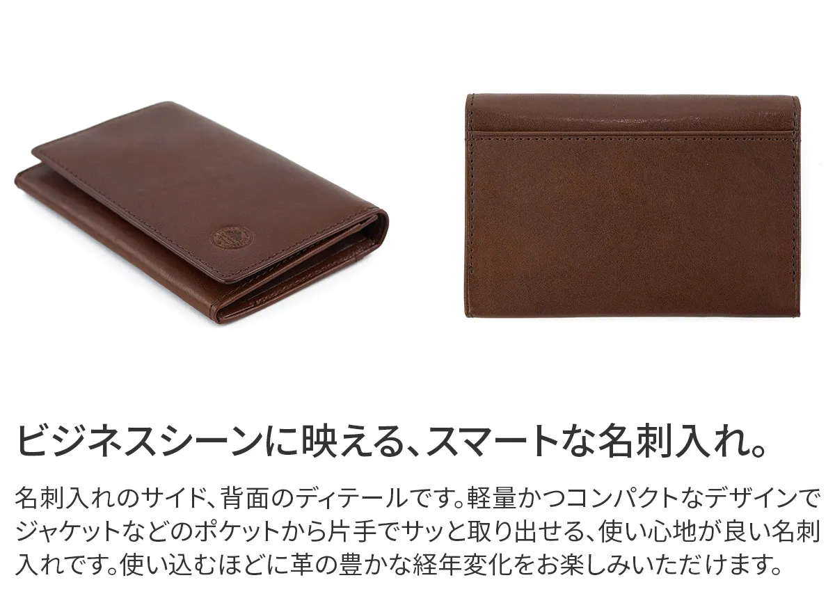 国産原皮による植物タンニン鞣しの革を0.8mmまで漉いた薄くて軽い財布シリーズ。 収納力も兼ね備えており、薄さの追求と併せて日常での扱いやすさに拘りました。使い込むごとに味わいが増し、カーフレザーのようなしなやかさと艶が深まっていきます。 少しアクセント効かせたステッチラインが、シンプルなフォルムを引き立てています。 自分の名刺と相手から受け取った名刺、カード類をコンパクトに収納できる名刺入れです。コンパクトなデザインでビジネスからプライベートまで幅広いシーンでお使いいただけるアイテムです。