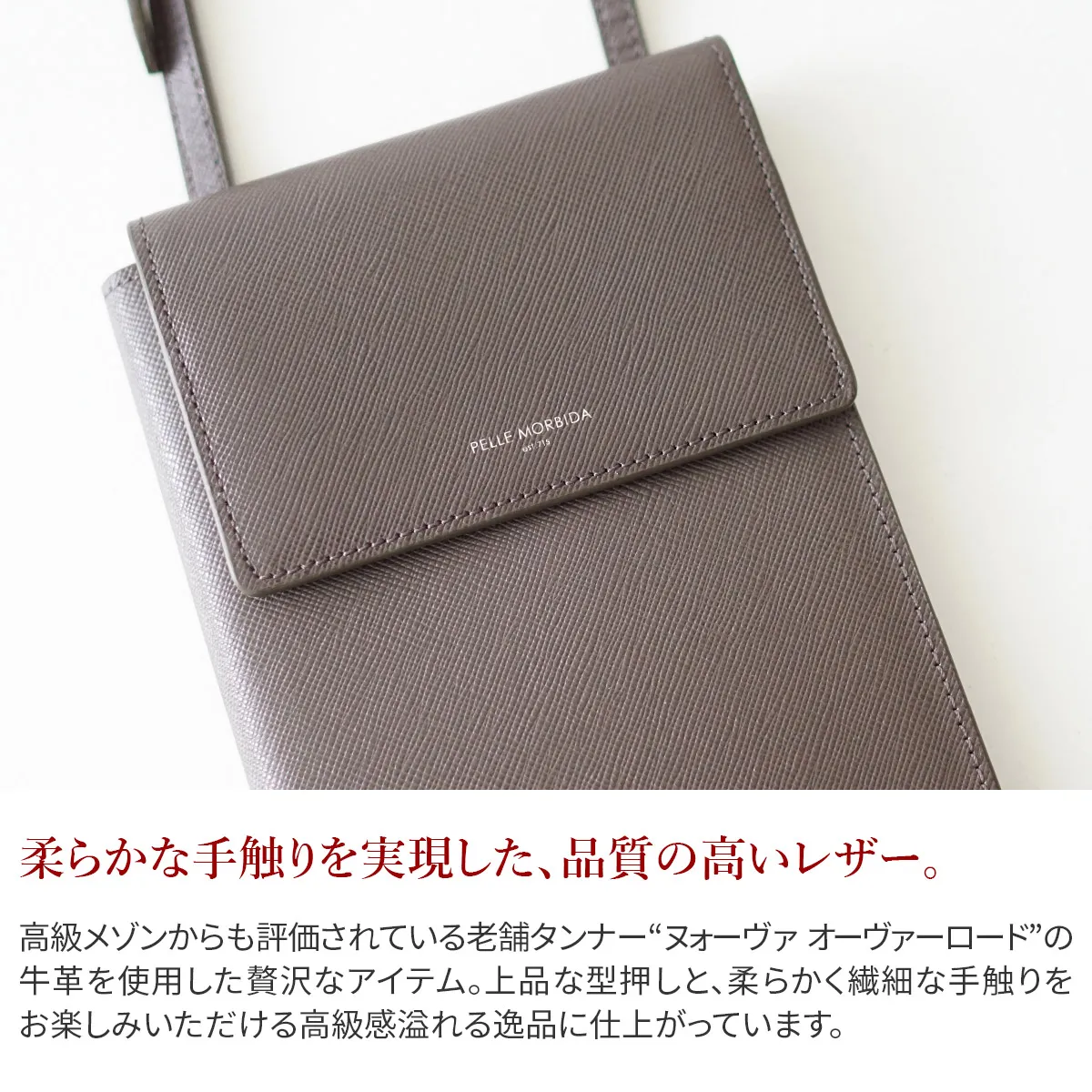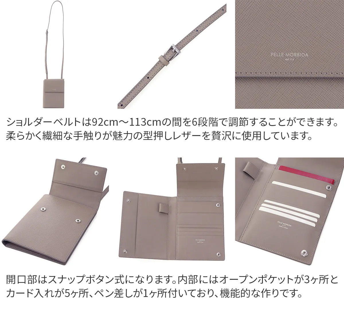 パスポートは勿論、よく使うカード類、チケット、さらにはペンまで収納できる機能美デザイン。首や肩から掛けることで安心して持ち運ぶことができます。見た目もスタイリッシュで、旅行や出張で大活躍するアイテムです。 高級メゾンからも評価されている老舗タンナー“ヌォーヴァ オーヴァーロード”の牛革を使用した贅沢なアイテム。上品な型押しと、柔らかく繊細な手触りをお楽しみいただける高級感溢れる逸品に仕上がっています。