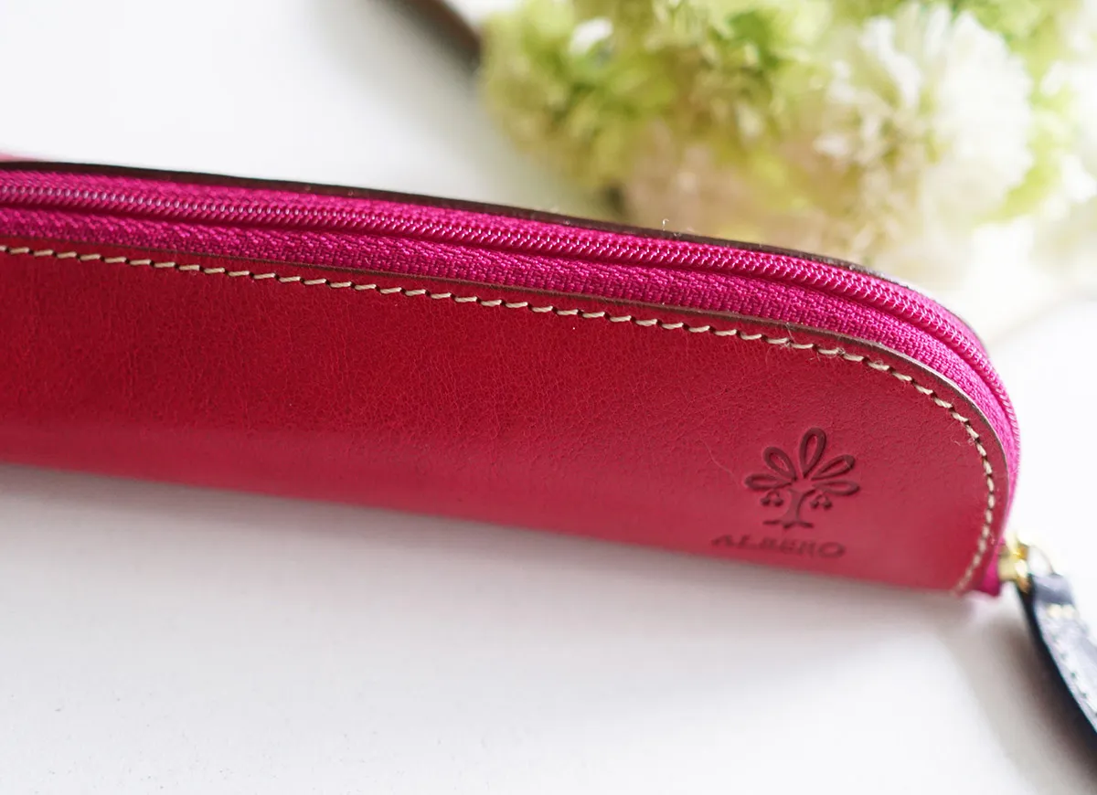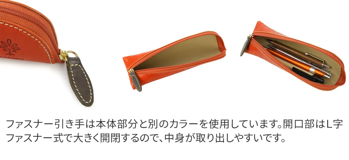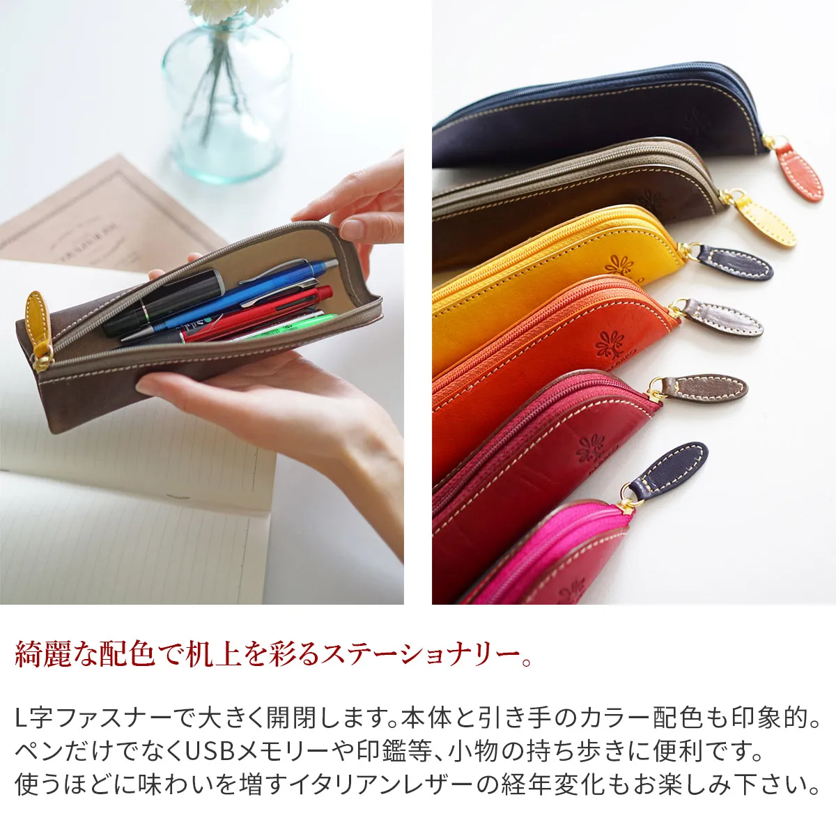 Tamponatoと呼ばれるトスカーナ地方の伝統技法による手染めの革を使用。光沢としわ感が特徴の牛フロント(背中)部分をタンニンで鞣したソフトなヌメ革。 L字ファスナーで大きく開閉します。本体と引き手のカラー配色も印象的。ペンだけでなくUSBメモリーや印鑑等、小物の持ち歩きに便利です。