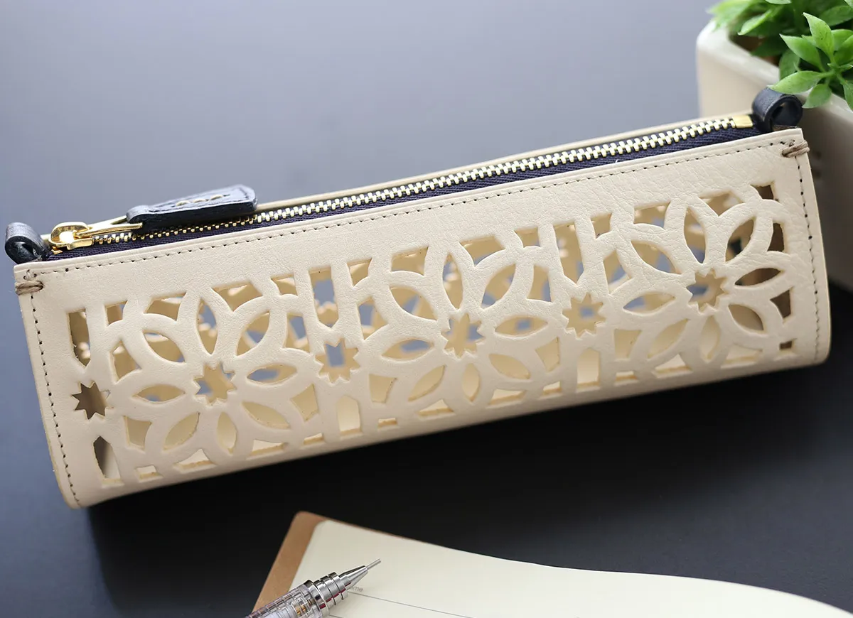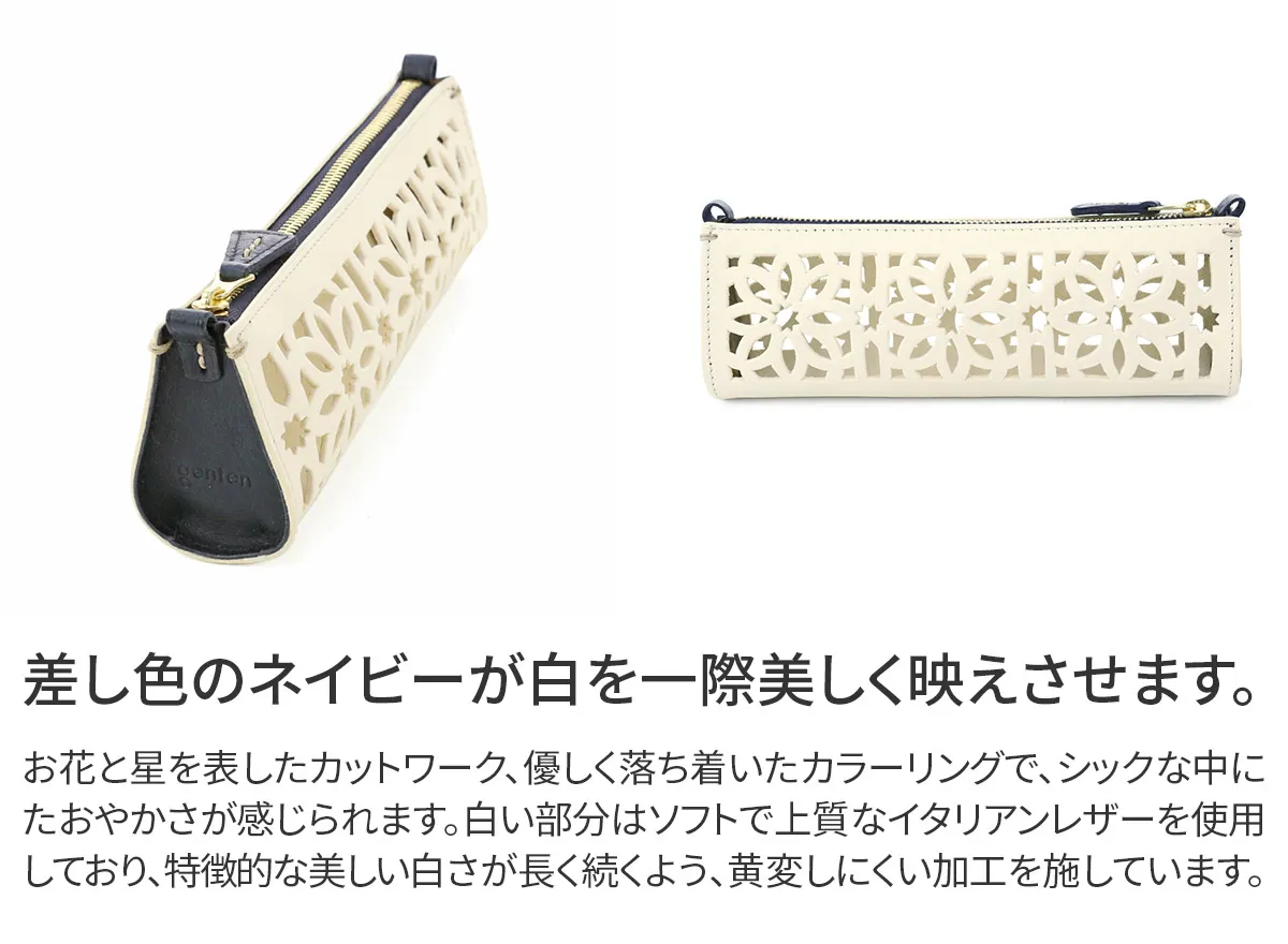 イタリア産のオイルを十分に含んだ牛革を使用したシリーズで、表面に大胆なカットワークがあしらわれています。カットワークのモチーフは、地中海地方沿岸に見られる伝統的な風窓からイメージされており、花と星を表しています。 ボールペンやカラーペン、シャーペン、消しゴムなど十分な収納力。贈り物としてもおすすめの逸品です。白い部分に使用しているのは、ソフトなタッチ感で心地よく手にフィットするイタリア製牛革です。ネイビーの部分には、gentenならではの最高品質の革・ミネルバボックスを使用しています。