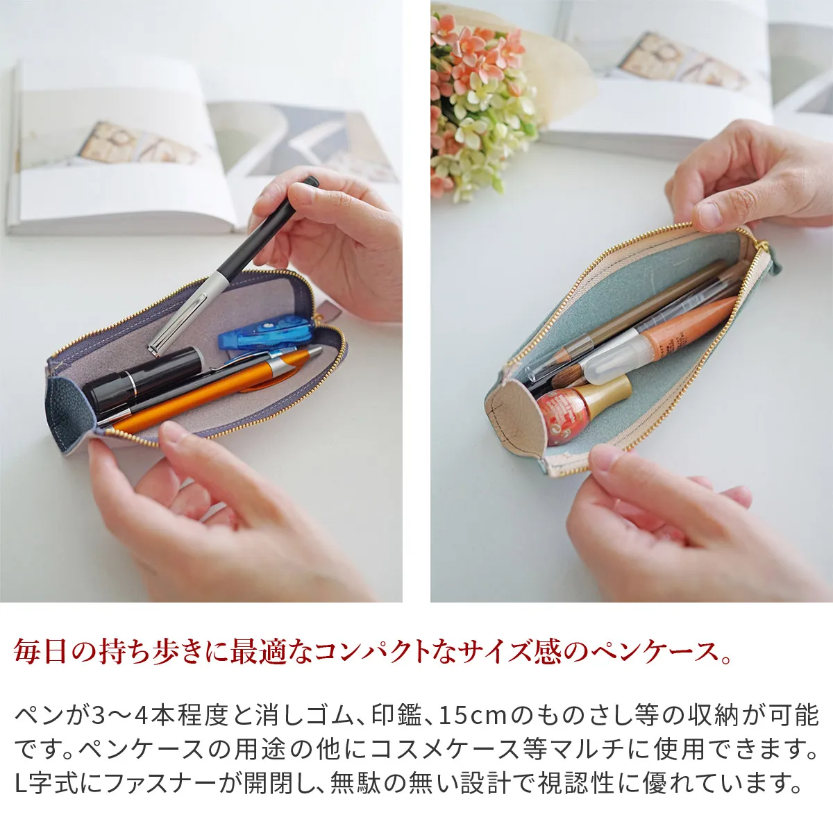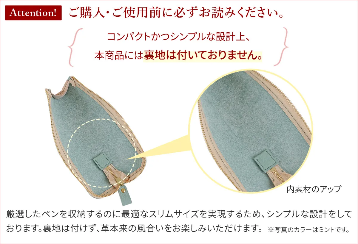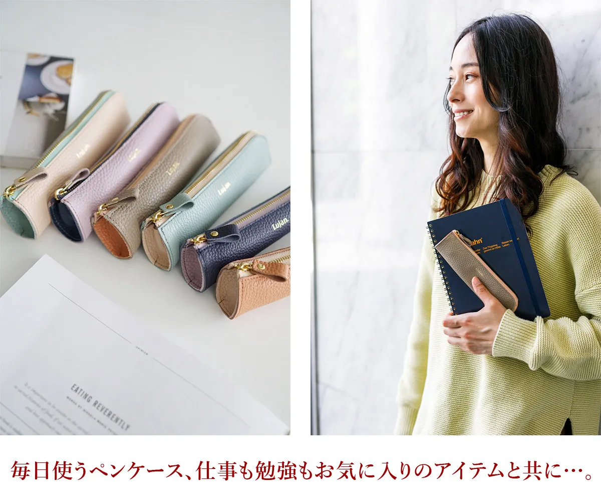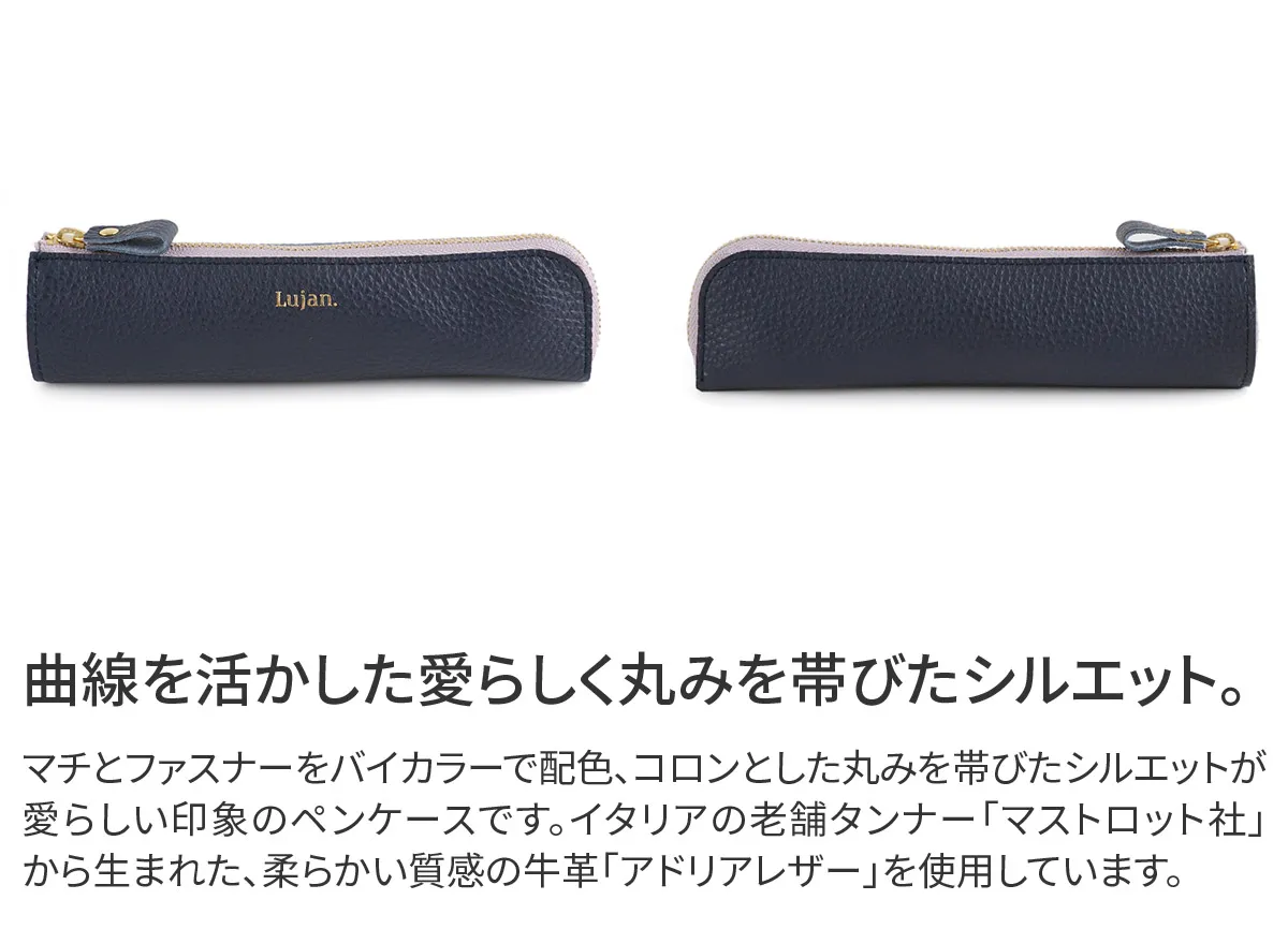 イタリアの老舗タンナー「マストロット社」から生まれた牛革「アドリアレザー」を使用。ふんわりとやわらかな質感で、美しい発色となっています。 2トーンカラーで美しく配色しています。ペンが3~4本程度と消しゴム、印鑑、15cmのものさし等の収納が可能です。ペンケースの用途の他にコスメケース等マルチに使用できます。