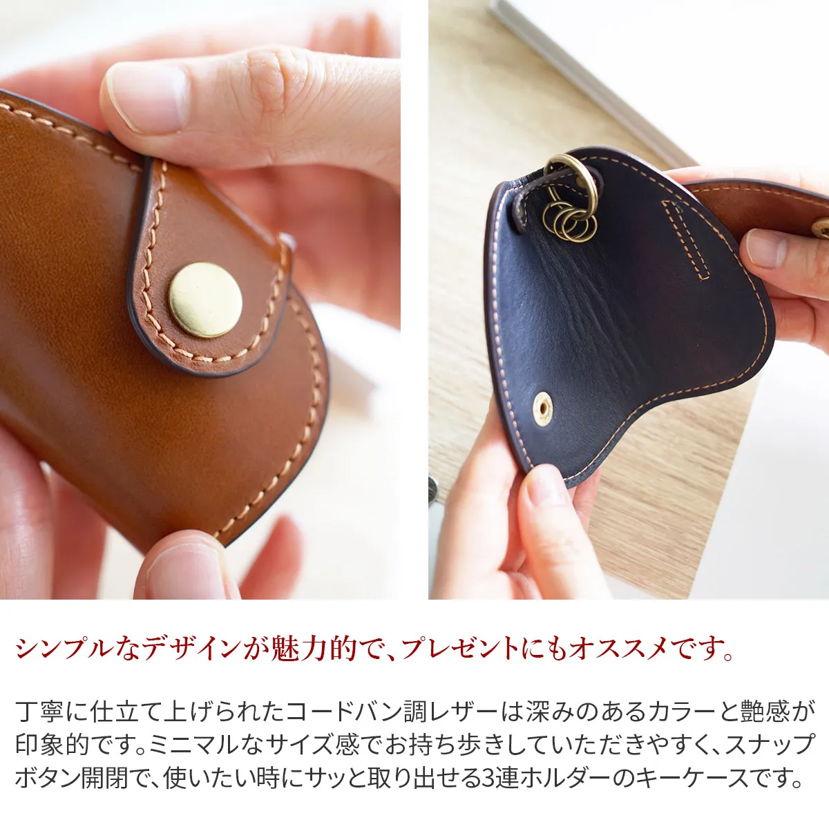 イタリア製牛革ショルダー部分をタンニンで鞣し、コードバン調に仕上げたレザーは透明感があり魅惑的。スリムと使い心地、機能性を追及したNEW LINE。内装には軽さをしなやかさを兼ね備えたナッパレザーを使用。 コンパクトなサイズ感でお持ち歩きしていただきやすく、スナップボタン開閉で、使いたい時にサッと取り出せる3連ホルダーのキーケースです。内部にホルダーが3連備えられており大切な鍵をしっかりと保護する作りで、自分用はもちろん大切な方へのプレゼントにもオススメの逸品です。