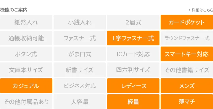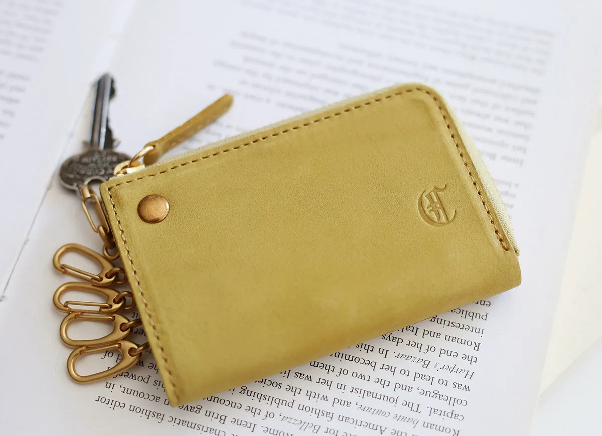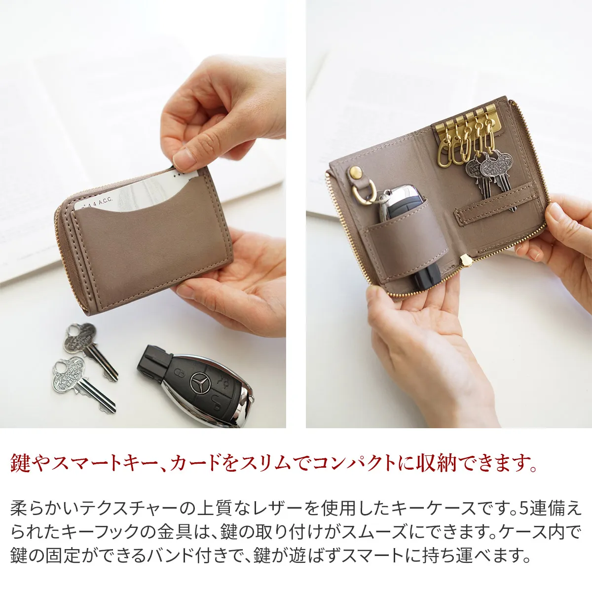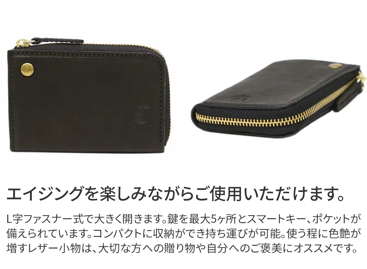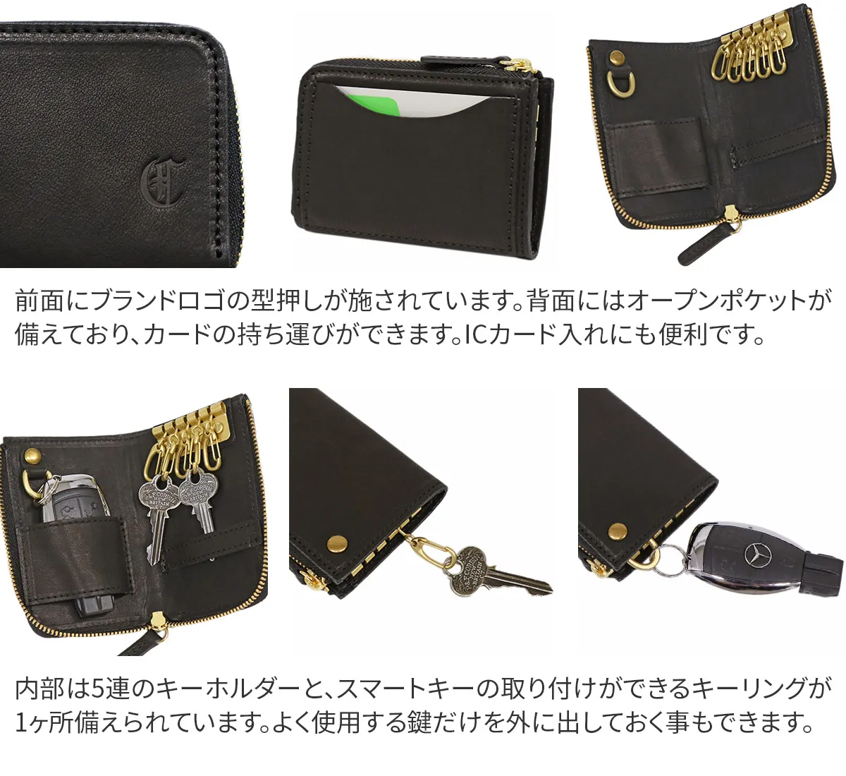 しなやかなマット調のレザーが心地良く手に馴染むアイテムです。L字ファスナー式でフラットに大きく開き視認性抜群。内部は5連のキーホルダーにスマートキー収納が備えられています。外部に1ヶ所備えられたカード入れは、外出時に便利です。