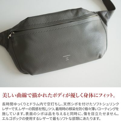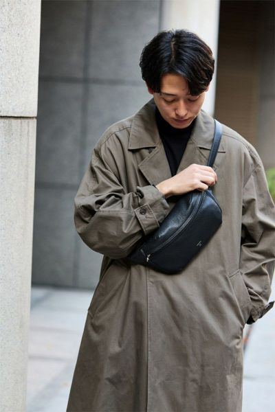 素材は原皮選びから鞣(なめ)し、仕上げまで、革の本場であるイタリアのタンナーで品質管理され作られています。 この原皮は、タンナーが扱うトップクオリティーの生地のみから選ばれ、長時間ゆっくりとミーリングされた天然のシュリンクレザーです。 革の質感をしっかり感じられるように表面はごく薄いコーティングにしているのは、同時に衣類への色移りがしないような特別な加工でもあります。 上質なソフトシュリンクレザーは着用時のフィット感が良く、快適に使用できます。 程よいサイジングでボディバッグとしてもお持ちいただけるので、自転車やバイクの移動時にも活躍します。