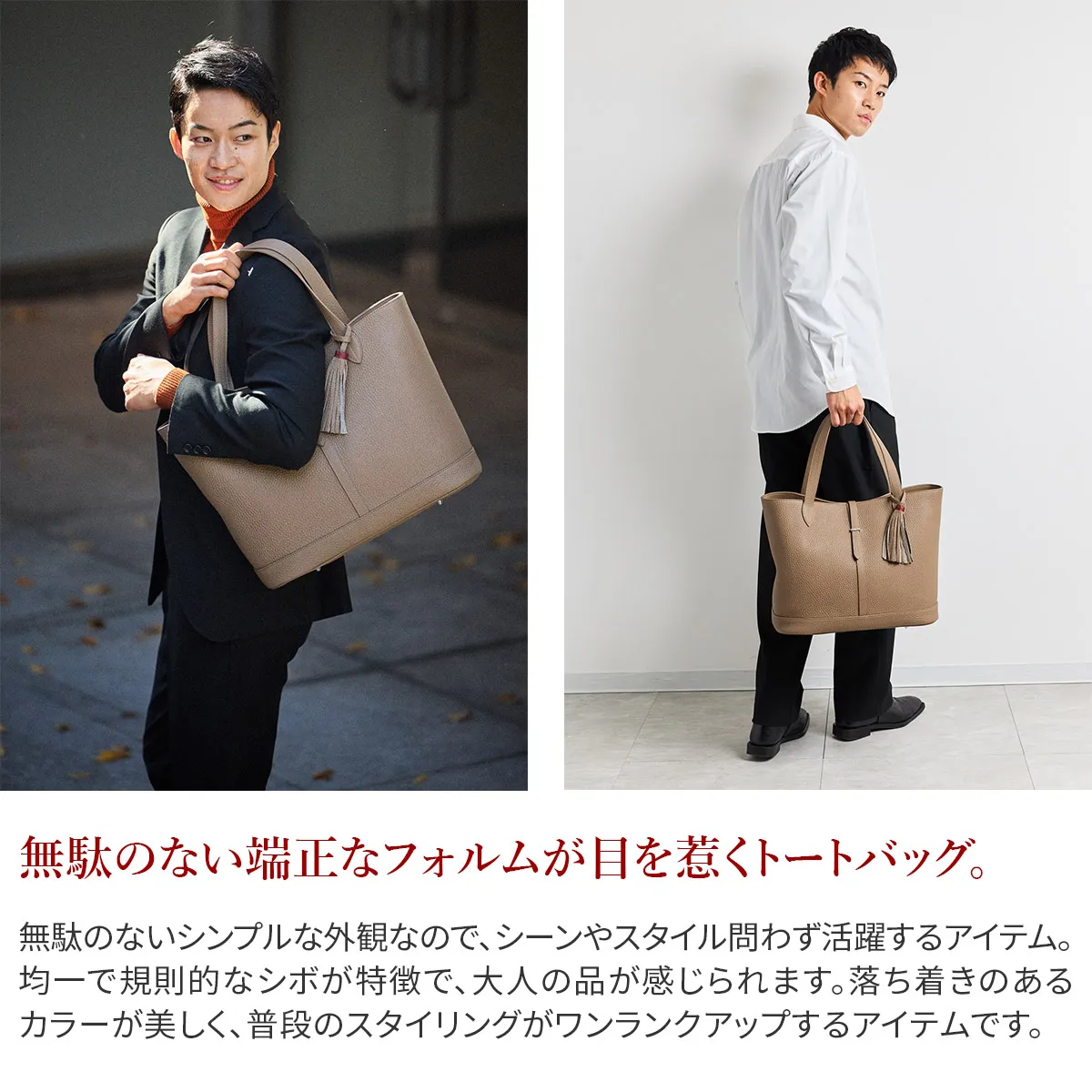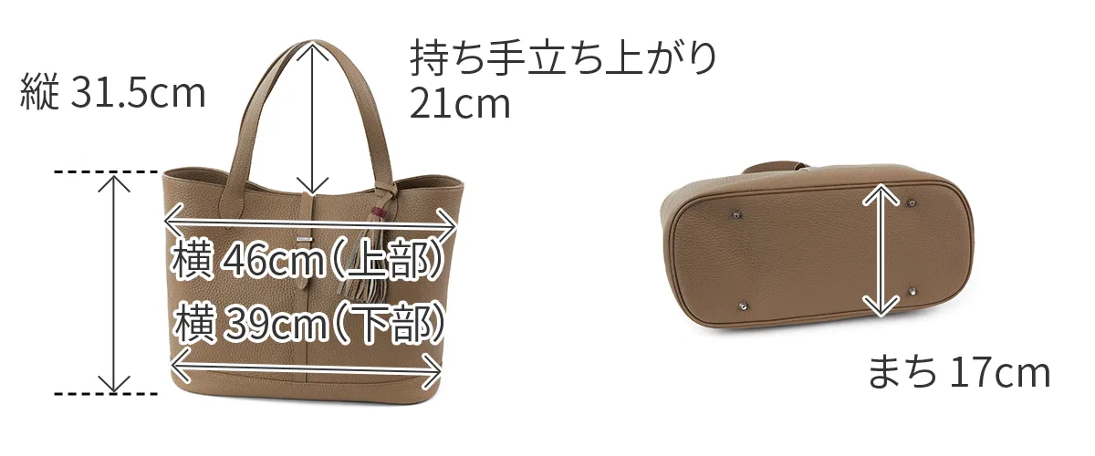 レザーには、上質でソフトな手触りが特徴のイタリア製シュリンクレザー(カーフレザー)を使用しています。 ACATEで採用しているシュリンクレザーは、耐久性、優雅さ、柔らかさを備えており、表面全体に均一で規則的なシボが入っている点が最大の特徴。 使い込むほどに美しい色艶を醸し出す、経年変化が楽しめるレザーです。 ACATEの生産は、MADE IN ITALYの高品質生産を追求し、細部へのこだわりと職人技で知られる工場"Dania”で行われています。 Daniaの強みは、職人技とテクノロジーへの両面投資にあり、伝統的な手縫いの価値を守りながらも、現代的なアプローチを提供しているという点。 Daniaの職人は様々な経験、年齢、背景を持っており、それぞれが専門領域で独自の特色を発揮しています。 40年以上にわたるハンドメイド技術の経験は、専門家の独自のこだわりであり、彼らは絶えず自己を更新し、イタリアとフランスのハイブランドの卓越した品質を維持し続けてきました。 そしてデジタル化による仕上げは、イタリアの最も才能ある若手職人によって担当されています。 Daniaは、コラムマシン、デジタルカッティング、ロングアームマシン、360度アームマシンなどが備わっており、常に最新の技術を提供。 長年にわたり培われた職人技と最新技術の融合が、高品質なプロダクトの提供を可能にしているのです。 KAUS2の横型タイプのトートバッグ。 ショルダーが長く、肩にもかけやすい仕様になっています。 端正なフォルムに仕上がっており、オンからオフまで幅広いスタイルにはまるアイテムです。