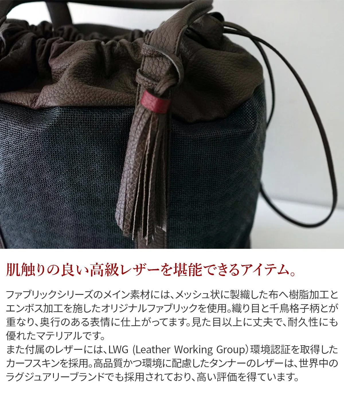 ACATEの中でも最もカジュアルにデザインされたモデル「BAMBINO(バンビーノ)」のファブリックシリーズ。 ファブリックシリーズのベースとなるメッシュ素材は、メッシュ状に製織した布に樹脂加工を施してあり、丈夫で耐久性に優れています。 強度があるため主に建築関係の養生用途に使われるなど様々な分野で使用されています。そのメッシュ素材に千鳥格子柄をエンボス加工することで織り目と柄が重なり、奥行のある表情に仕上がってます。 ACATEの生産は、MADE IN ITALYの高品質生産を追求し、細部へのこだわりと職人技で知られる工場"Dania”で行われています。 Daniaの強みは、職人技とテクノロジーへの両面投資にあり、伝統的な手縫いの価値を守りながらも、現代的なアプローチを提供しているという点。 Daniaの職人は様々な経験、年齢、背景を持っており、それぞれが専門領域で独自の特色を発揮しています。 40年以上にわたるハンドメイド技術の経験は、専門家の独自のこだわりであり、彼らは絶えず自己を更新しイタリアとフランスのハイブランドの卓越した品質を維持し続けてきました。 そしてデジタル化による仕上げはイタリアの最も才能ある若手職人によって担当されています。 Daniaは、コラムマシン、デジタルカッティング、ロングアームマシン、360度アームマシンなどが備わっており、常に最新の技術を提供。 長年にわたり培われた職人技と最新技術の融合が高品質なプロダクトの提供を可能にしているのです。 開口部が巾着仕様となっており、より立体感のある設計に仕上がっています。 マチが広く、しっかりと自立し、収納力も高い逸品となっています。 上質なシボを堪能しながらお使いいだけるアイテムです。