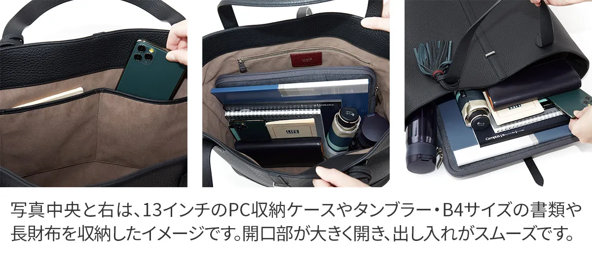 Daniaの職人は様々な経験、年齢、背景を持っており、それぞれが専門領域で独自の特色を発揮しています。 40年以上にわたるハンドメイド技術の経験は、専門家の独自のこだわりであり、彼らは絶えず自己を更新し、イタリアとフランスのハイブランドの卓越した品質を維持し続けてきました。そしてデジタル化による仕上げは、イタリアの最も才能ある若手職人によって担当されています。 Daniaは、コラムマシン、デジタルカッティング、ロングアームマシン、360度アームマシンなどが備わっており、常に最新の技術を提供。 長年にわたり培われた職人技と最新技術の融合が、高品質なプロダクトの提供を可能にしているのです。 B4サイズの書類やノートPCの収納が可能で、幅広いシーンで活躍します。マチ幅がしっかりとあり自立する設計です。