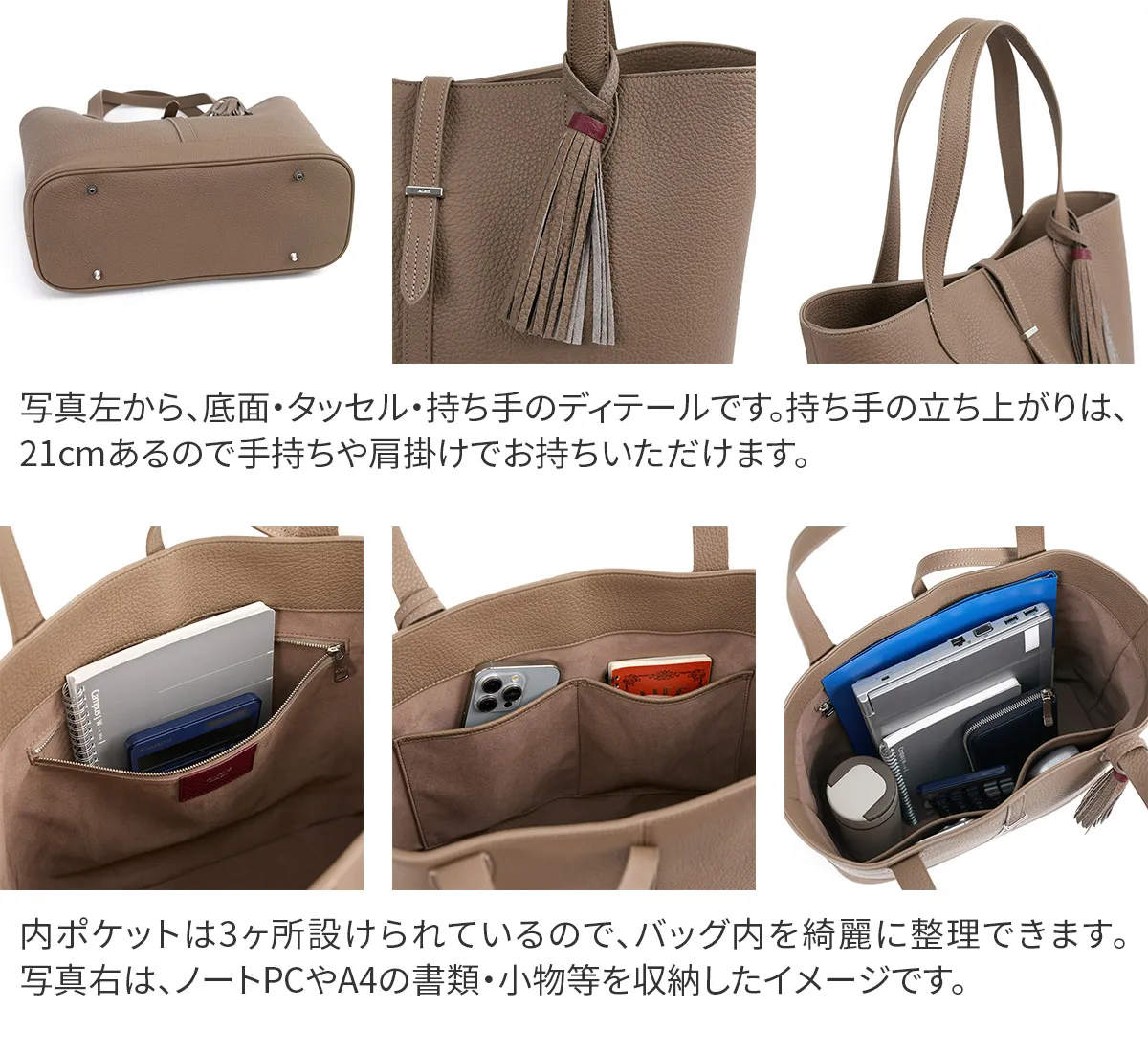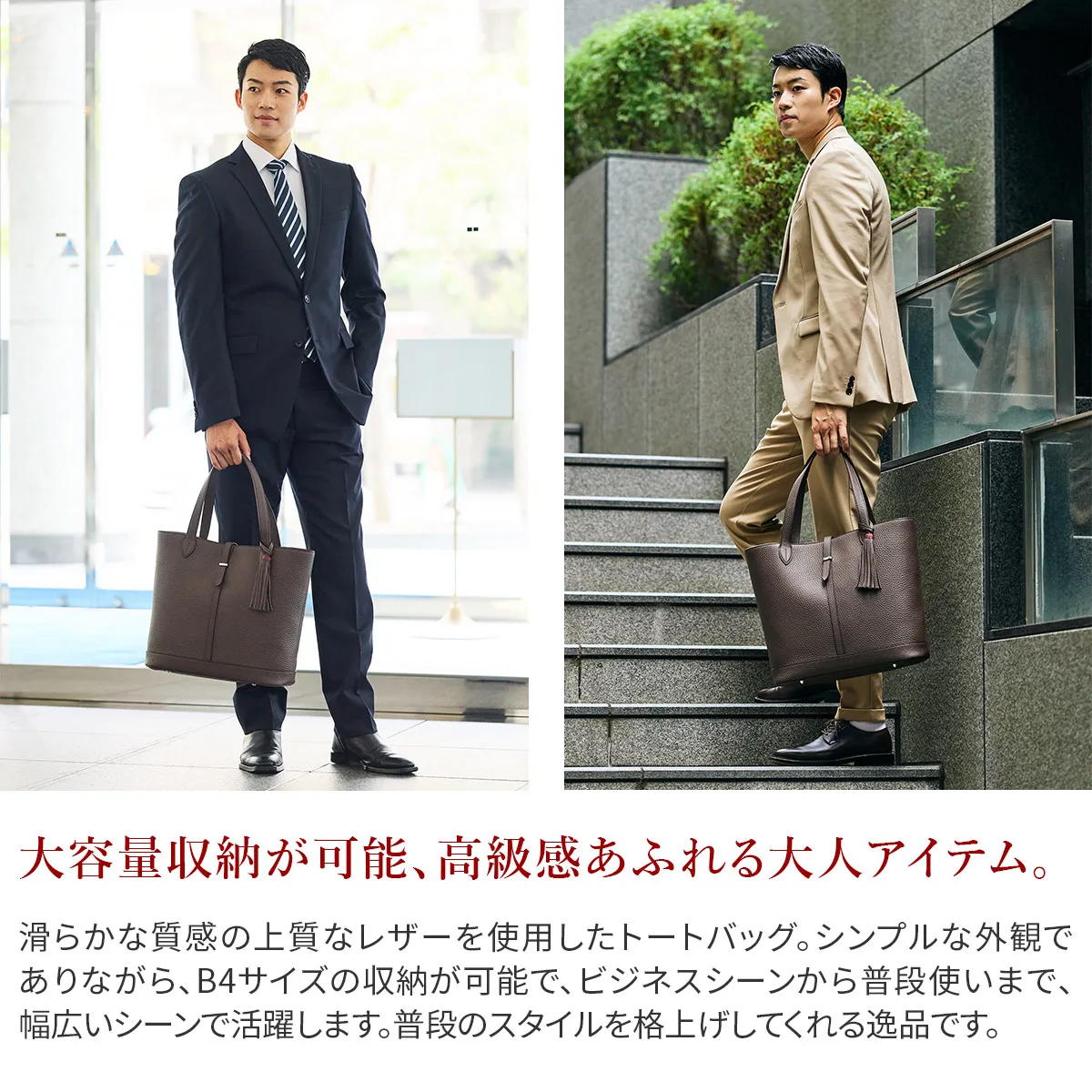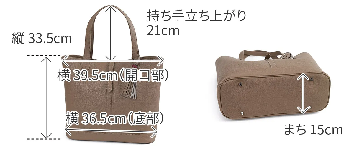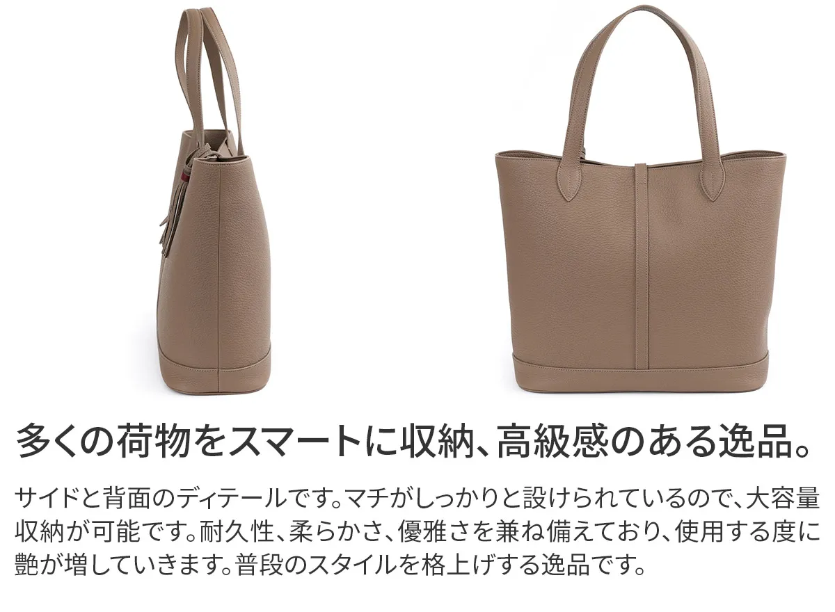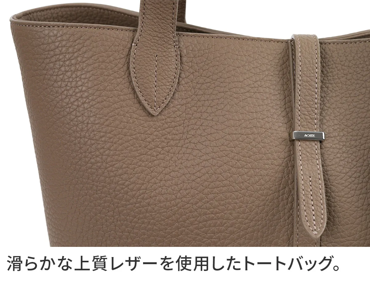 レザーには、上質でソフトな手触りが特徴のイタリア製シュリンクレザー(カーフレザー)を使用しています。 ACATEで採用しているシュリンクレザーは、耐久性、優雅さ、柔らかさを備えており、表面全体に均一で規則的なシボが入っている点が最大の特徴。 使い込むほどに美しい色艶を醸し出す、経年変化が楽しめるレザーです。 ACATEの生産は、MADE IN ITALYの高品質生産を追求し、細部へのこだわりと職人技で知られる工場"Dania”で行われています。 Daniaの強みは、職人技とテクノロジーへの両面投資にあり、伝統的な手縫いの価値を守りながらも、現代的なアプローチを提供しているという点。 Daniaの職人は様々な経験、年齢、背景を持っており、それぞれが専門領域で独自の特色を発揮しています。 40年以上にわたるハンドメイド技術の経験は、専門家の独自のこだわりであり、彼らは絶えず自己を更新し、イタリアとフランスのハイブランドの卓越した品質を維持し続けてきました。 そしてデジタル化による仕上げは、イタリアの最も才能ある若手職人によって担当されています。 Daniaは、コラムマシン、デジタルカッティング、ロングアームマシン、360度アームマシンなどが備わっており、常に最新の技術を提供。 長年にわたり培われた職人技と最新技術の融合が、高品質なプロダクトの提供を可能にしているのです。 滑らかな質感の上質なレザーを使用したトートバッグ。 マチ幅がしっかりと設けられており、B4サイズの書類やノートPCの収納が可能で、幅広いシーンで活躍します。 普段のスタイルを格上げしてくれる逸品です。