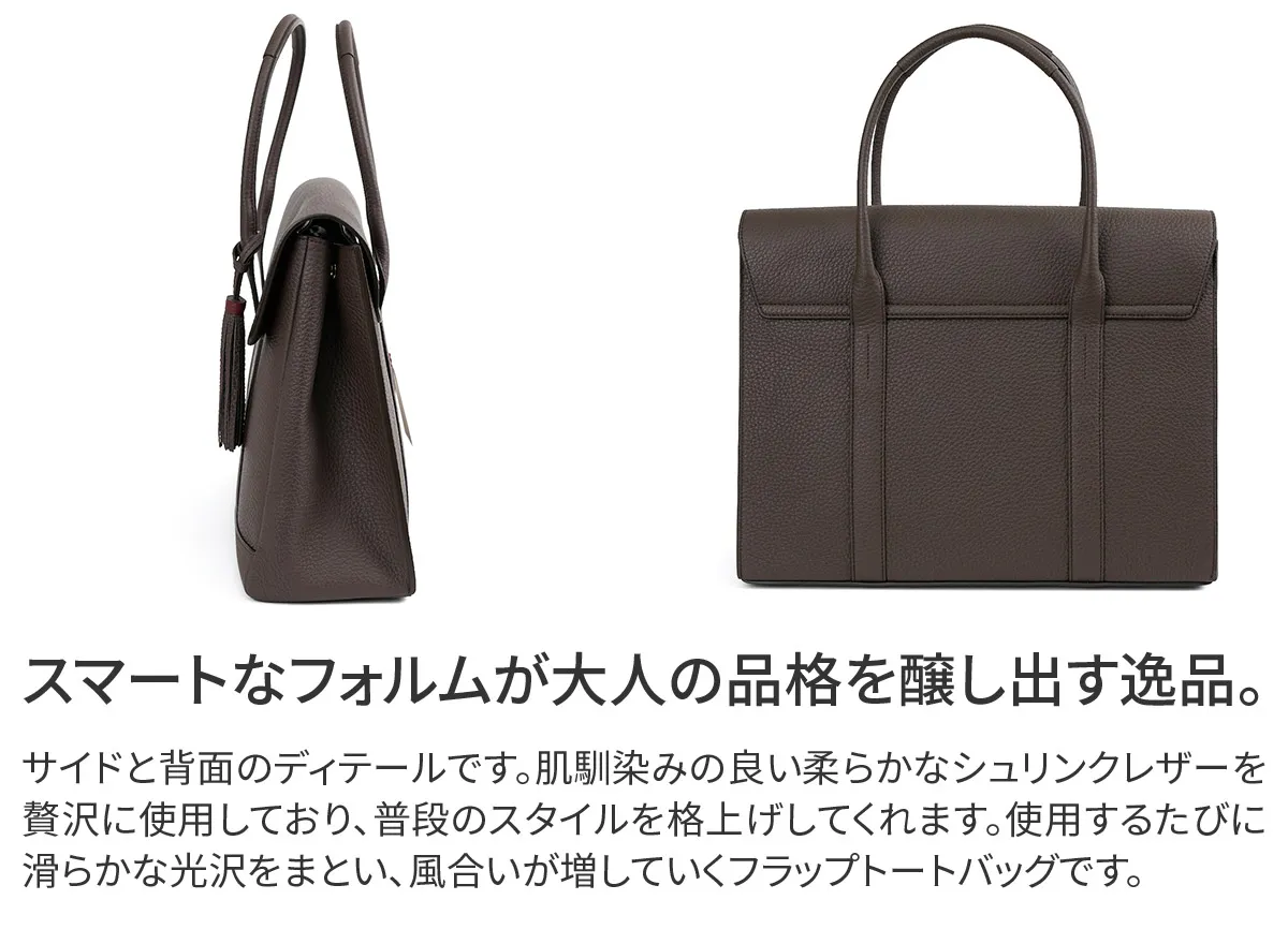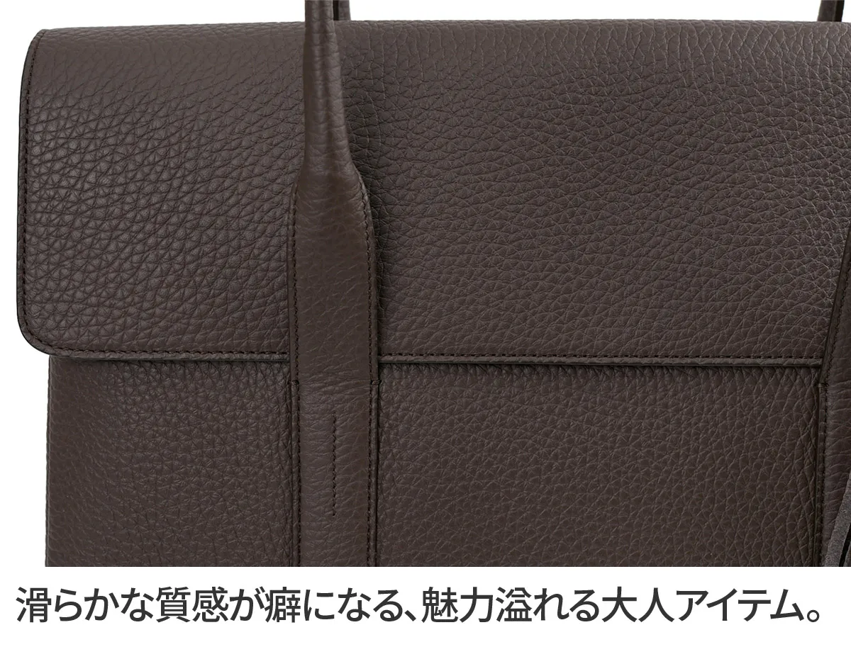 レザーには、上質でソフトな手触りが特徴のイタリア製シュリンクレザー(カーフレザー)を使用しています。 ACATEで採用しているシュリンクレザーは、耐久性、優雅さ、柔らかさを備えており、表面全体に均一で規則的なシボが入っている点が最大の特徴。 使い込むほどに美しい色艶を醸し出す、経年変化が楽しめるレザーです。 ACATEの生産は、MADE IN ITALYの高品質生産を追求し、細部へのこだわりと職人技で知られる工場"Dania”で行われています。 Daniaの強みは、職人技とテクノロジーへの両面投資にあり、伝統的な手縫いの価値を守りながらも、現代的なアプローチを提供しているという点。 Daniaの職人は様々な経験、年齢、背景を持っており、それぞれが専門領域で独自の特色を発揮しています。 40年以上にわたるハンドメイド技術の経験は、専門家の独自のこだわりであり、彼らは絶えず自己を更新し、イタリアとフランスのハイブランドの卓越した品質を維持し続けてきました。 そしてデジタル化による仕上げは、イタリアの最も才能ある若手職人によって担当されています。 Daniaは、コラムマシン、デジタルカッティング、ロングアームマシン、360度アームマシンなどが備わっており、常に最新の技術を提供。 長年にわたり培われた職人技と最新技術の融合が、高品質なプロダクトの提供を可能にしているのです。 滑らかな質感の上質なレザーを使用したフラップトートバッグ。 側面にマグネットが付いており、荷物量に合わせて開口部の開き具合を調節できる仕様となっています。 シンプルな外観ながらも上品さを感じさせる逸品です。