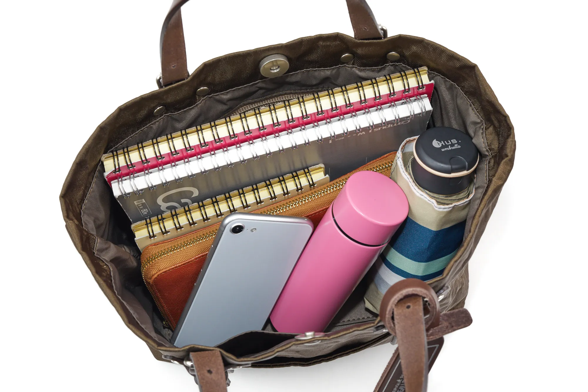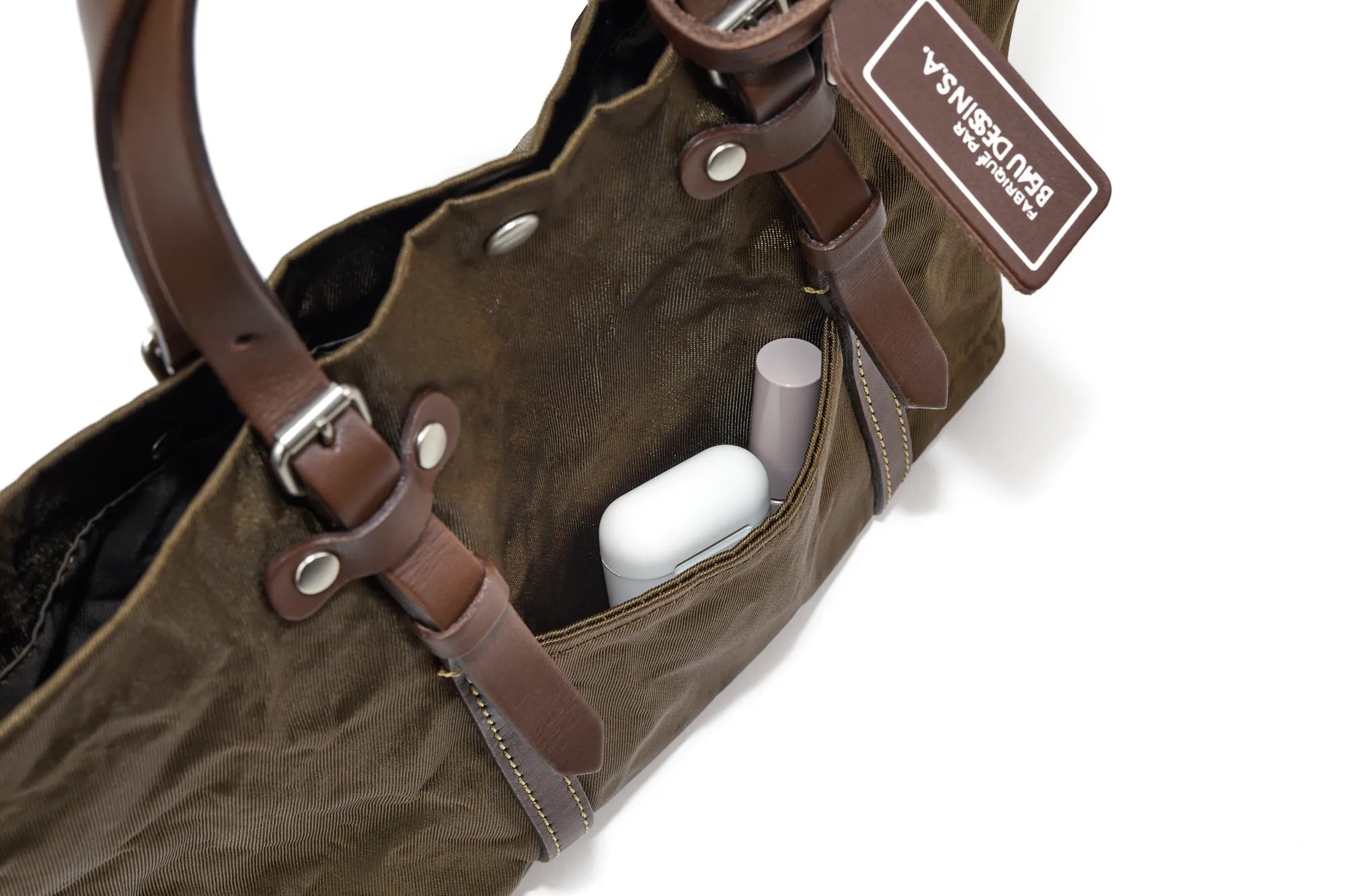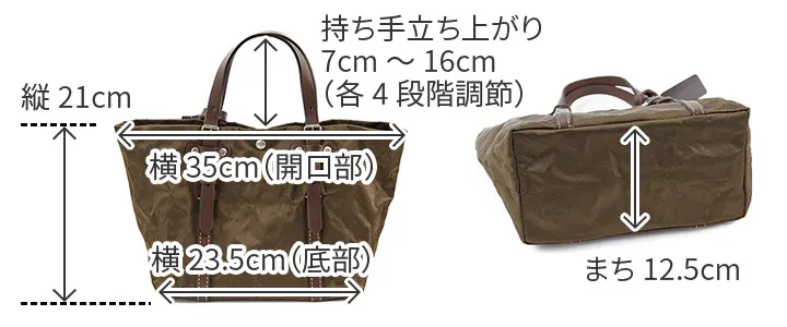 メタリックナイロンの裏に薄いアルミをボンディング加工しています。ナイロン素材でありながら張りがあり、手で握っただけで独特なシワが生まれるとても珍しい素材です。付属の革にはブッテーロレザーが使用されています。 近場の買い物やちょっとしたお出かけにお勧めの、軽やかなトートバッグです。コンパクトな見た目でありながら、B5サイズのノートががピッタリと収納できるサイズ感です。張りのある素材なので形を保ってお持ちいただけます。少し光沢感があり、普段のコーデに華やかさを持たせてくれます。