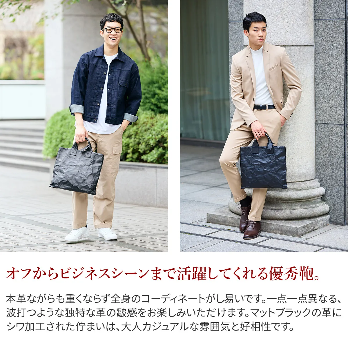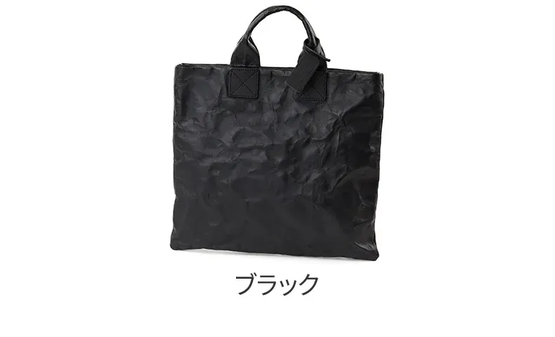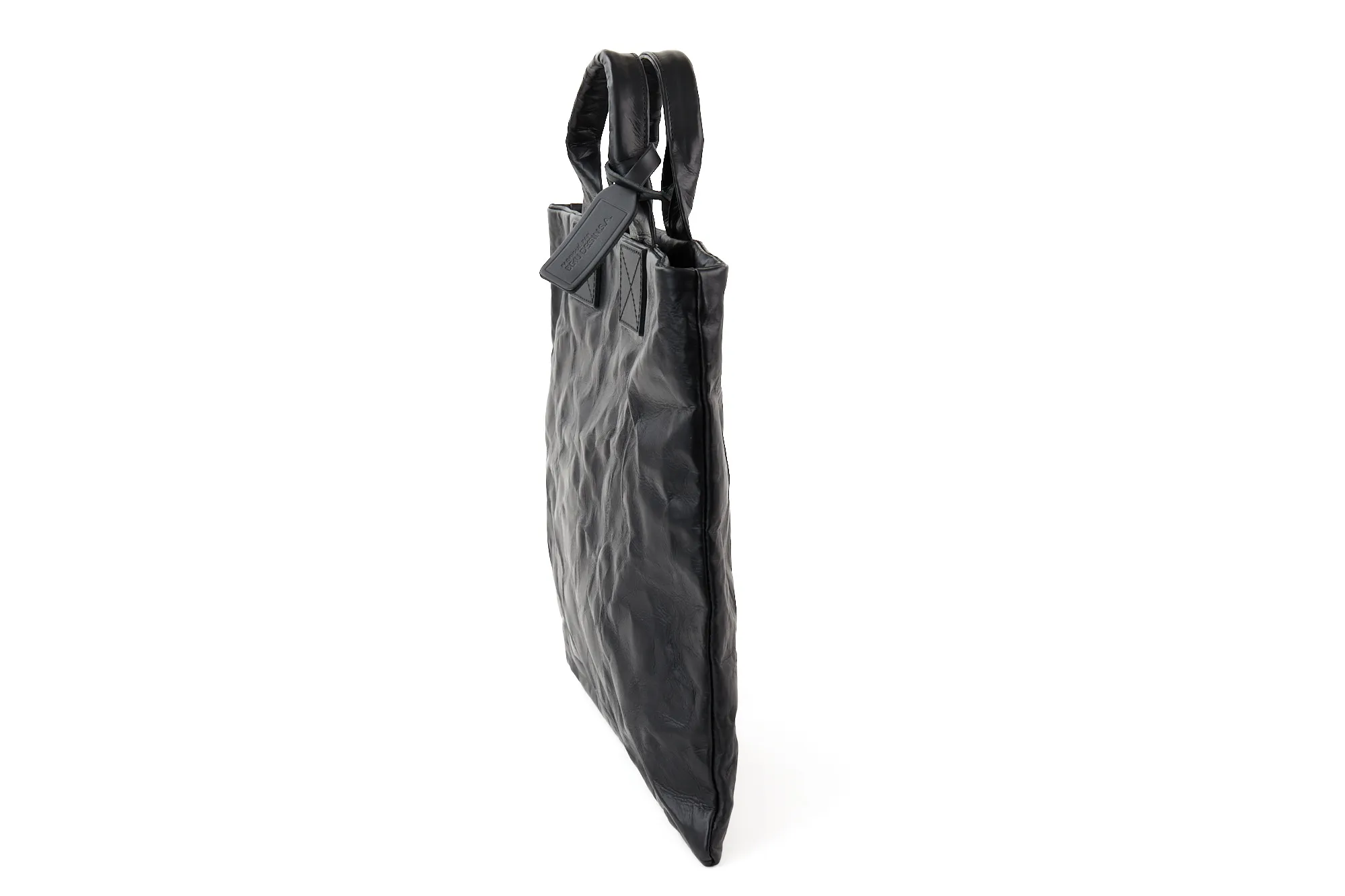 ロングセラーであるアルミ・ボンディング シリーズの人気の形を、革を使いよりシックに、そして大人な雰囲気にリニューアルしたバッグです。 ボンディング加工されたレザーはどこかユニークで軽快な表情をもたらし、本革ながらも重くならず全身のコーディネートもし易いです。 一点一点異なる、波打つような独特な革の皺感をお楽しみください。 マットブラックの革にシワ加工された佇まいは、大人カジュアルな雰囲気と好相性。しっかりとした作りでありながら、抜け感がありつつ、普段使いにお勧め。A4サイズに対応した大きさですが、マチなしタイプですのでスマートにお持ちいただけます。