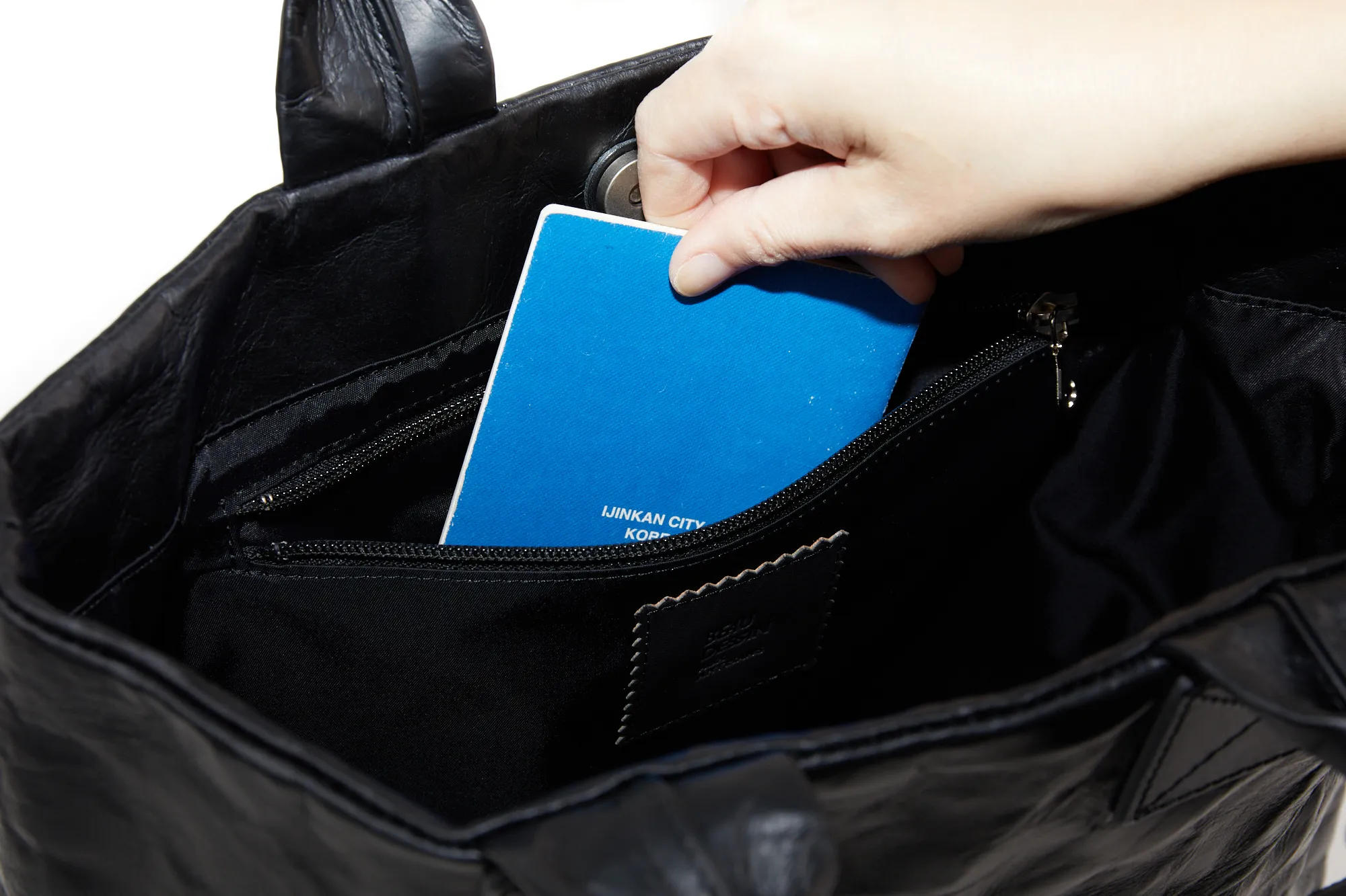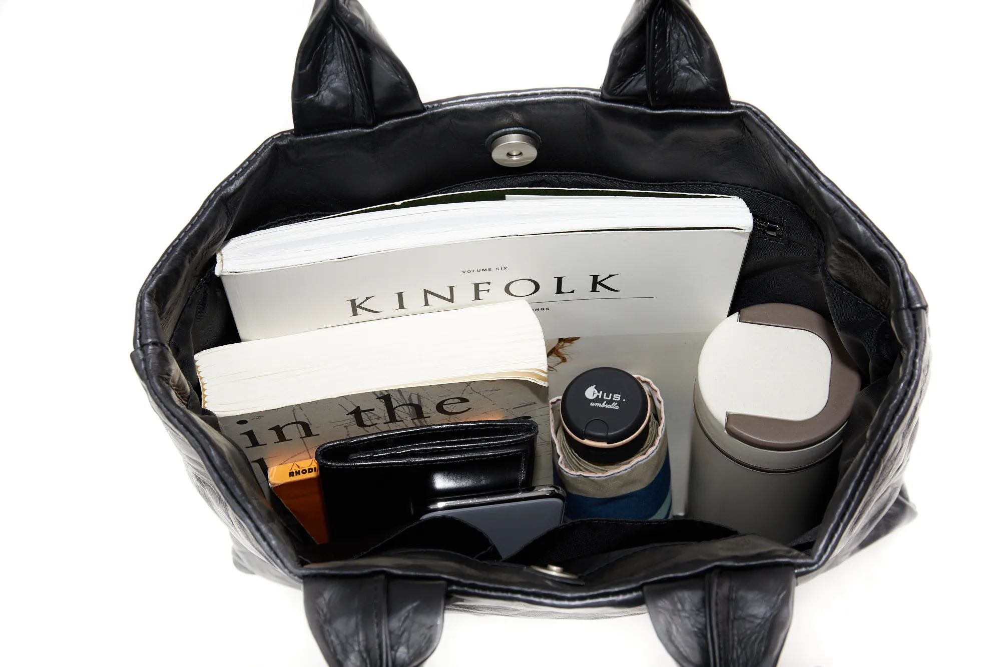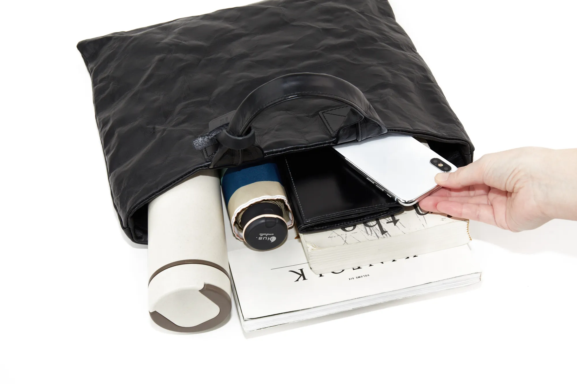 ロングセラーであるアルミ・ボンディング シリーズの人気の形を、革を使いよりシックに、そして大人な雰囲気にリニューアルしたバッグです。 ボンディング加工されたレザーはどこかユニークで軽快な表情をもたらし、本革ながらも重くならず全身のコーディネートもし易いです。 一点一点異なる、波打つような独特な革の皺感をお楽しみください。 マットブラックの革にシワ加工された佇まいは、大人カジュアルな雰囲気と好相性。しっかりとした作りでありながら、抜け感がありつつ、普段使いにお勧め。A4サイズに対応した大きさですが、マチなしタイプですのでスマートにお持ちいただけます。