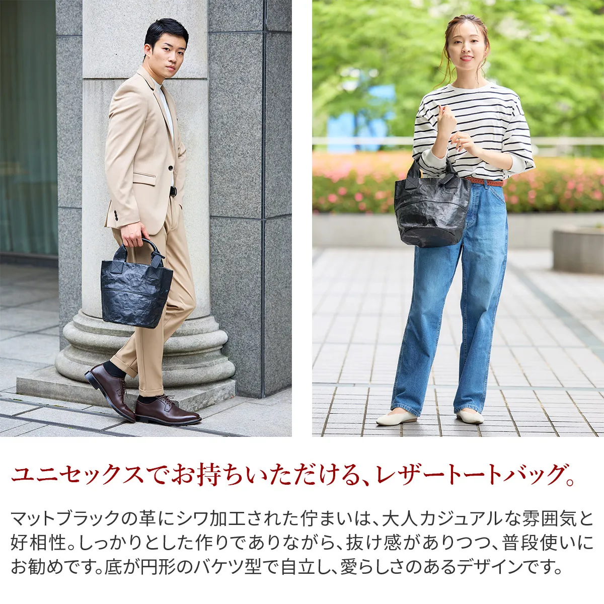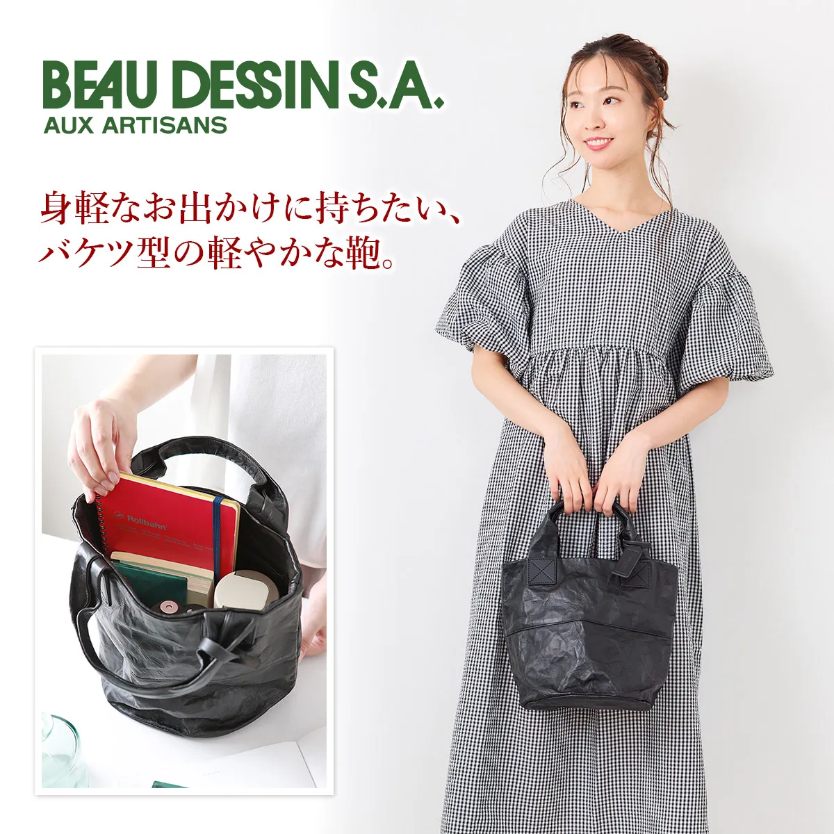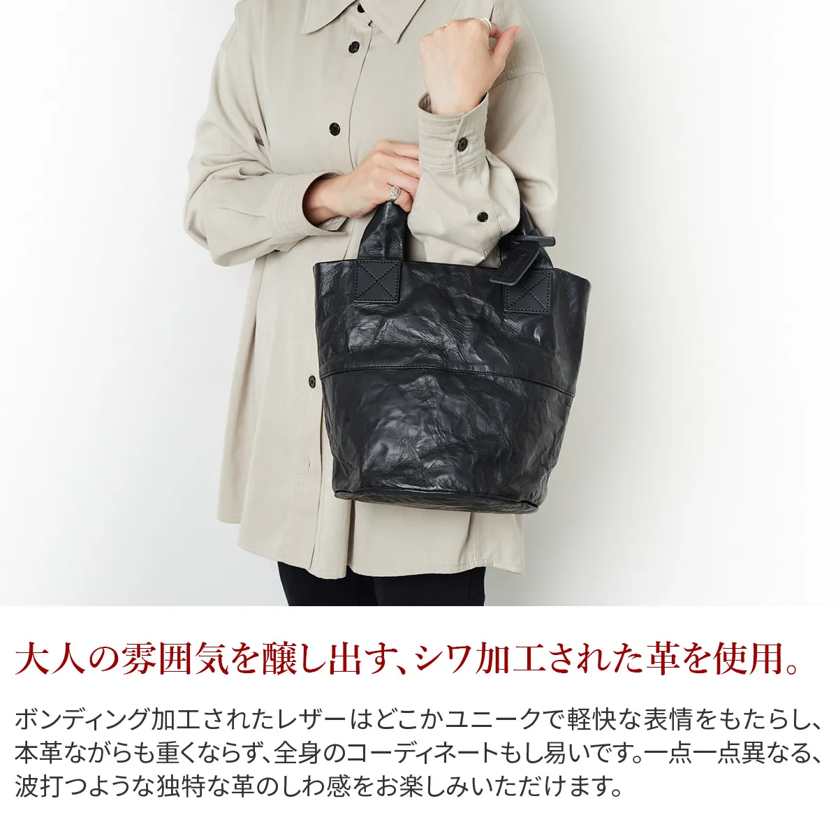 ロングセラーであるアルミ・ボンディング シリーズの人気の形を、革を使いよりシックに、そして大人な雰囲気にリニューアルしたバッグです。 ボンディング加工されたレザーはどこかユニークで軽快な表情をもたらし、本革ながらも重くならず全身のコーディネートもし易いです。 一点一点異なる、波打つような独特な革の皺感をお楽しみください。 マットブラックの革にシワ加工された佇まいは、大人カジュアルな雰囲気と好相性。しっかりとした作りでありながら、抜け感がありつつ、普段使いにお勧め。底が円形のバケツ型で自立し、愛らしさもプラスされたデザインとなっております。