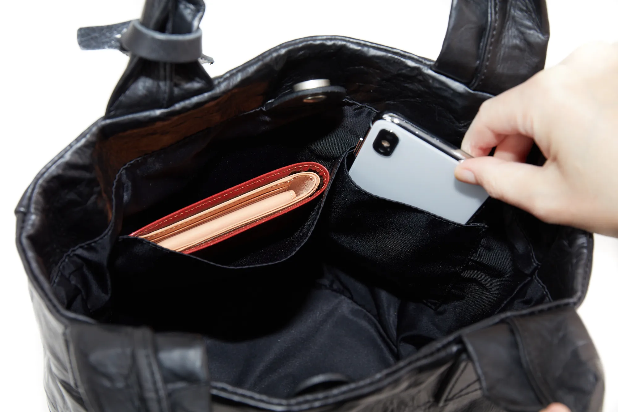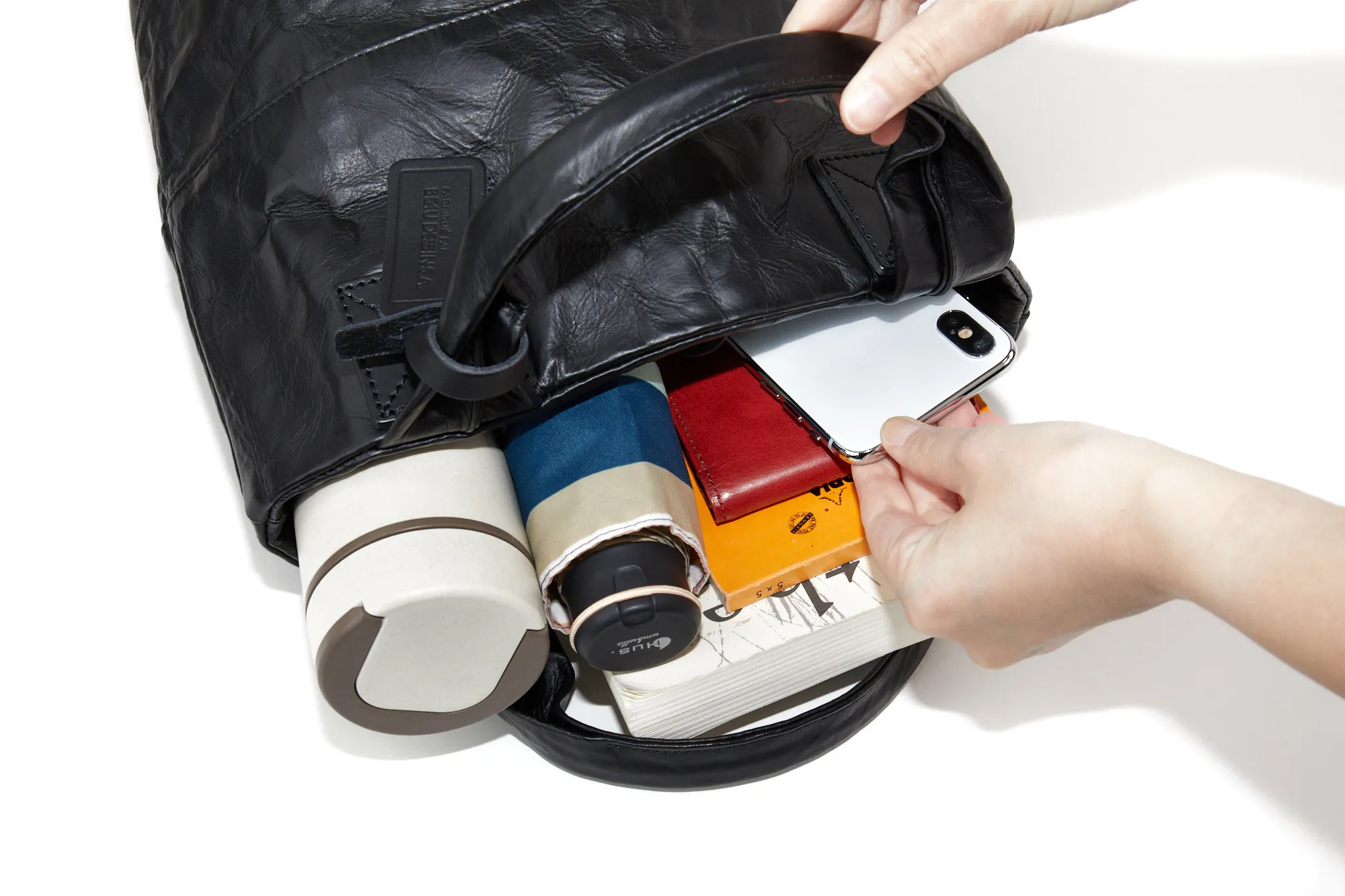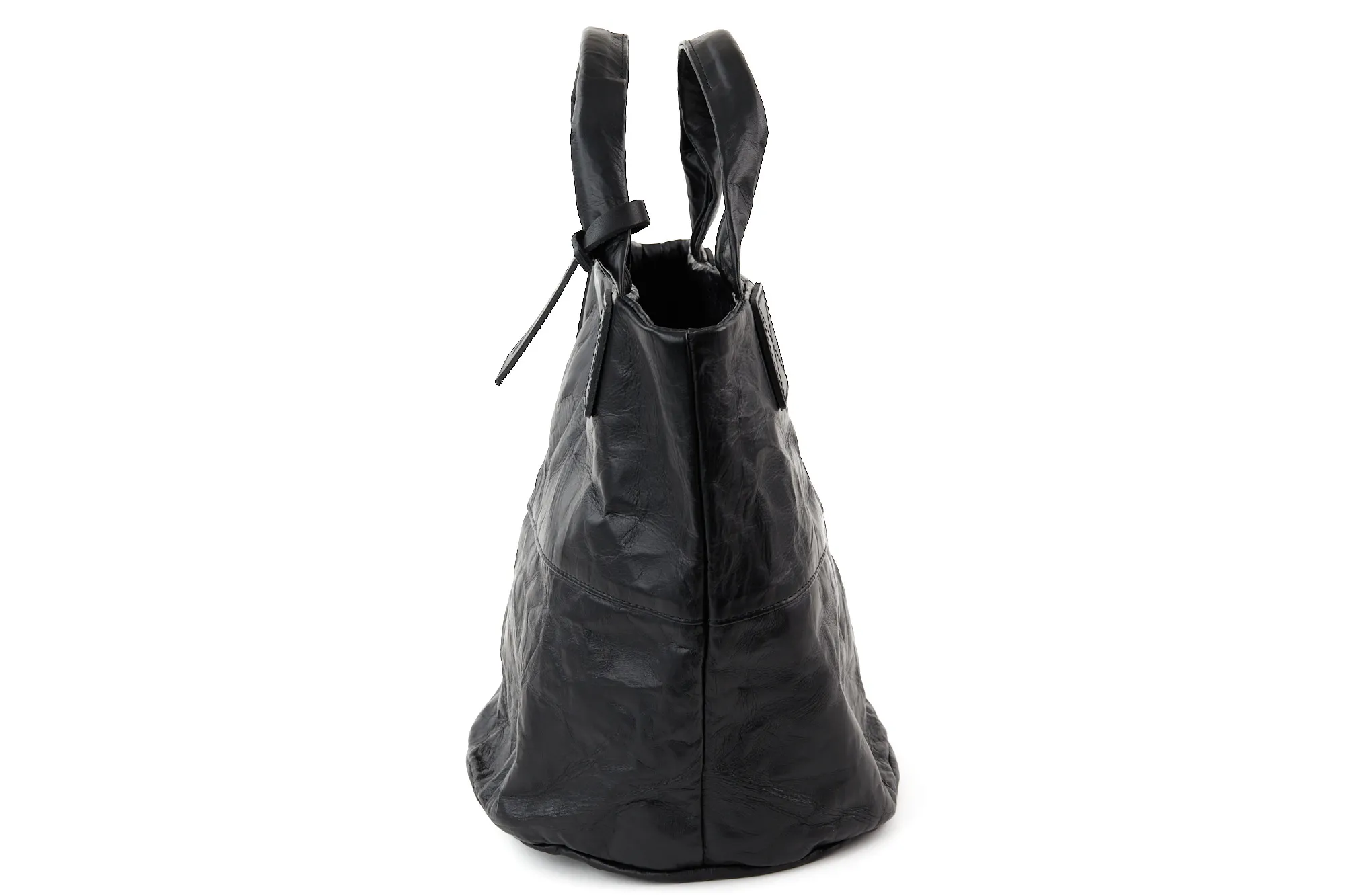 ロングセラーであるアルミ・ボンディング シリーズの人気の形を、革を使いよりシックに、そして大人な雰囲気にリニューアルしたバッグです。 ボンディング加工されたレザーはどこかユニークで軽快な表情をもたらし、本革ながらも重くならず全身のコーディネートもし易いです。 一点一点異なる、波打つような独特な革の皺感をお楽しみください。 マットブラックの革にシワ加工された佇まいは、大人カジュアルな雰囲気と好相性。しっかりとした作りでありながら、抜け感がありつつ、普段使いにお勧め。底が円形のバケツ型で自立し、愛らしさもプラスされたデザインとなっております。