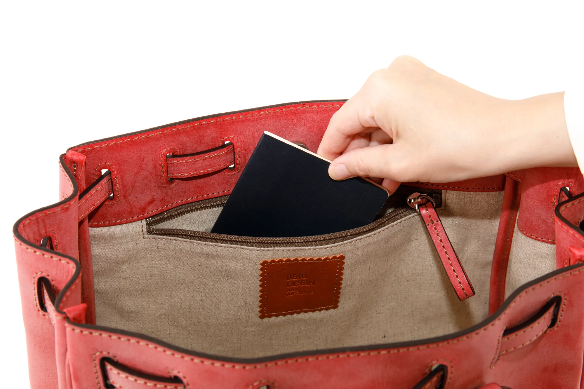 ※ボーデッサンの革製品は、本革の自然な風合いを生かす為、色止め加工を最小限にとどめ生産されており、摩擦、汗、水分を含んだ場合、多少色落ちや色移りする事もあります。また、天然物の本革を使用しております為、同じ商品でも部位やパーツによっても、一点一点、革表面の表情が異なります。天然物の革の風合いをお愉しみください。