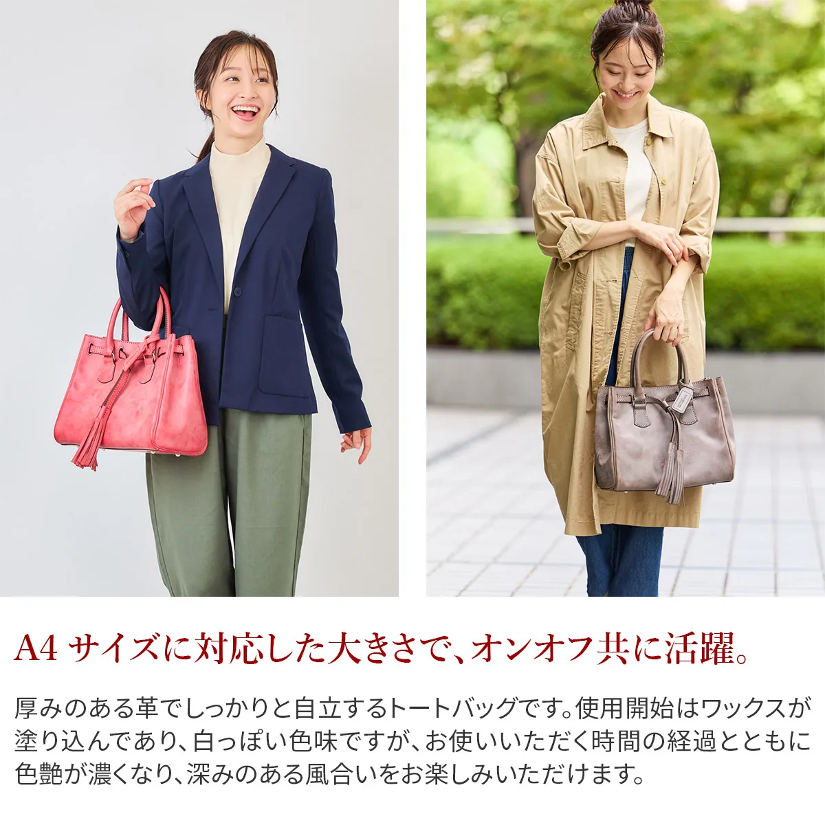 インディアンジュエリー作家チャールズ・ロロマの作品からインスピレーションを受け作られた素材です。 国内で丁寧になめされた上質のオイルヌメに染色後1枚1枚手作業でワックスをぬり込んだ素材です。 使うほどにツヤが増し、経年変化が楽しめる素材です。 フルタンニンで2度鞣した革で、磨くと上品な艶が出ます。 厚みのある革でしっかりと自立するトートバッグです。開口部のベルトで間口を広げられる構造になっていますので、荷物量に合わせて調節していただけます。 使用開始はワックスが塗り込んであり白っぽい色味ですが、お使いいただく時間の経過とともに、色艶が濃くなり、深みのある風合いをお楽しみいただけます。