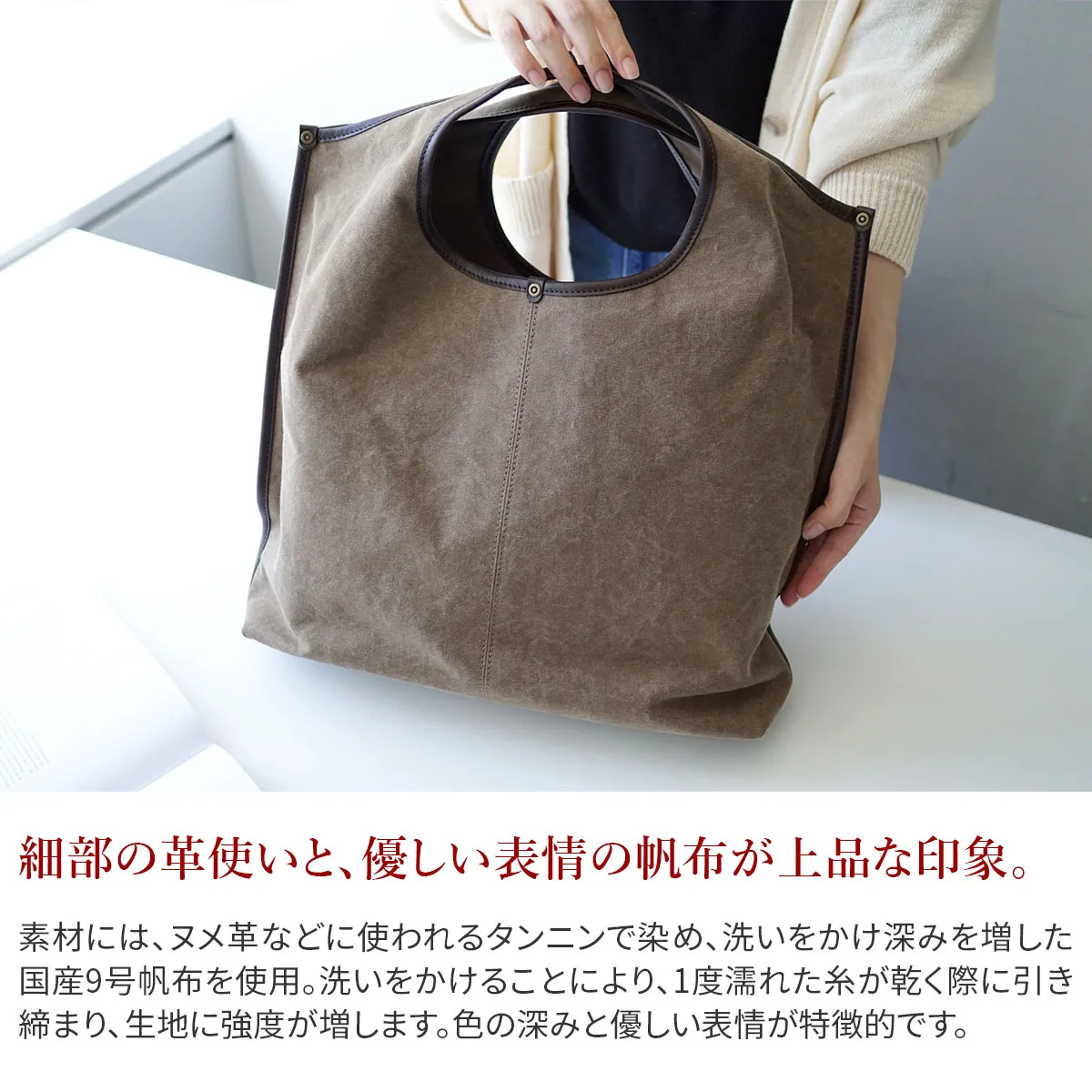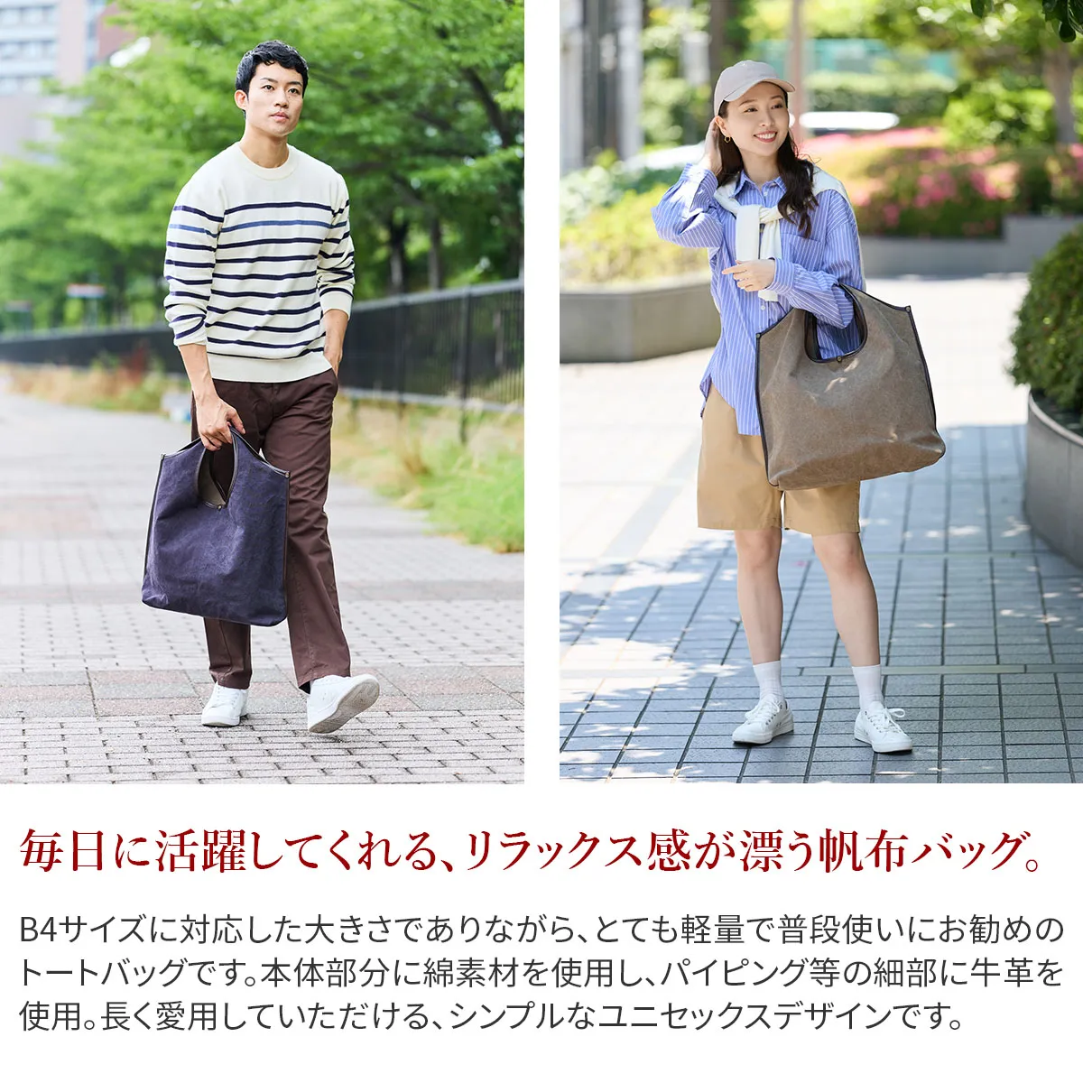 素材には、ヌメ革などに使われるタンニンで染め、洗いをかけ深みを増した国産9号帆布を使用しています。洗いをかける事により1度濡れた糸が乾く際に引き締まり生地に強度が増します。また、洗うことにより色の深みと優しい表情が特徴的な素材です。 B4サイズに対応した大きさでありながら、とても軽量で普段使いにお勧めのトートバッグです。本体部分に綿素材を使用し、パイピング等の細部に牛革を使用しています。開口部はオープンタイプですが、上部にかけてマチなしの作りになっていますので、広がらずにスマートにお持ちいただけます。