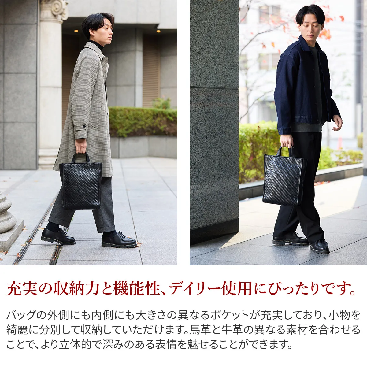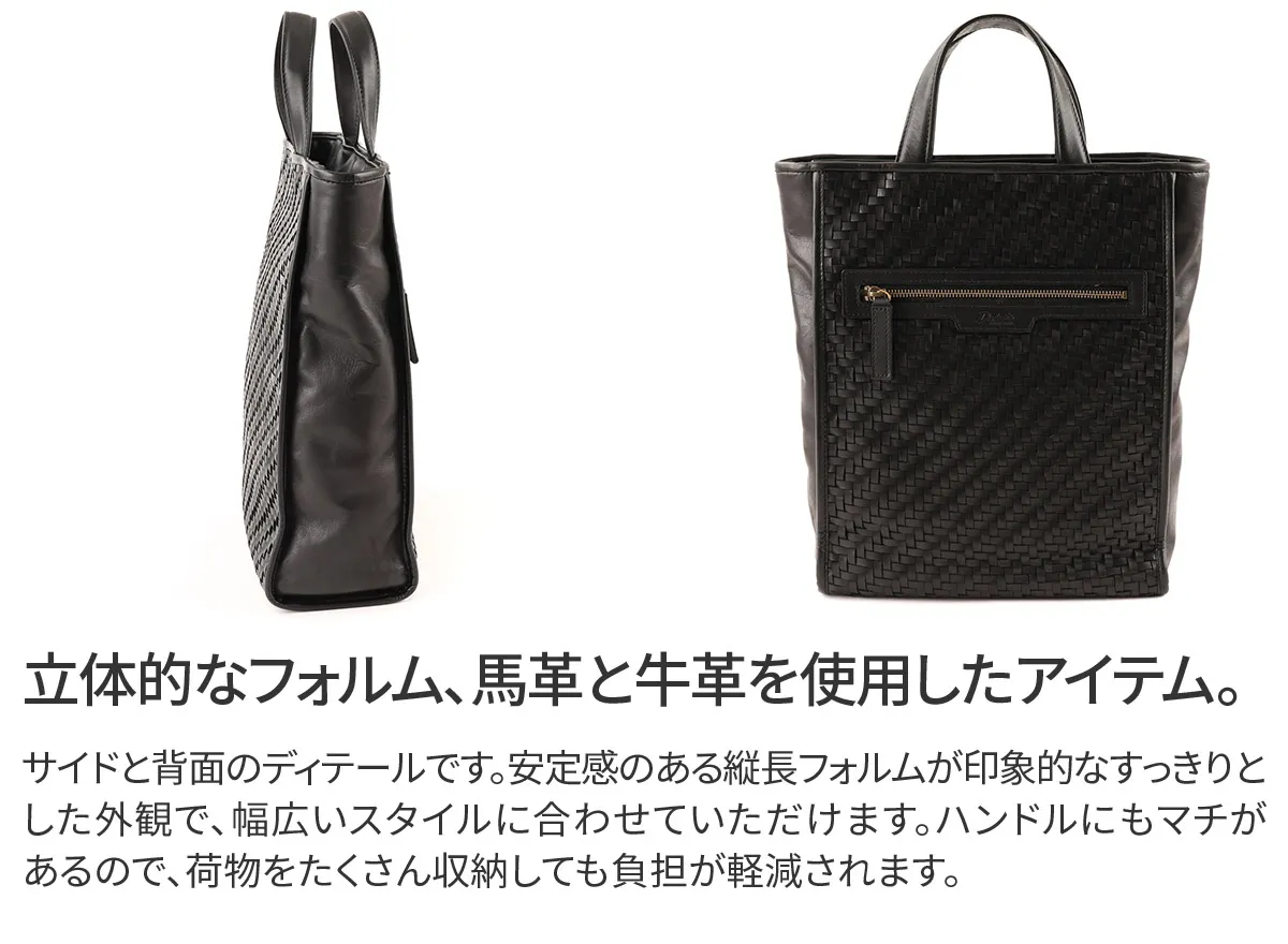 コンビ鞣しレザーの馬革にオイルを馴染ませ、手触りの良い素材に仕上げました。 テンションのかかる持ち手やショルダー部には経年変化を味わえる、素上げの本格牛革を 付属として使用しました。 本体の前後胴には熟練の職人が丁寧に編み上げたメッシュを採用しています。 春夏には軽やかに、秋冬にはシックなムードに使える模様で編み込んでいます。 A4サイズの書類が収納でき、マチ幅もあり、実用性に優れています。 丁寧に編まれたメッシュ模様がポイントで、 エイジングを楽しみながらお使いいただけるアイテムです。