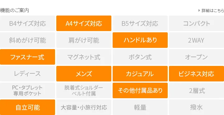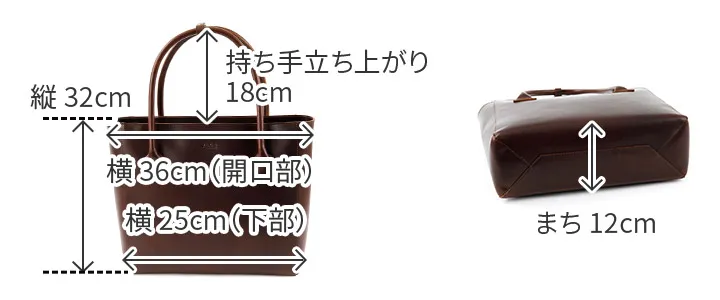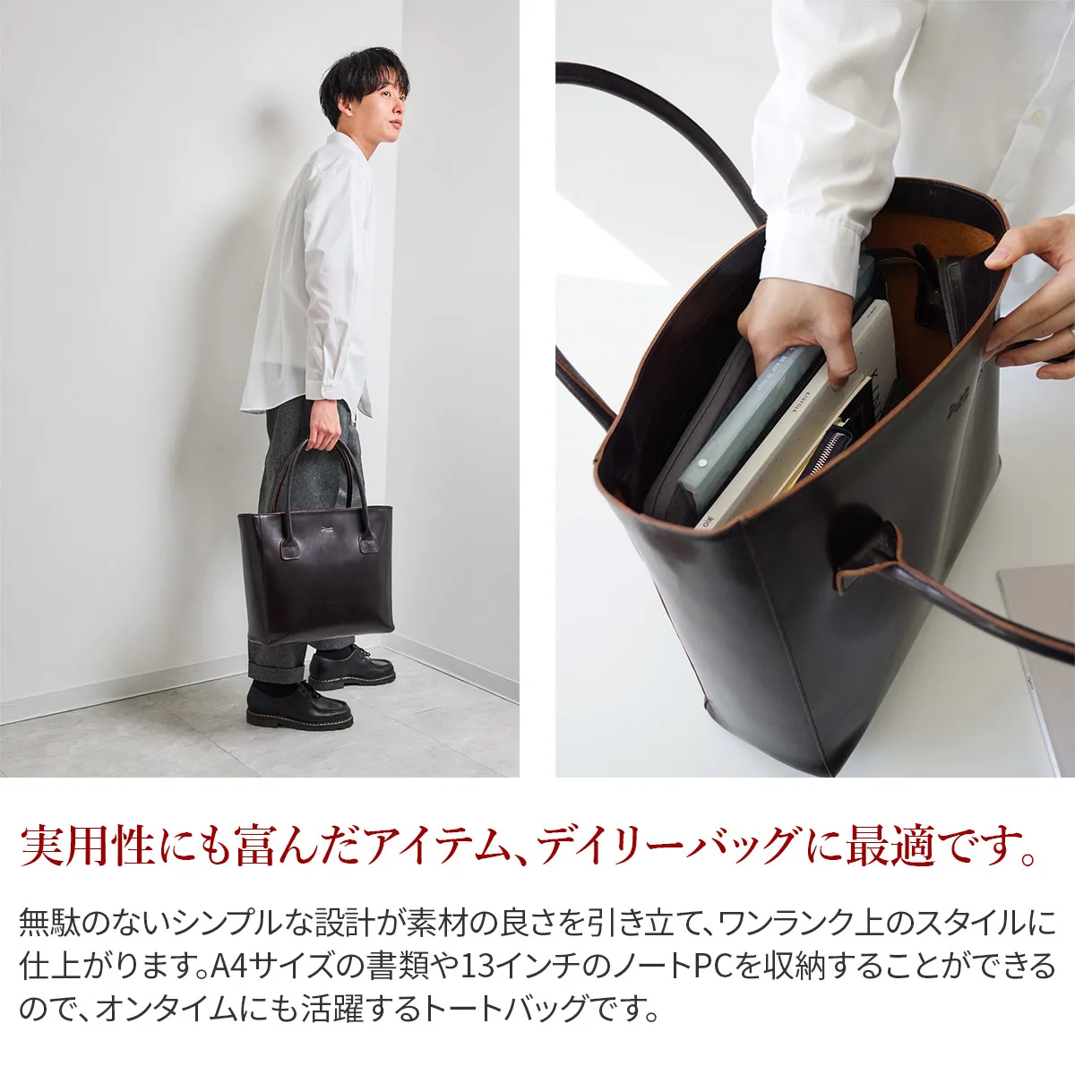 国内でも希少な大規模ピット槽で、時間と手間をかけて鞣し剤を染み込ませたヌメ革を使用。 きれいな経年変化と、コバなど細部の美しさの仕上がりが特徴です。 紙袋の様な底がポイントのバッグは、特殊なポストミシンを使用しています。厚くて硬い革を縫製が出来るのは、工場でも限られた職人にしか出来ません。 内部には大きさの異なるポケットが付いており、小物を綺麗に分別していただけます。 付属の底板があるので、荷物の量が少なくても型崩れすることなくお使いいただけます。