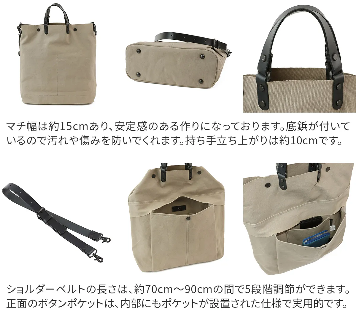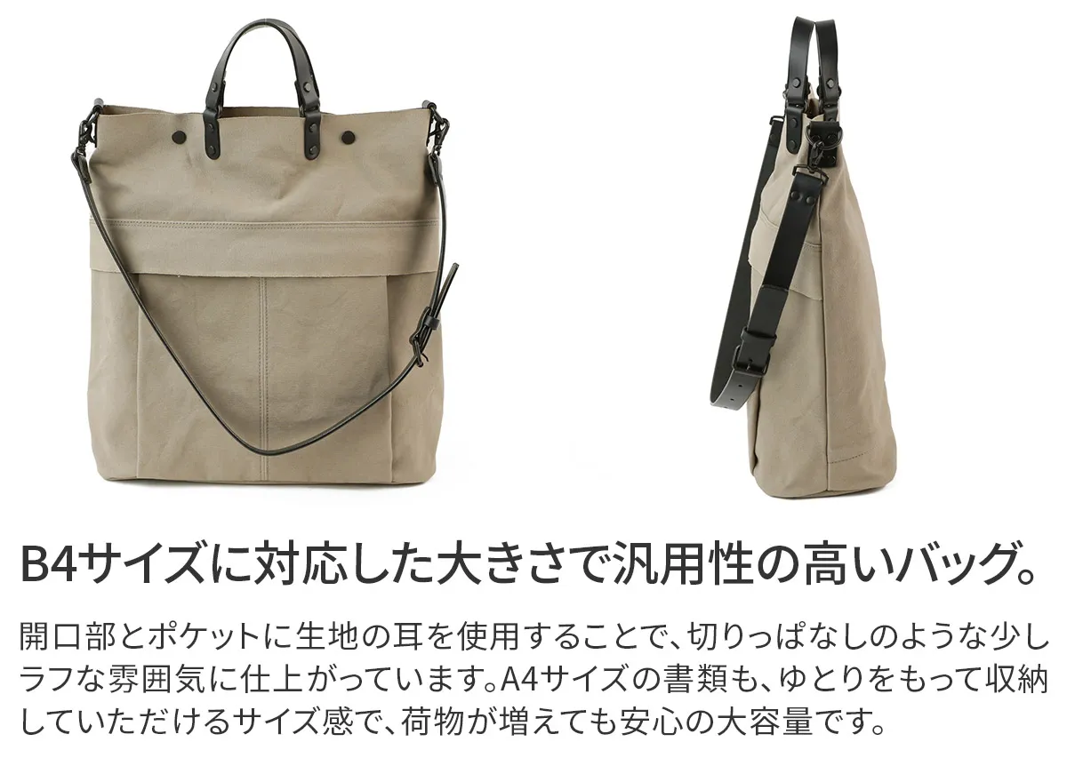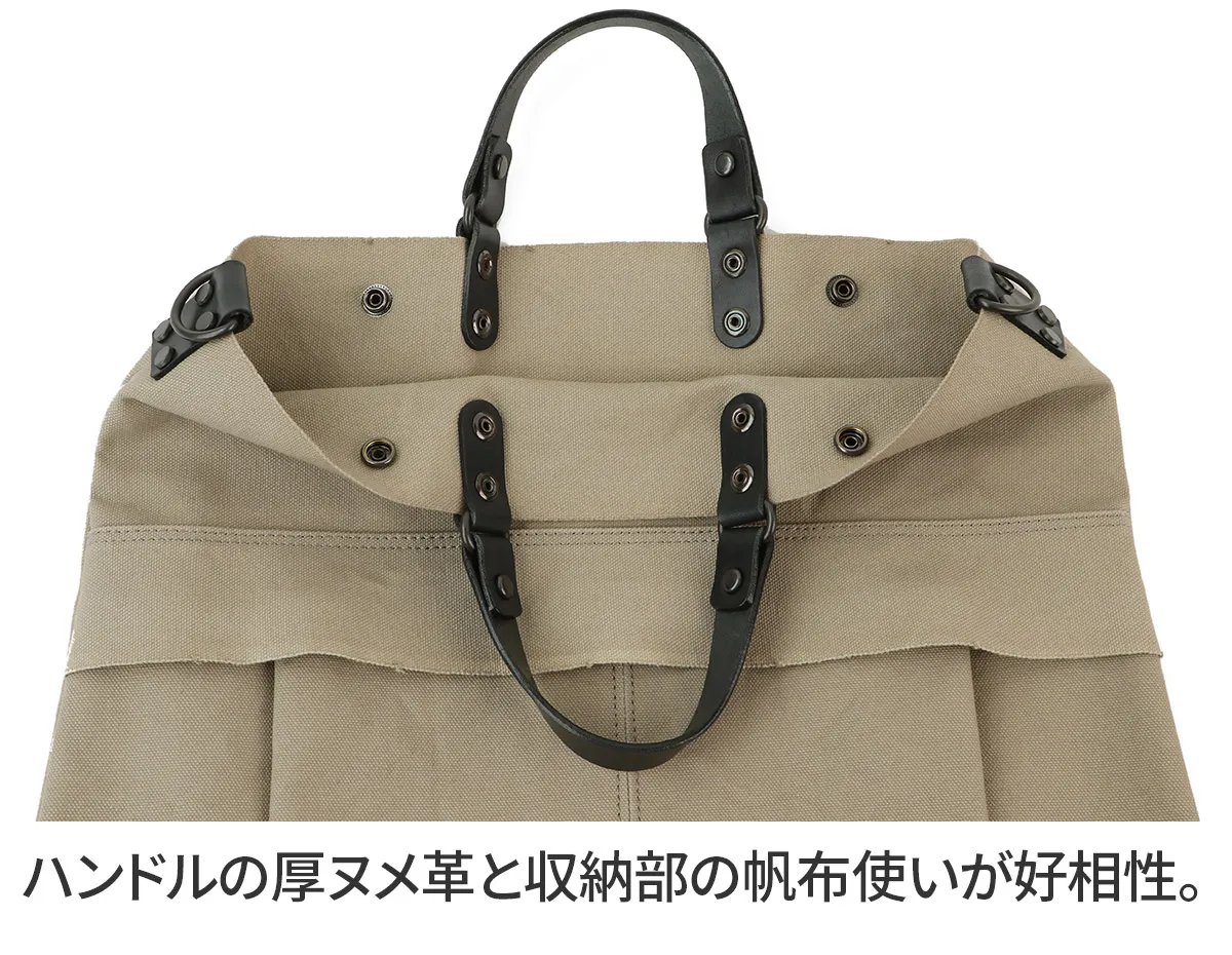 6号帆布に厚ヌメを使用したシリーズ。6号帆布は、パラフィン加工とウォッシュ加工を施しています。堅牢な中にも柔らかな生地に仕上がっています。パラフィン加工による撥水性も持ち合わせています。 帆布×革の相性が良いカジュアルなデザインの2WAYバッグになります。間口とポケットに生地の耳を使用することで、切りっぱなしのような少しラフな雰囲気を持たせています。A4サイズの書類もゆとりをもって収納していただけるサイズ感で、荷物が増えても安心の大容量です。シンプルですが堅牢で重厚感のある雰囲気に仕上がっています。経年変化を味わえる素材なので、使い込む度に風合いの変化もお楽しみいただけます。