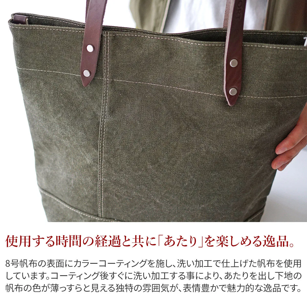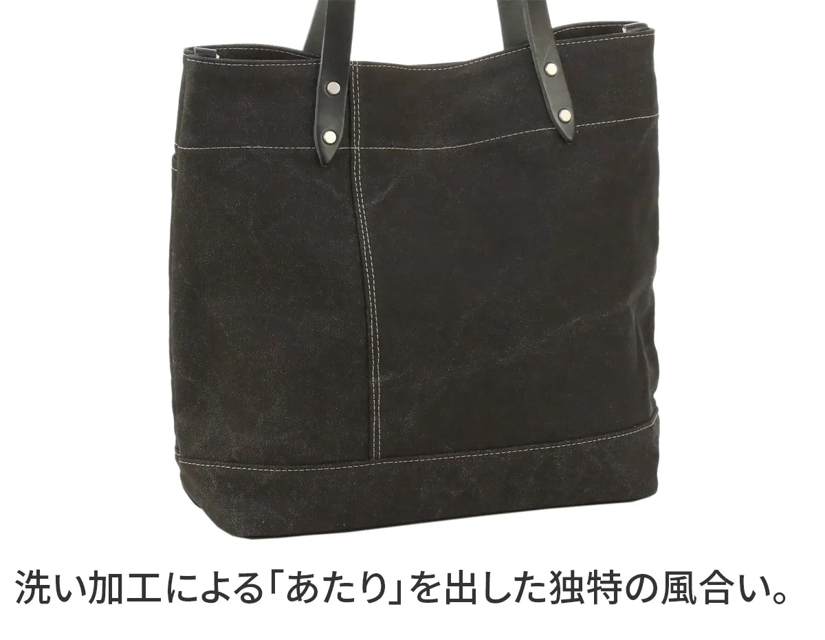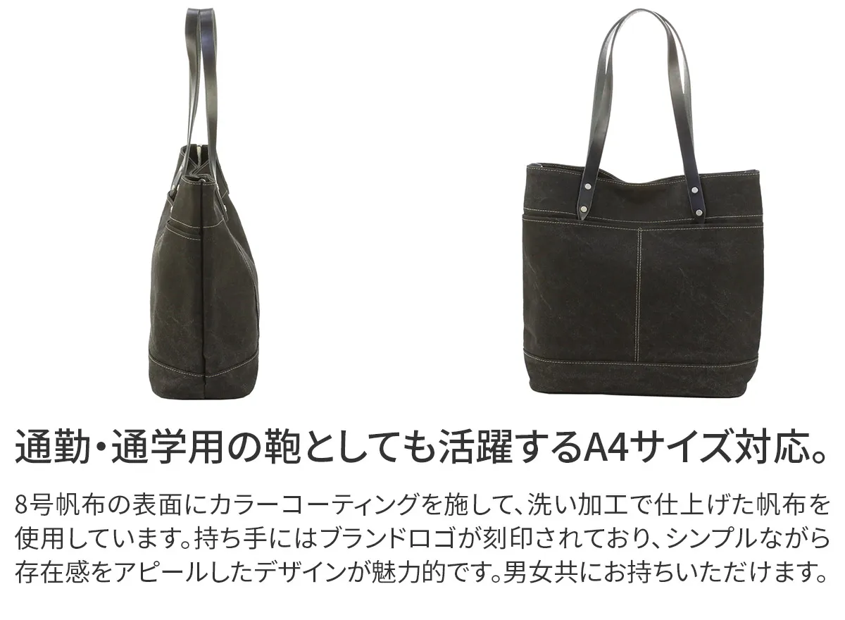 男女兼用でお使いいただけるシンプルなデザインですが、ハンドルやステッチラインがアクセントになっていて、独創性を感じられる逸品となっております。ハンドル部分にはブランドロゴが刻印されていたり、中作りの機能性など、繊細な作りが魅力的です。落ち着きのある色でコーデに合わせやすく、A4サイズ対応した大きさなので、オンオフ共に活躍してくれます。 8号帆布の表面にカラーコーティングを施し、洗い加工で仕上げた帆布を使用しています。 コーティング後すぐに洗い加工する事により、あたりを出し下地の帆布の色が薄らと見える独特の雰囲気に仕上げています。 中作りは小分けで収納していただける構造になっており、ボタンを留めると目隠しになる仕様になっています。