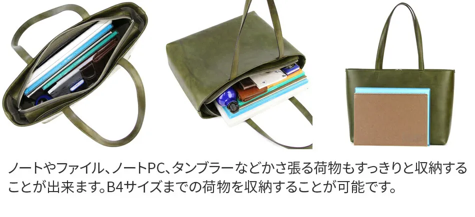 上質レザーを活かしたプレーンなフォルムは、あらゆるコーディネートによく馴染む。オン・オフ問わず使用できる汎用性の高さが嬉しいトートバッグ。 持ち手の内側には大振りのあおりポケットを配し機能も十分。B4サイズ対応で、沢山の書類等をざっくりと収納出来て便利です。 取り外し可能な底板付き。 使い込む程にエイジングを愉しめる、美しく上質なワキシングレザーを使用。手染めによる独特の表面のムラ感に、軽くしなやかな質感が魅力的です。
