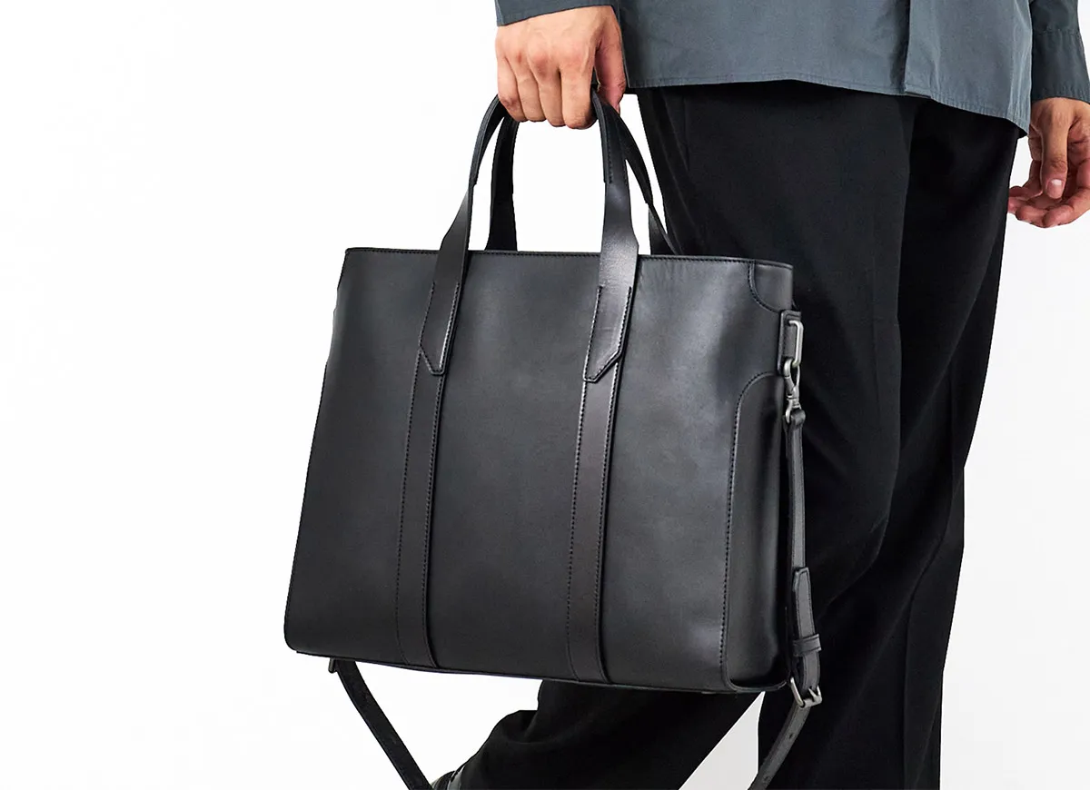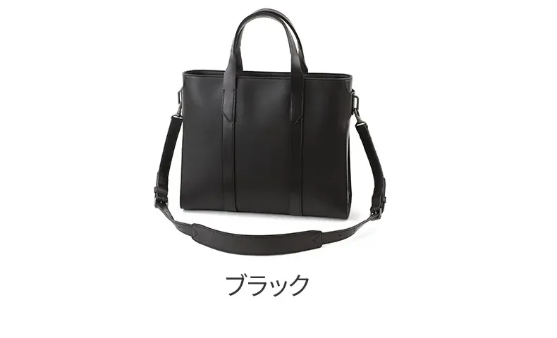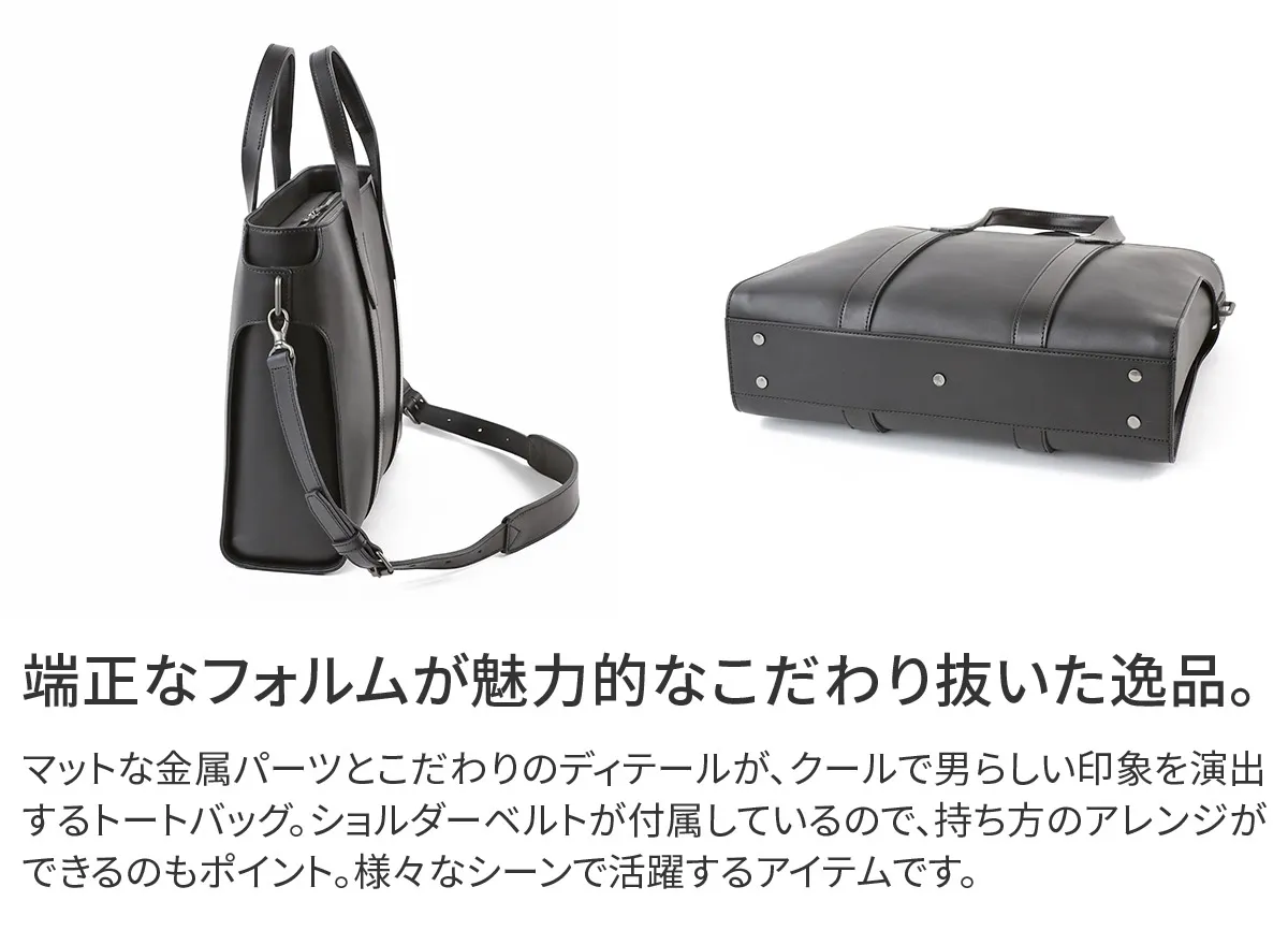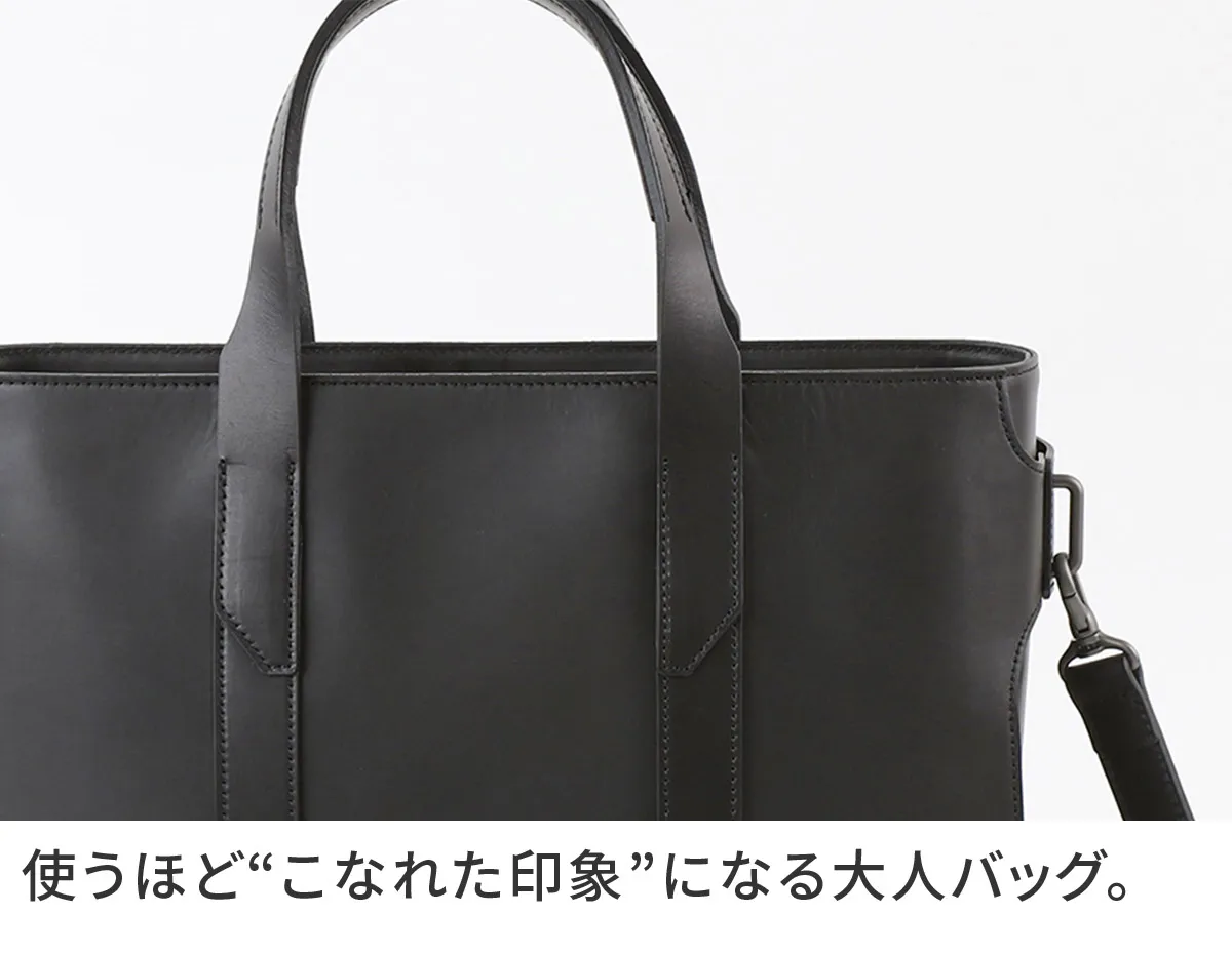 ベジタブルタンニンレザーのトートバッグ。 A4、14インチPCに対応するサイズです。 横に広がらないフォルムはスーツスタイルにも合わせやすく、サイドのまとめ方やパーツ使いといったディテールにこだわったトートバッグです。 2種類のレザーを使い分け、本体には使うほどに馴染むソフトヌメ革を、ストラップや部分パーツには国内では希少なピット鞣しのヌメ革を使用しています。 経年変化を楽しめる本格的なレザーと、マットな金属パーツがクールで男らしい印象を作ります。 ≪素材の説明≫ 「2種類のベジタブルタンニンレザーを使用」 本体の革には、ソフトヌメ革を使用。 ベジタブルタンニン鞣しの下地にじっくりとオイルを揉み込み、さらに染料染め段階でパラフィン(石蝋)を加えています。 それにより使うほどに馴染み、美しい艶と味わい深い経年変化が楽しめるレザーに仕上がっています。 ベルト、ハンドル、ショルダーストラップなどの耐久性を求められるパーツにはヌメ革(ピット槽鞣し)を使用。 植物樹脂タンニンが入った槽に長期間つけ込むピット鞣しによるこの本ヌメ革は、革本来の風合いが感じられる染料仕上げです。 使い込むと美しい艶が現れるとともに、ハードな使用環境でも耐える堅牢さを持ちます。 かっちりとしたフォルムの端正なトートバッグ。 2種類のレザーを使い分けたマテリアルが特徴的で、HERGOPOCHらしいこだわりのバッグに仕上がっています。 ハリのある革を使用しており使いはじめはかっちりとした印象ですが、使うほどに革に柔軟性が加わり“こなれた印象”が出てきます。 ビジネススタイルにもマッチするスマートなデザインなので、オンオフ問わず合わせられる逸品です。 ショルダーベルトが付属しており、スタイルにあわせてショルダー持ちも可能。