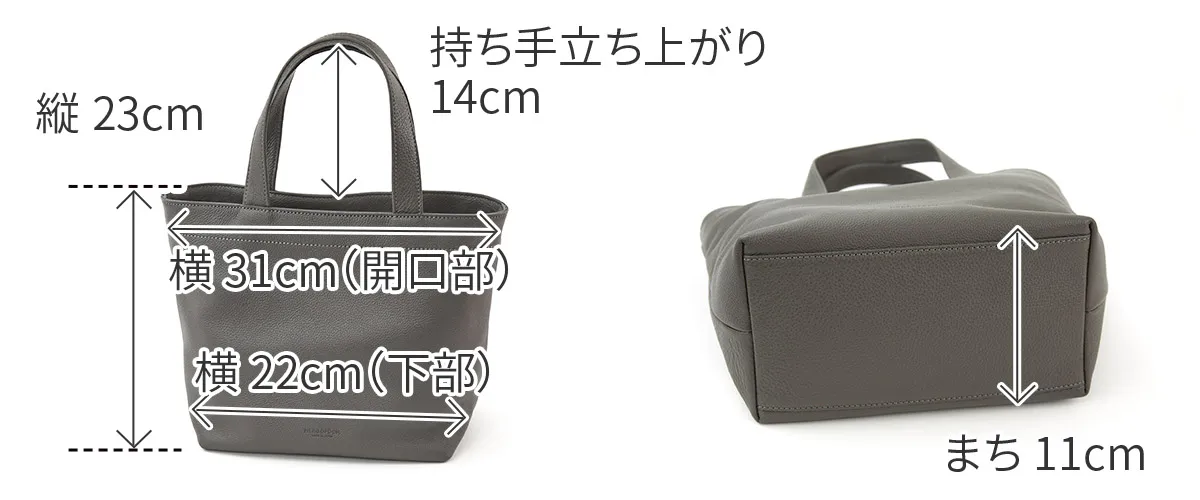 一般的にキャンバス生地のものをよく見かける所謂「カフェバッグ」をレザー仕様にアップデート。 くたっと感が魅力のソフトシュリンクレザーなので使用感は布帛のバッグのように軽く日常使いに最適なバッグです。 飽きのこないミニマルデザインとカラーでユニセックスにお持ちいただけます。 シンプルな台形フォルムのトートバッグです。 程よいサイズ感で気兼ねなくお使いいただけます。 オープン開閉で中身の取り出しもしやすく、様々なシーンで活躍します。