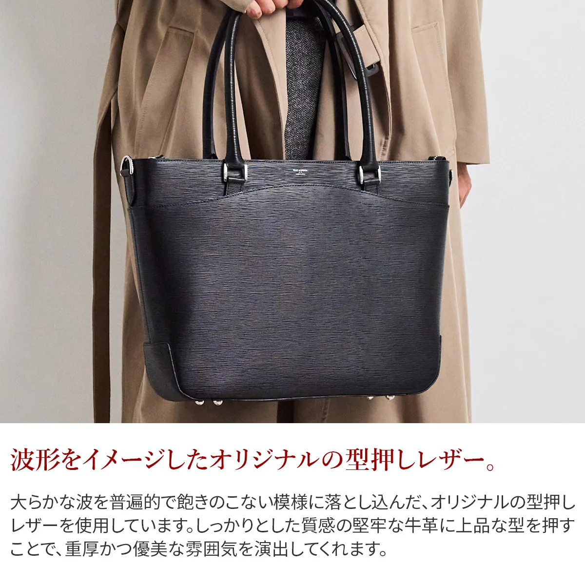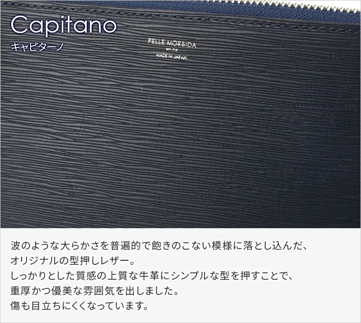 波のような大らかさを普遍的で飽きのこない模様に落とし込んだ、オリジナルの型押しレザー。 しっかりとした質感の上質な牛革にシンプルな型を押すことで、重厚かつ優美な雰囲気を出しました。 傷も目立ちにくくなっています。大人のスーツスタイルを格上げする仕上がりです。
