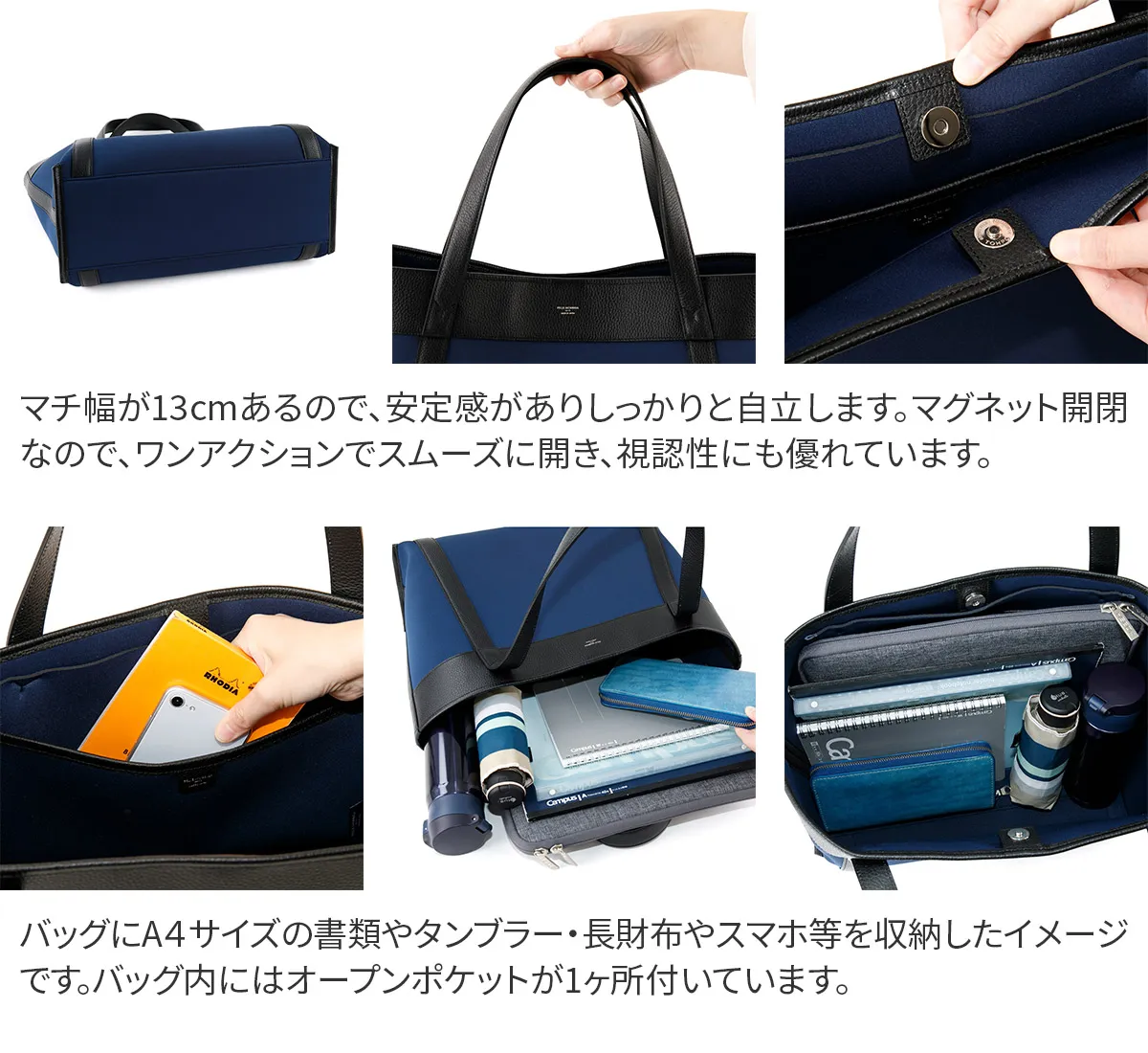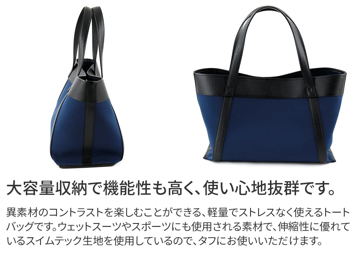 Cinque Terre チンクエテッレ ユネスコ世界遺産にも指定されたチンクエ・テッレの街並みや自然をイメージさせる、色鮮やかで軽快な春夏のシーズンコレクション。 伸縮性がよく手触りの良いスイムテック生地 ウェットスーツやスポーツにも使用される素材で伸縮性に優れているスイムテック生地を使用。 クッション性があるので取扱いに慎重なPC機器なども安心です。 スイムテックに使用されるSBRゴムはタイヤなどにも使用されるゴムなので、耐熱・摩耗性にも優れているのが特徴。 大容量収納可能なトートバッグです。 大きく開いて荷物が取り外しやすく、マチ幅もしっかりとあるので自立します。 異素材のバイカラーがアクセントでカジュアルながらエレガントさも残したトートバッグです。