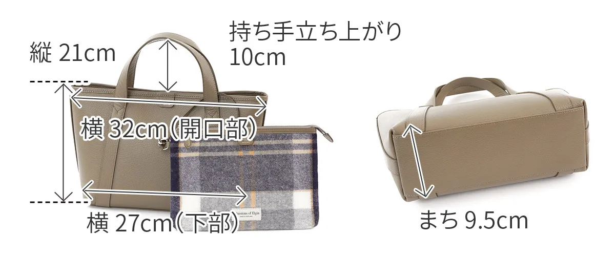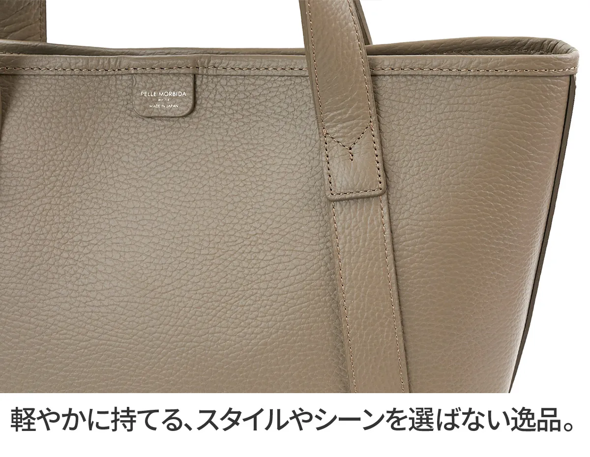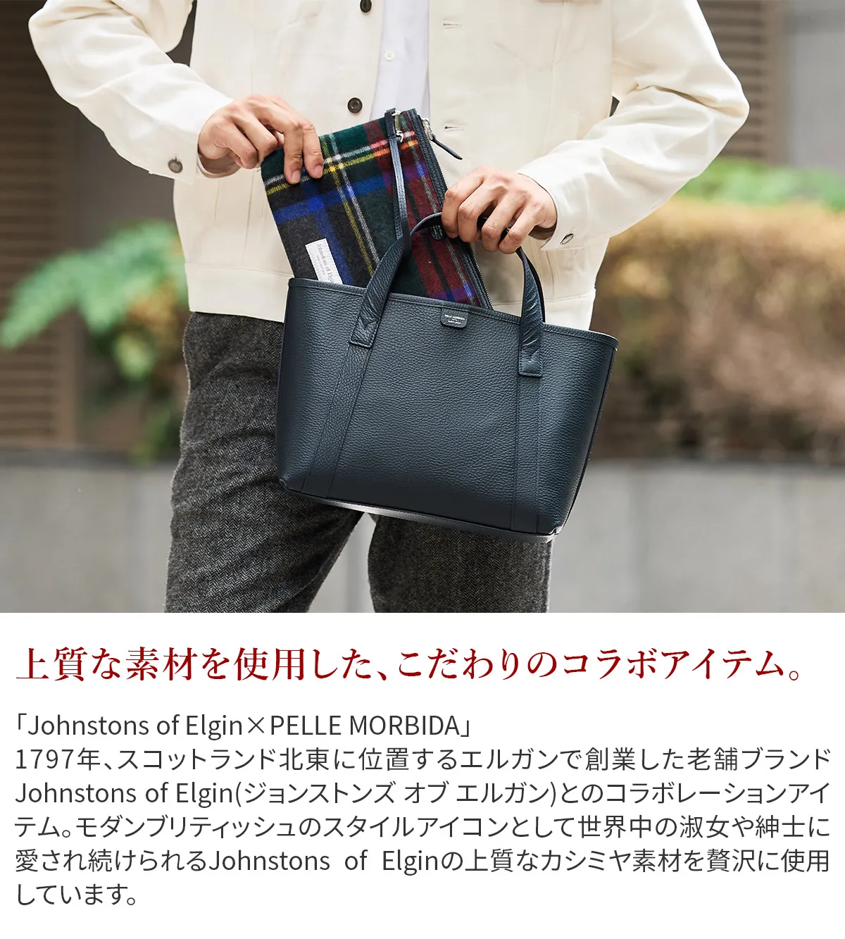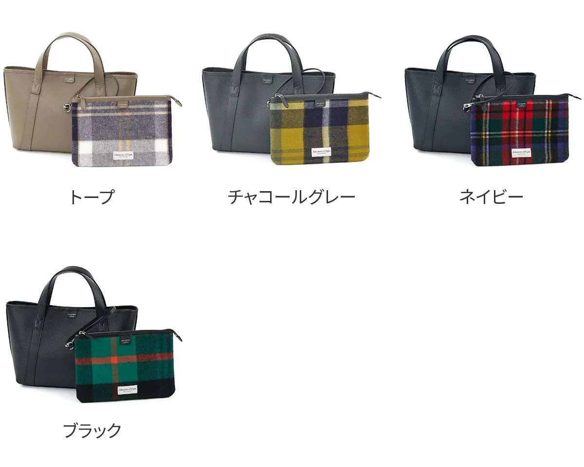 「Johnstons of Elgin×PELLE MORBIDA」 1797年、スコットランド北東に位置するエルガンで創業した老舗ブランドJohnstons of Elgin(ジョンストンズ オブ エルガン)とのコラボレーションアイテム。 モダンブリティッシュのスタイルアイコンとして世界中の淑女や紳士に愛され続けられるJohnstons of Elginの上質なカシミヤ素材を贅沢に使用しています。 《ジョンストンズについて》 “Johnstons of Elgin (ジョンストンズ)”は、1797年に創設されたスコットランド最古の生地メーカー。 最高品質の天然素材を使用し卓越したクラフトマンシップから、色褪せることのない美しさを持つ製品を生み出す。 主にカシミアなどの高級繊維を手がけており、ストールやマフラー、手袋などのアイテムを展開。 その品質の高さから世界有数のラグジュアリーブランドに生地を提供しており、過去にはエルメスのカシミア製品を手がけたこともある。 Johnstons of Elginで定番のカシミヤ生地のポーチを付属させ、 シンプルなトートバッグにJohnstons of Elginらしいタータンチェックが映えるデザインです。 また内装のポケットにもカシミヤ生地を使用し、さりげない上質を感じさせます。 レザーはシュリンク風型押しレザーを採用、柔らかな風合いながらも自立性を兼ね備えています。 加えて撥水加工を施しているので、雨の日も安心して使用できます。 内装のメイン素材にはマイクロライトスウェードを使用し、高級感がありながらも耐水性、耐摩耗性にも優れています。