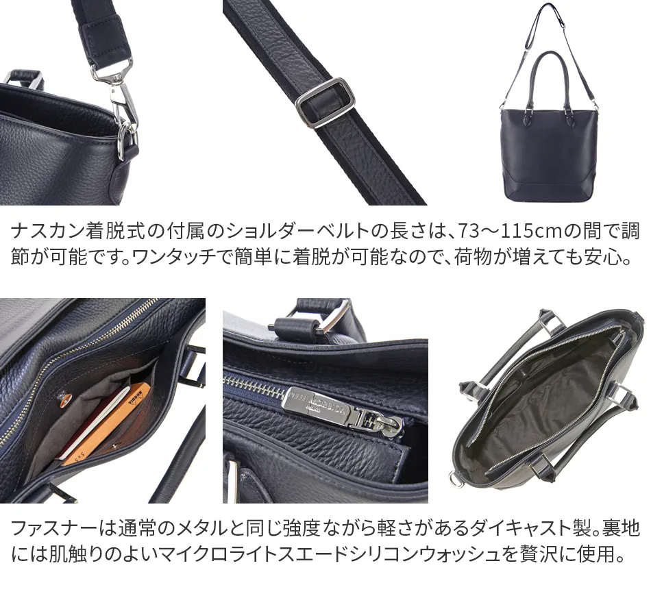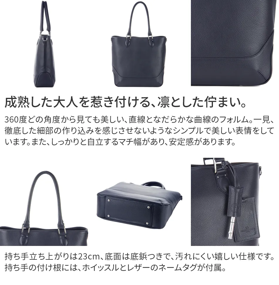ビジネスにデートに、ときには旅行にと様々なシーンで活躍するトートバッグ。 このトートバッグは持ったときのバランスが絶妙に美しい縦型トートバッグ。 柔らかい独特のフォルムでありながら自立する姿が、背筋の伸びた美しい立ち姿を彷彿とさせます。 書類も楽々入るので、ビジネスシーンでもエレガントに活躍するアイテムです。 ペッレ モルビダの代名詞でもある柔らかな風合いのシュリンクレザー。 革漉きなど、幾度も試作を重ね、シボ立ちを保ちつつ軽量な革を開発。 均一で綺麗なシボが優美な風合いを醸し出します。 柔らかさを表現しつつも、しっかりとしているため長く使えます。
