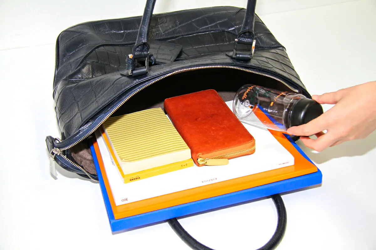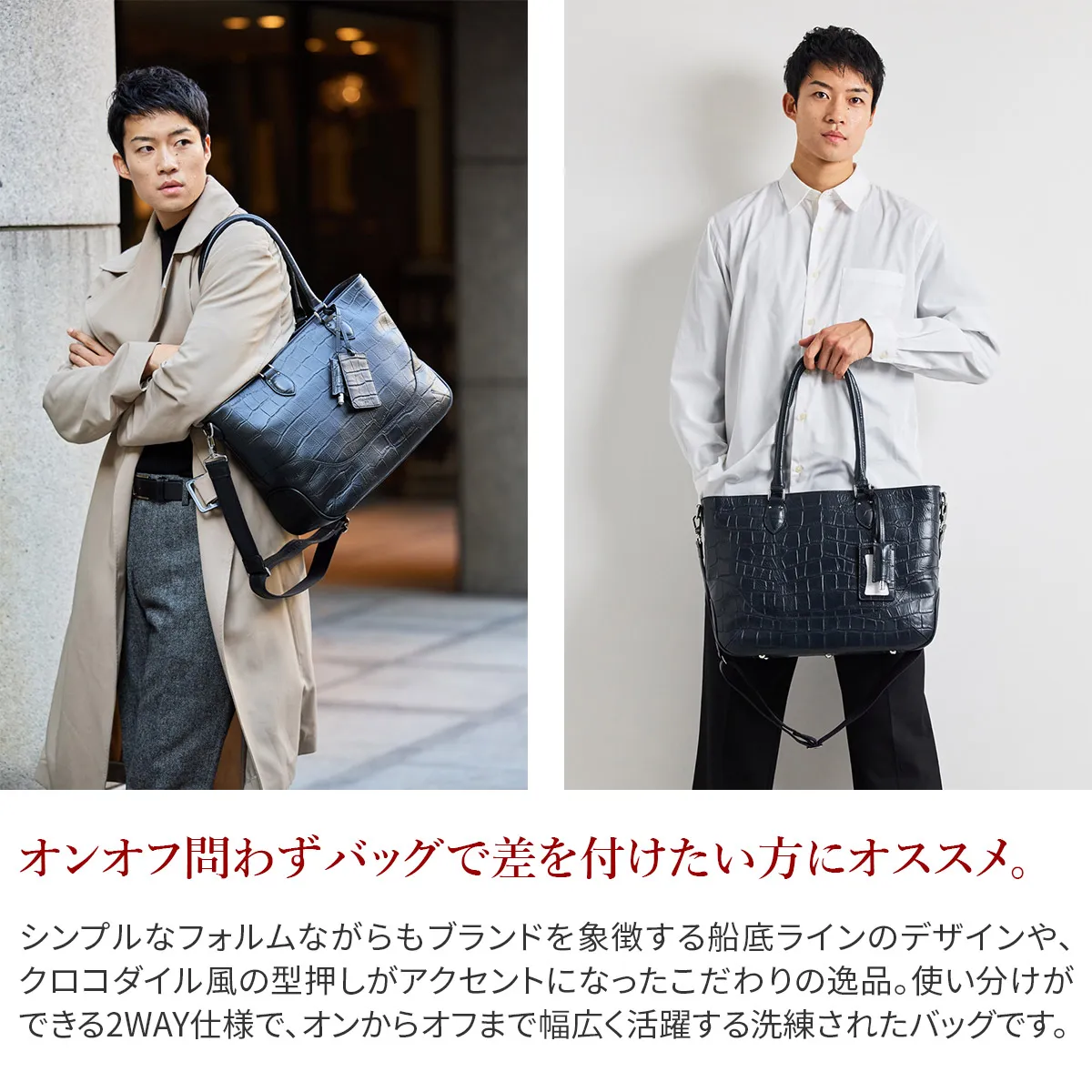 シンプルなフォルムながらもブランドを象徴する船底ラインのデザインや、クロコダイル風の型押しがアクセントになったこだわりの逸品。使い分けができる2WAY仕様で、オンからオフまで幅広く活躍する洗練されたバッグです。 通常のラインナップのシュリンクレザーの上からさらに型押しの一工程を施したモデル。型押しは堅くなりがちなのだが、シュリンクレザーに型押ししているので柔らかく手に馴染みやすいのが特徴となります。