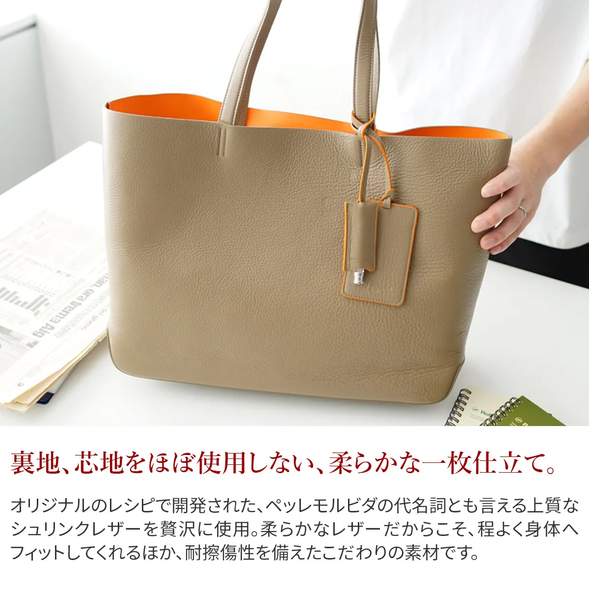 柔らかな風合いのダブルフェイスレザーを使用したトートバッグです。内装がバイカラーになっており、オールレザーながらも軽やかな印象です。素材は細やかなシボ型を押した上質なシュリンク風レザーに仕上がっています。 オリジナルのレシピで開発された、ペッレモルビダの代名詞とも言える上質なシュリンクレザーを贅沢に使用。柔らかなレザーだからこそ、程よく身体へフィットしてくれるほか、耐擦傷性を備えたこだわりの素材です。