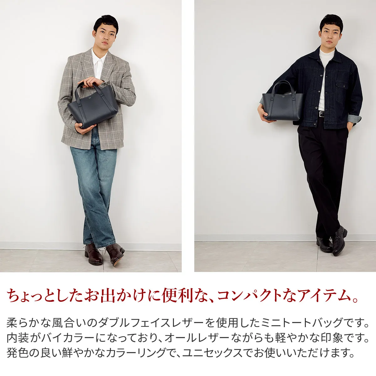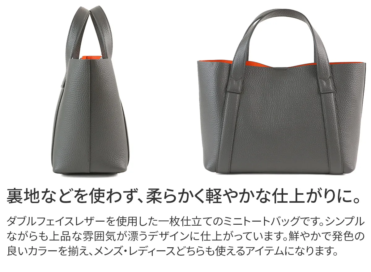 柔らかな風合いのダブルフェイスレザーを使用したミニトートバッグです。内装がバイカラーになっており、オールレザーながらも軽やかな印象です。発色の良い鮮やかなカラーリングで、ユニセックスでお使いいただけます。 Tela Marina(テーラマリーナ)シリーズは、そのころのLibornoの港にも碇泊していたであろう船舶の帆の生地をイメージしたファブリックで仕上げた軽快さとトラディショナルな上品さを表現したコレクション。背筋を伸ばして歩きたくなるアイテムです。 コンパクトながらB5サイズまでは収納できる大きさ、開口部もマグネットボタン式で間口は広く開きお財布や携帯電話など使用頻度の多いものは取り出しやすい仕様になっております。