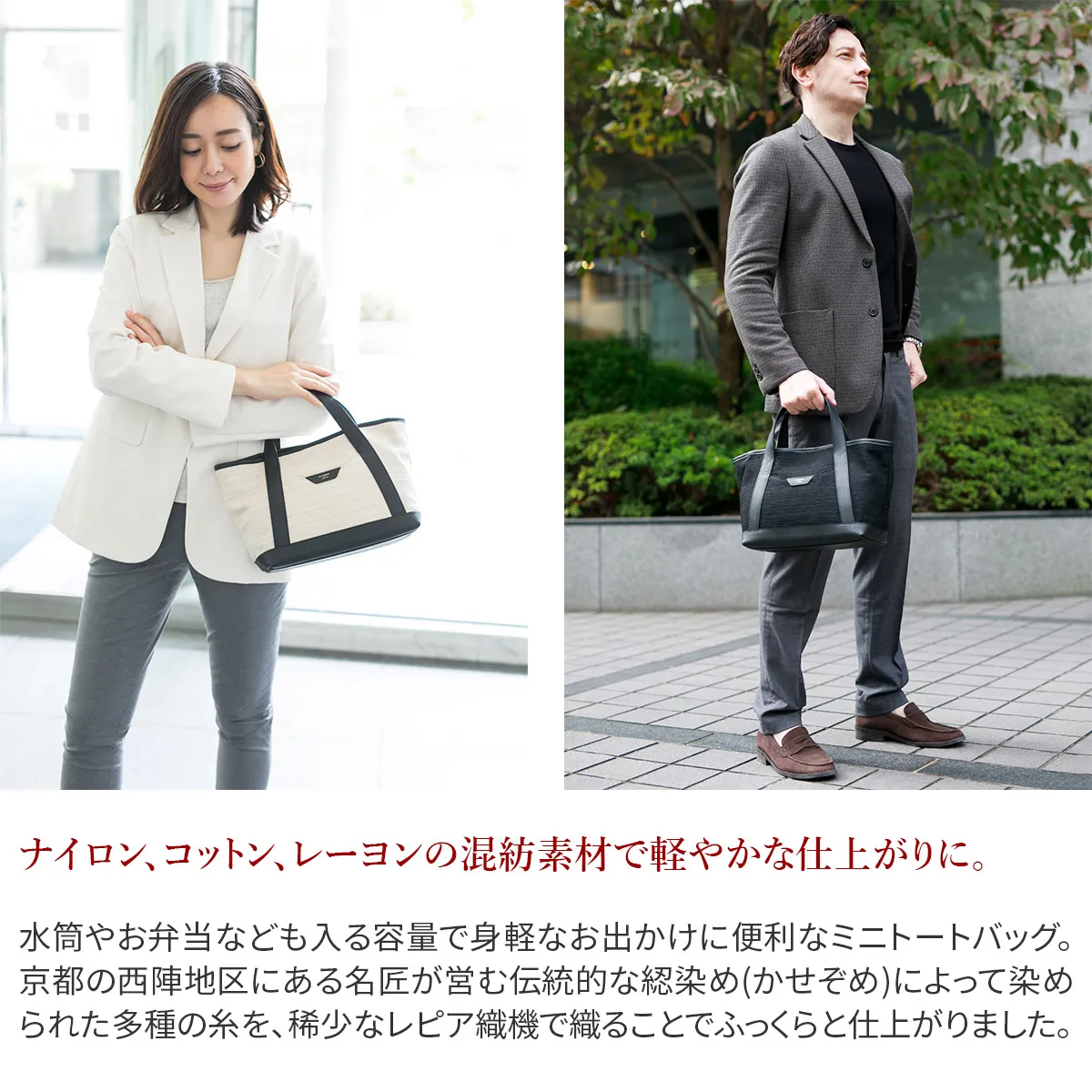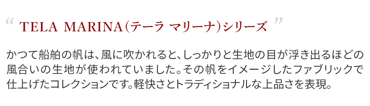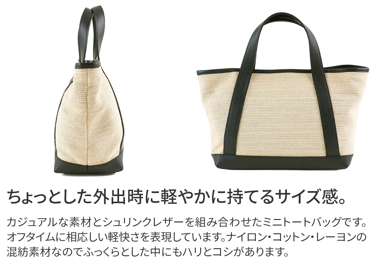 水筒やお弁当なども入る容量で身軽なお出かけに便利なミニトートバッグ。京都の西陣地区にある名匠が営む伝統的な綛染め(かせぞめ)によって染められた多種の糸を、稀少なレピア織機で織ることでふっくらと仕上がりました。 Tela Marina(テーラマリーナ)シリーズは、そのころのLibornoの港にも碇泊していたであろう船舶の帆の生地をイメージしたファブリックで仕上げた軽快さとトラディショナルな上品さを表現したコレクション。背筋を伸ばして歩きたくなるアイテムです。 コンパクトながらB5サイズまでは収納できる大きさ、開口部もマグネットボタン式で間口は広く開きお財布や携帯電話など使用頻度の多いものは取り出しやすい仕様になっております。