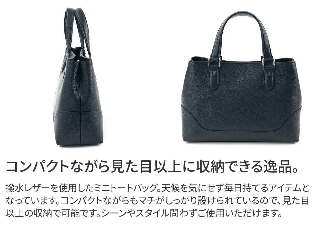 撥水レザーを使用したミニトート。 男女問わず、カジュアルバッグの定番となったミニトートバッグに、撥水レザーを使用したバリエーションが登場。 スタイリングに合わせやすいカラーバリエーション豊富な全6色。 シンプルなのでジャケットスタイルにもカジュアルにもフィットしたデザインです ちょっとしたお出掛けや旅行時のサブバッグとしておすすめの逸品。 500mlのペットボトルもちょうど入るサイズで、コンパクトながら見た目以上の収納力も充実しています。