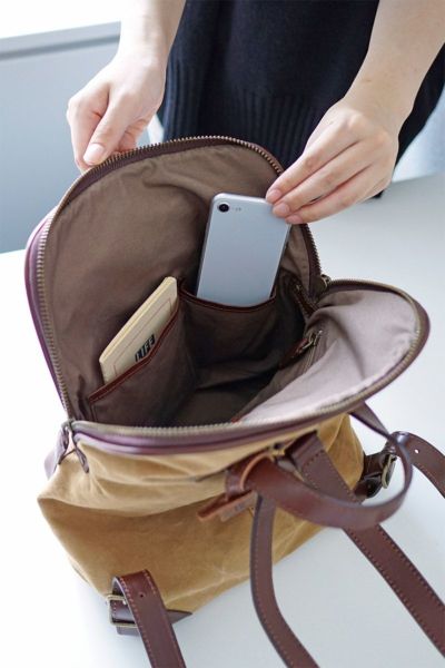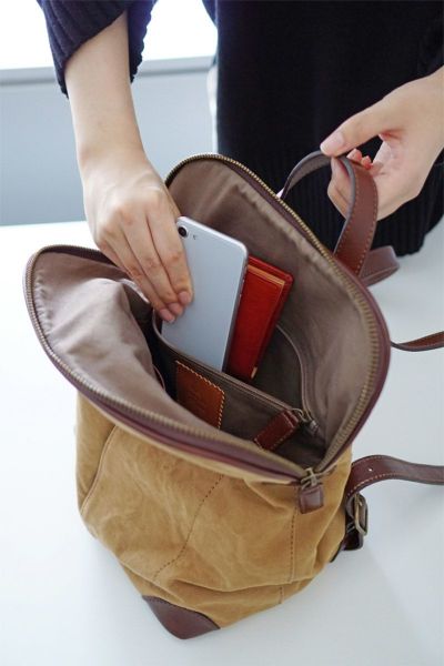素材には、ヌメ革などに使われるタンニンで染め、洗いをかけ深みを増した国産9号帆布を使用しています。洗いをかける事により1度濡れた糸が乾く際に引き締まり生地に強度が増します。また、洗うことにより色の深みと優しい表情が特徴的な素材です。 底マチがしっかりとあるコンパクトなリュックになります。ソフトな帆布とヌメ革の異素材コンビが好相性なデザインです。下部から上部にかけてマチ幅が細くなる構造なので、お持ちいただいた際、スマートな印象です。バッグ正面のファスナーポケットがデザインの一部となって、個性のある逸品に仕上がっています。