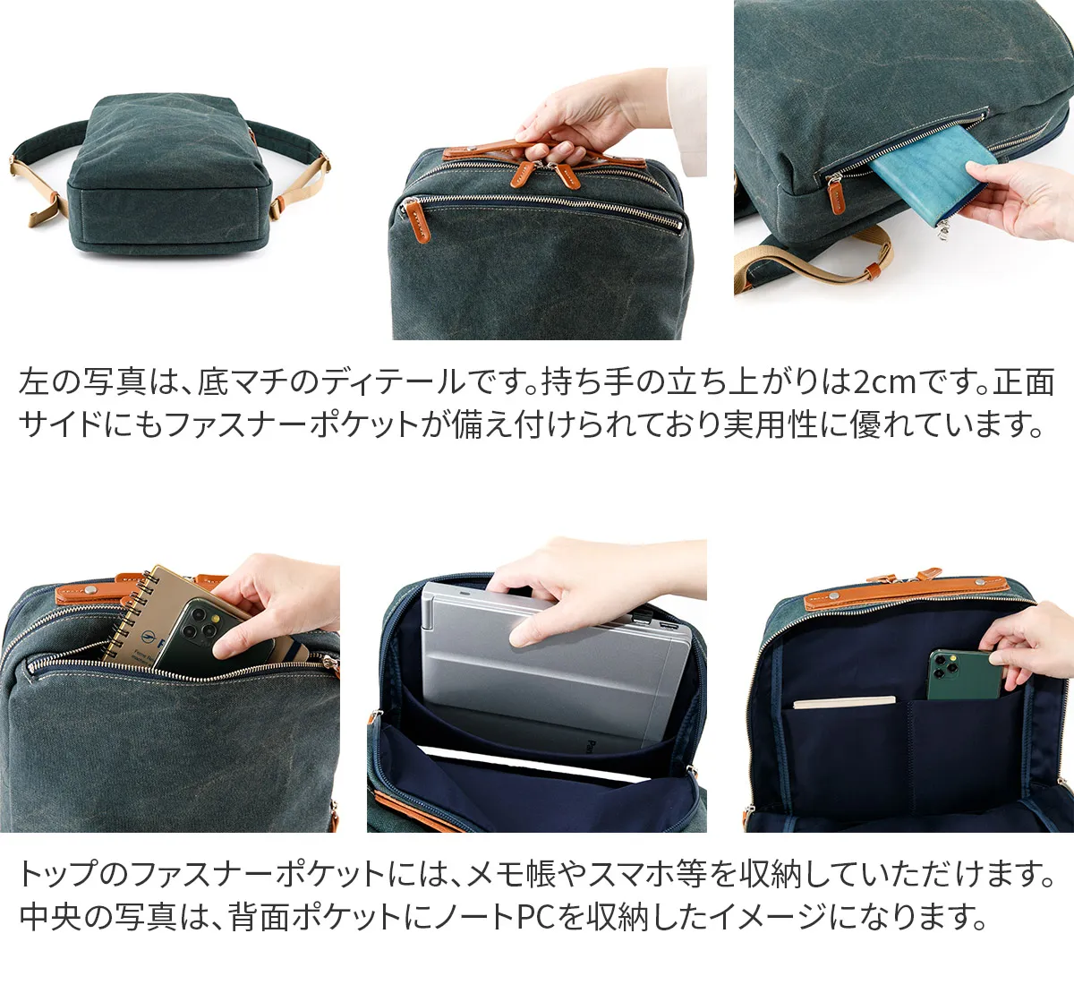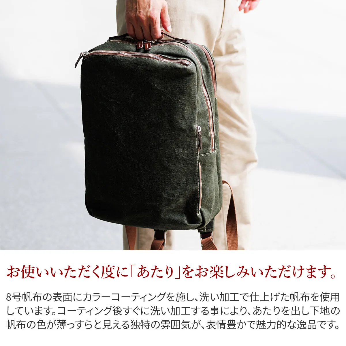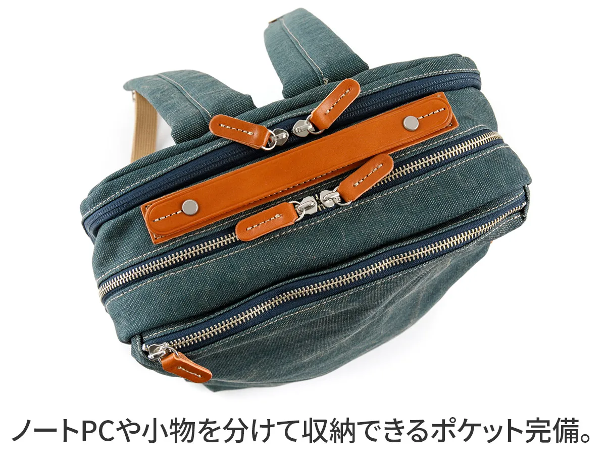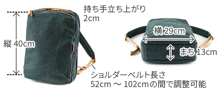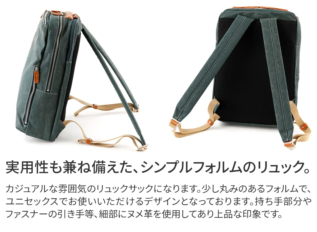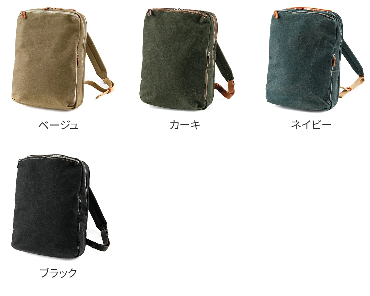8号帆布の表面にカラーコーティングを施し、洗い加工で仕上げた帆布を使用しています。 コーティング後すぐに洗い加工する事により、あたりを出し下地の帆布の色が薄らと見える独特の雰囲気に仕上げています。 B4サイズのスクエア型デイパックが登場。風合いのある8号帆布とヌメ革を使用しています。 ハンドルやファスナーの引き手にヌメ革を使用する事でカジュアルながら上品な印象に仕上がっています。 背面ポケットには15インチPC対応の独立収納が配置され機能的な作りになっております。 ビジネスシーンからプライベートまでユニセックスでお使いいただけるデザインとなっております。