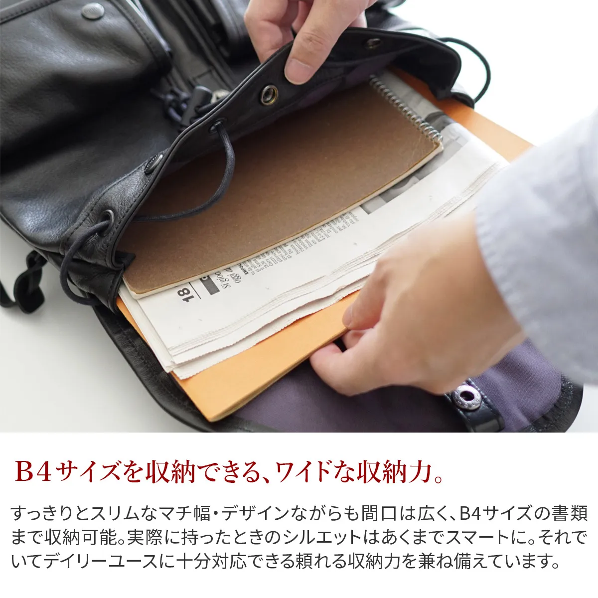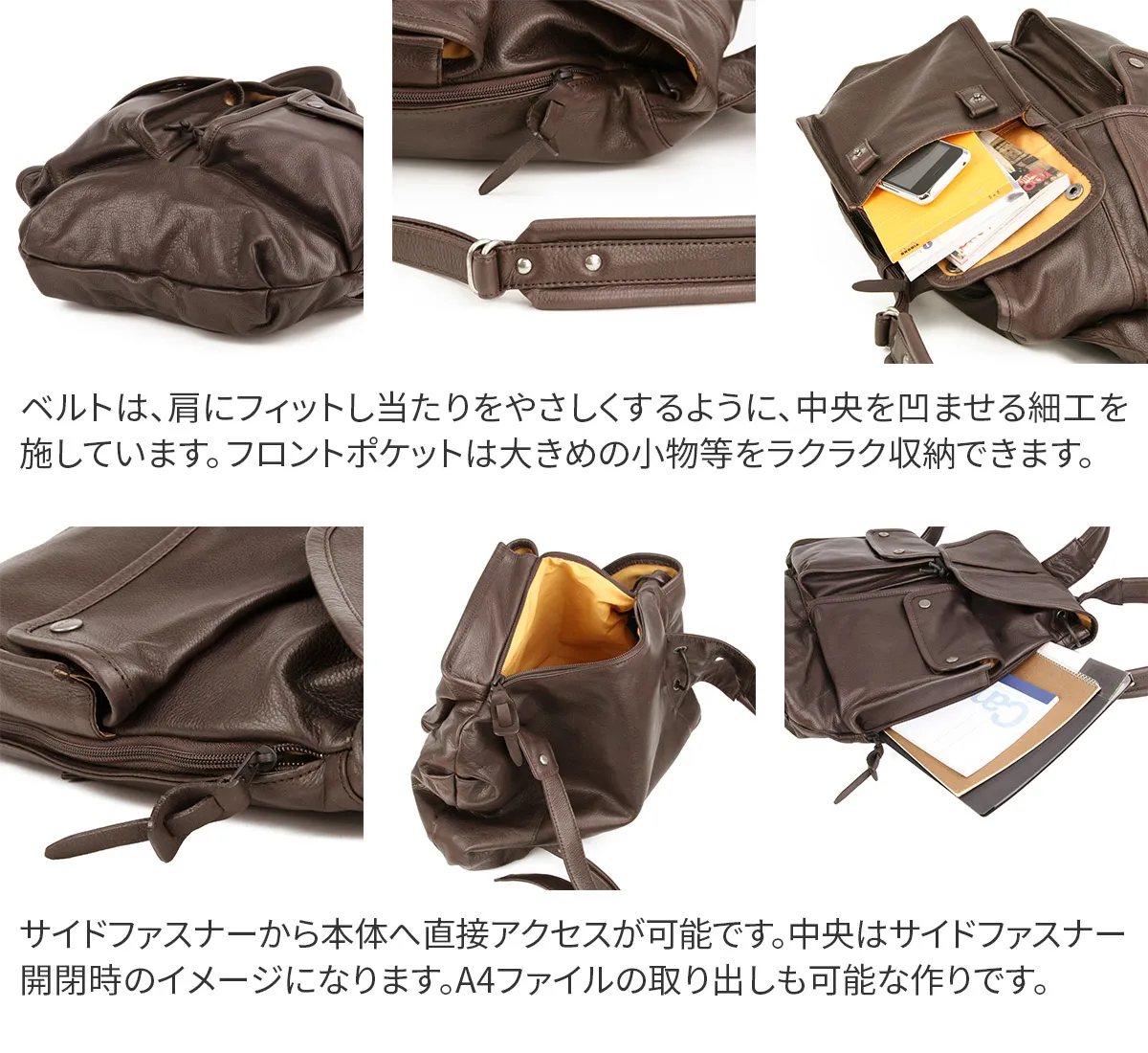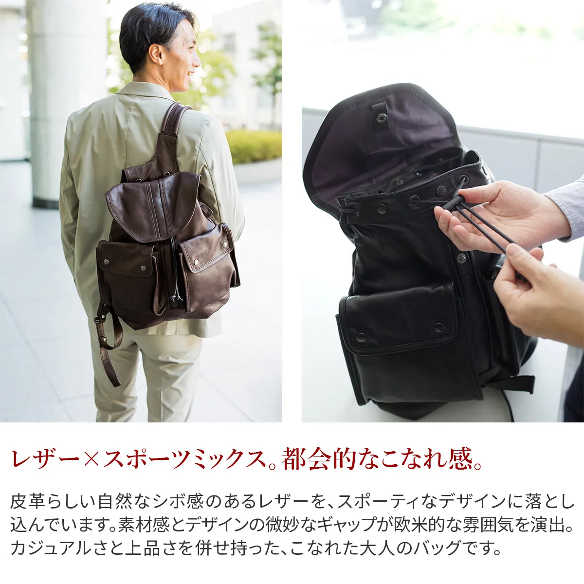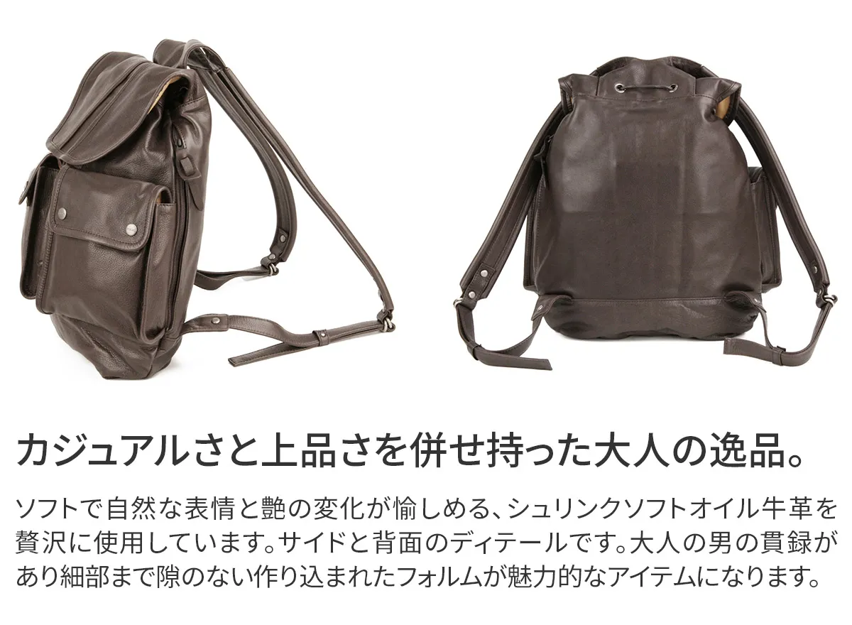 素材である牛革は、肌理が細かく 繊維が締まった牛革に自然なシュリンク加工を施し、滑らかで ふんわりと弾力のある手触りに仕上げた日本製の牛革です。 本シュリンクは皮革繊維自体をゆるませて出すシボなのでソフトで自然な表情があり、手触りも滑らかです。もちろん皮革特有の艶や変化も楽しめます。 あえてこの皮革を使い、スポーティなデザインにはめることで、素材感とデザインの微妙なギャップをつくり欧米的な雰囲気を出しています。性別、スタイルを問わず大人のカジュアルなコーディネートが楽しめます。