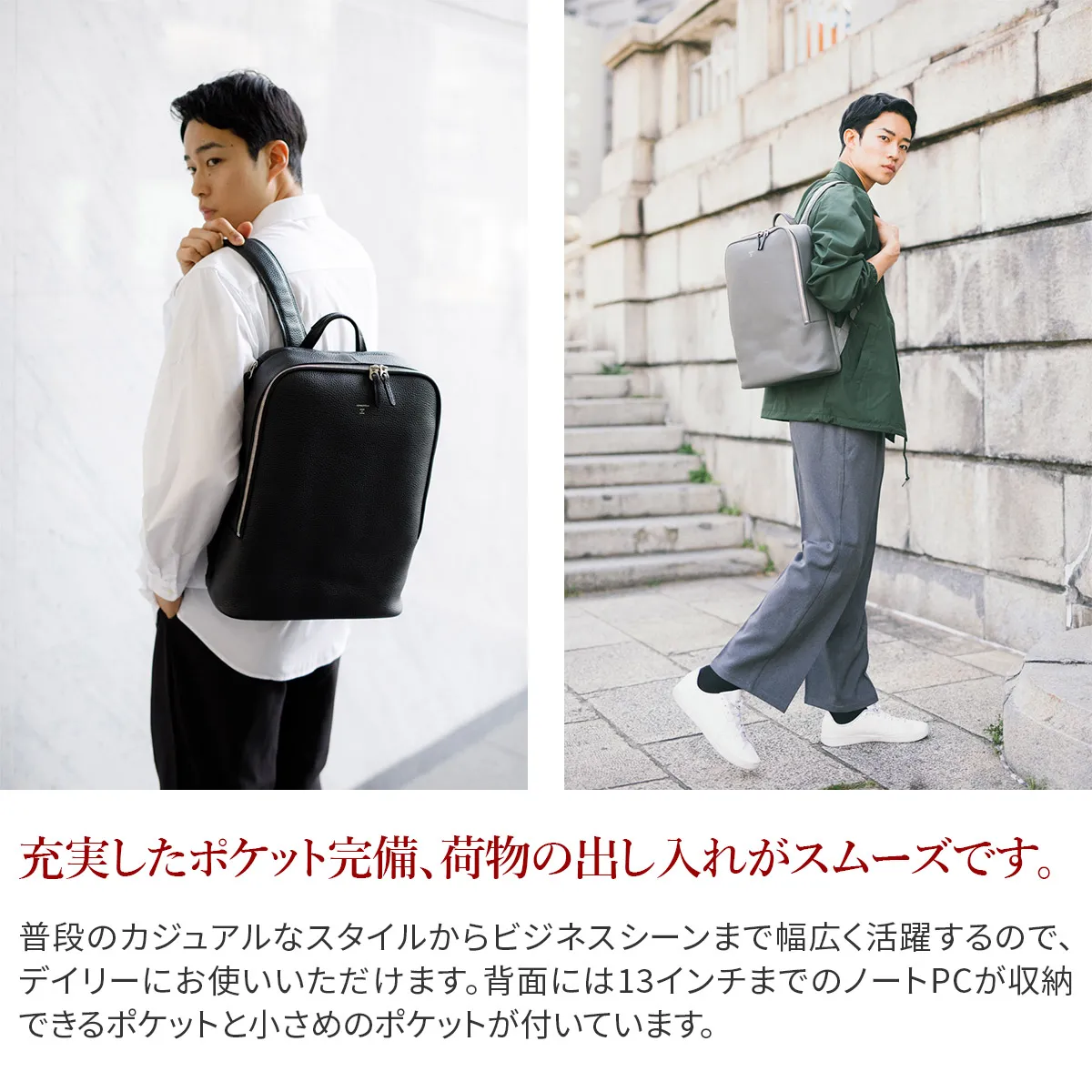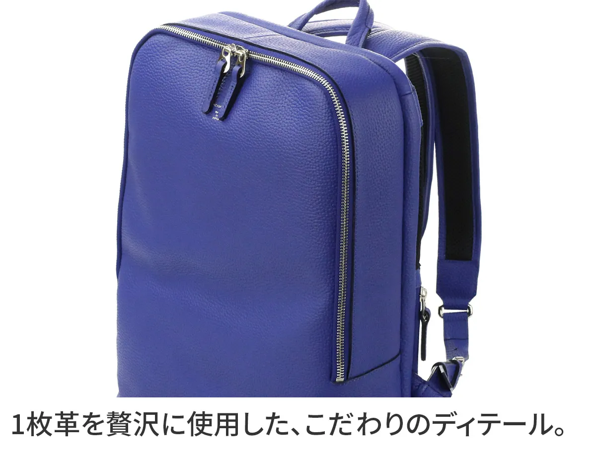 美しいシボ感が印象的な、高級感漂うバックパックになります。 端正かつ堂々たる佇まいのフォルムに仕上がっており、ビジネスから普段使いまで、コーディネートに一つ上の風格を与えてくれるデザインです。 ディテールにもこだわりを感じる、洗練された逸品に仕上がっています。